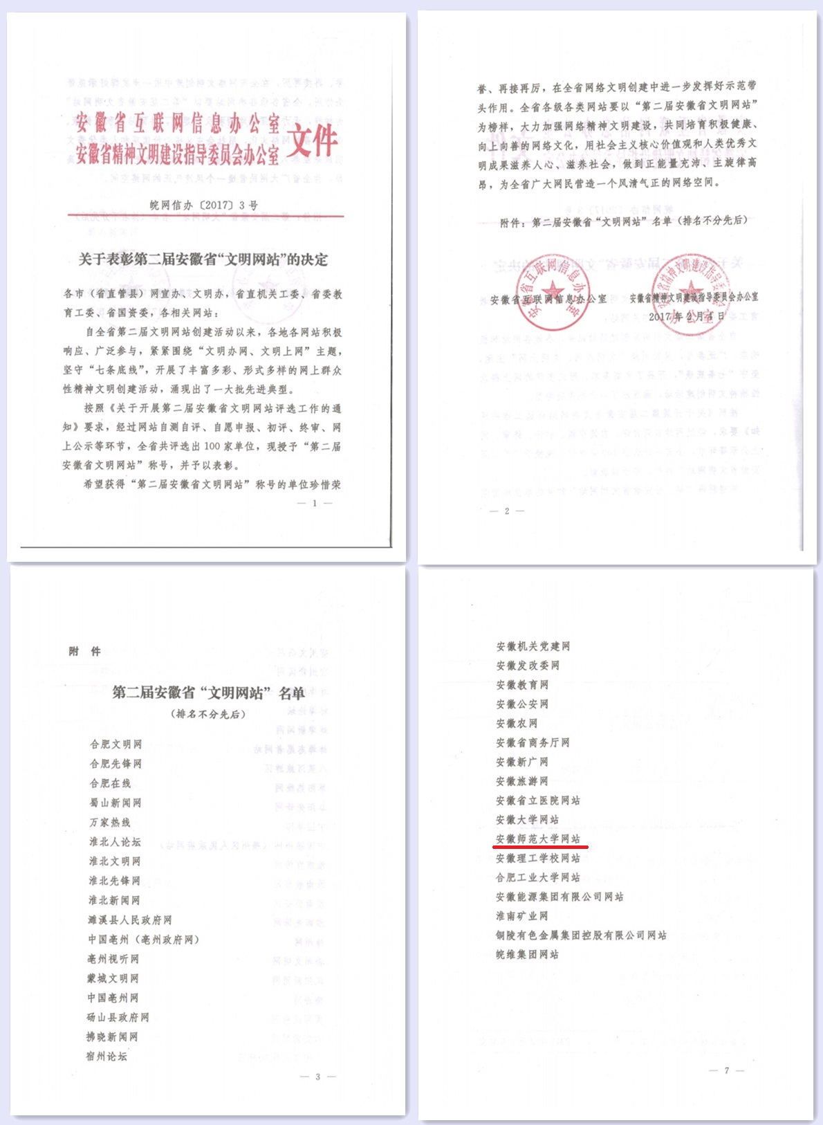 “安徽省文明网站”称号是互联网领域的省级荣誉,是反映互联网站精神文明建设、日常管理水平和社会责任的综合性奖项。此次评选标准涉及加强社会主义核心价值观教育、规范网站建设和管理、开展网络文明创建活动、净化网络文化环境、推动网站行业自律、提高网站文明服务水平等方面,经自测自评、自愿申报、初审终审、网上公示等环节,专家组最终评选出100家文明网站予以表彰(全省共有三家高校荣获这一称号)。