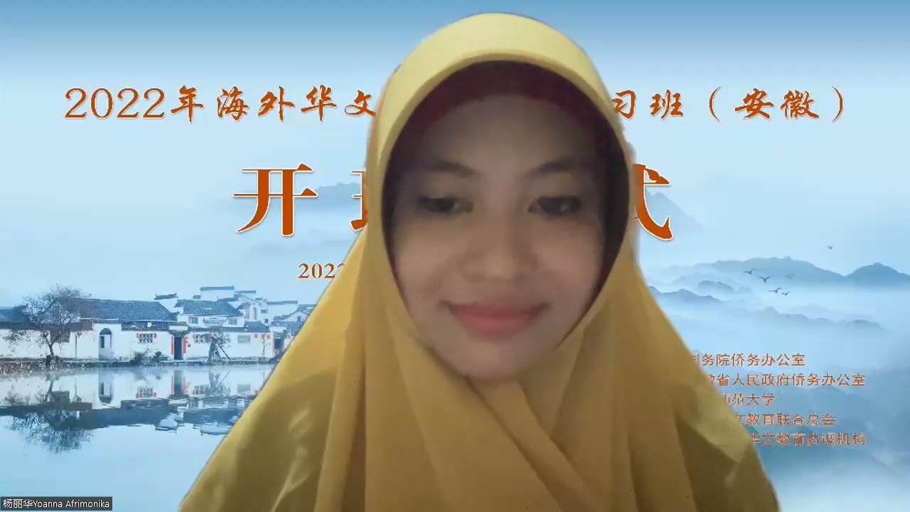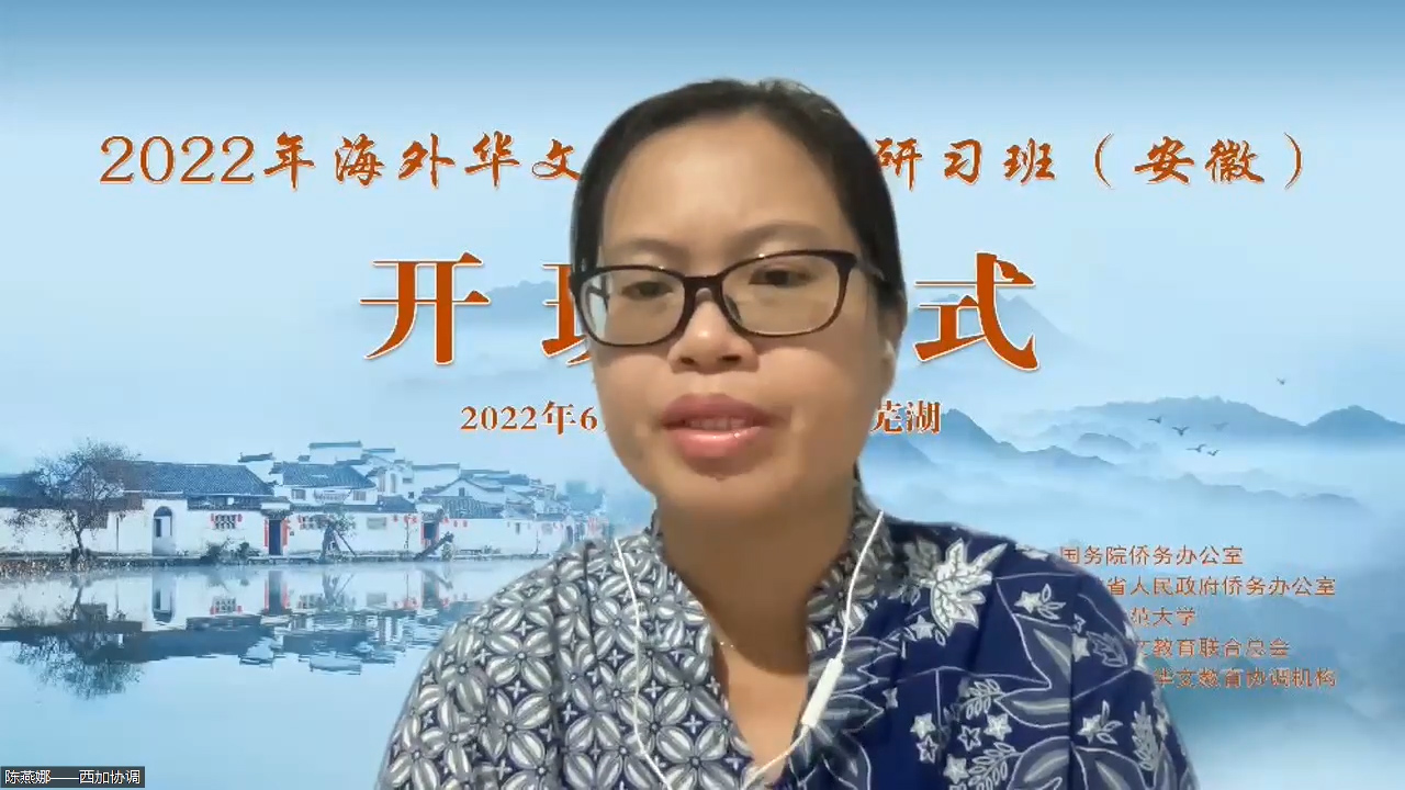 印尼西加华文教育协调机构副主席陈燕娜在发言中表示,非常感谢安徽省侨办的大力支持,为印尼的华文老师提供了充电的平台。也感谢安徽师范大学精心组织优秀师资团队,从华文语言能力、教学课堂管理、智慧教学技术、教师综合素养等方面提升印尼华文教师的综合水平。她表示,印尼学员们一定尽力激发学习潜能,珍惜此次研习班培训机会,不断提升个人素养。