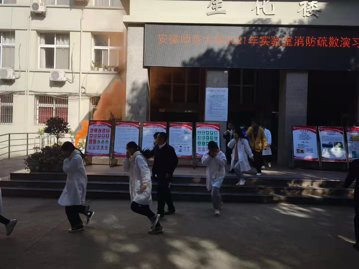 本网讯(保卫处)为进一步加强学校实验室安全教育管理,强化重点领域消防安全“四个能力”和“五实N岗”建设,切实增强师生在科研、教学实验操作偶遇突发火情或燃爆时,扑灭初起火灾与及时疏散的能力,11月9日-10日,分别在花津校区、赭山校区举行2021年实验室消防疏散演习,校党委常委、副校长陆林,弋江区、镜湖区消防救援大队、高校园区派出所及学校相关职能部门和师生共2000多人参加此次演习活动。