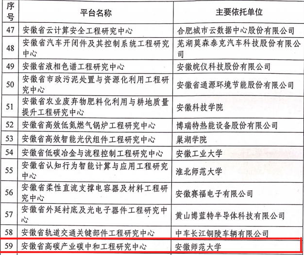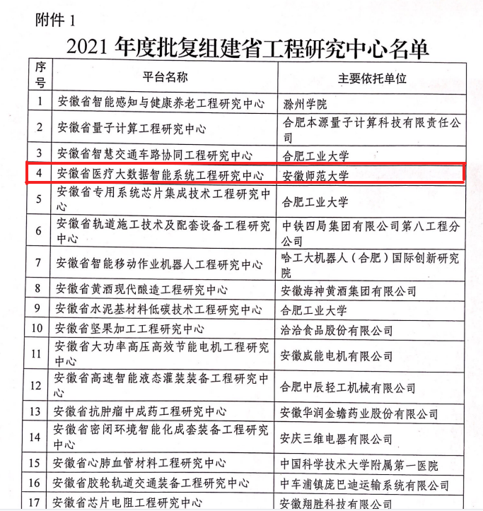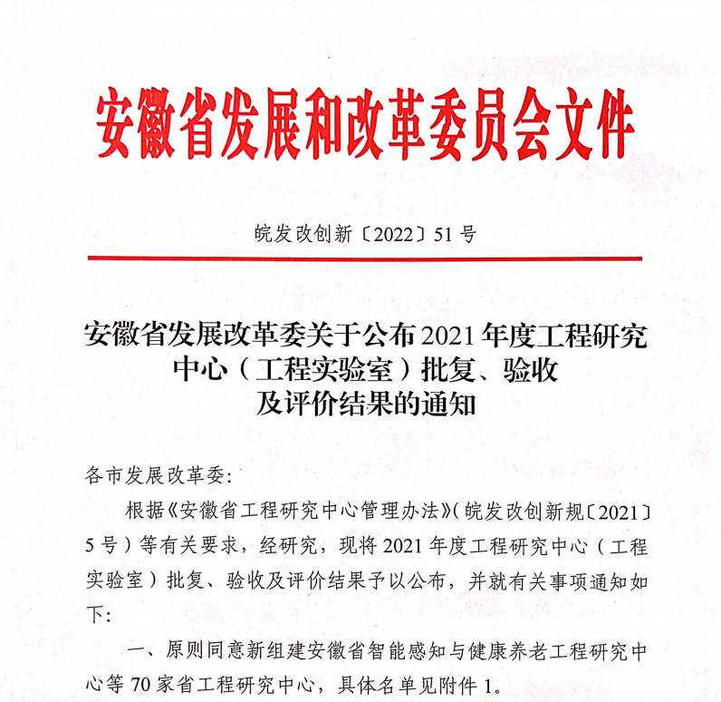 近日,安徽省发展和改革委员会发布了《安徽省发展改革委关于公布2021年度工程研究中心(工程实验室)批复、验收及评价结果的通知》(皖发改创新〔2022〕51号),同意组建70家省工程研究中心。我校安徽省医疗大数据智能系统工程研究中心和安徽省高碳产业碳中和工程研究中心获批组建。