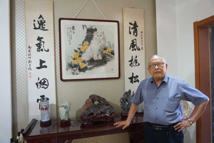 时至初夏,阳光透过绿叶徐徐洒落门前,“清风挺松柏,逸气上烟霞。”一副对联苍劲有力为炎热的夏日增添了几分微凉。屋内几乎占据了整个墙面的书柜错落有致地摆满藏书,壁上的字画出处考究,意境深远,博古架上的石头陈列形态各异,光滑如玉,在朱典淼老先生的家里,到处充满着浓浓的翰墨香味。