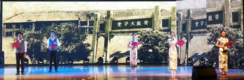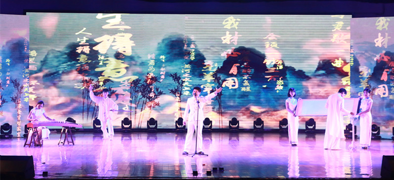 站在岁月桥头,跨越历史洪流。由校大学生艺术团合唱队表演的开场节目《安徽师范大学校歌》响彻花津大礼堂,悠扬的歌声里饱含着当代师大学子对母校的深情与祝福,一曲欢快灵动的《古丈茶歌》将一幅幅隽永的美好生活画卷呈现在观众的眼前耳际。漫漫光辉史,淳淳民族情;雄关重头越,坚志始不渝。《秋瑾》《甲午》《深海》等节目重温民族危难之际有志青年和仁人志士的责任与担当,真实生动地展现出师大青年厚重的家国情怀。《祖国一首唱不完的恋歌》《驻在90年的历史关口》《我心彷徨即我皖梦乡》等节目回应时代的召唤,时空流转间满含对师大九十华诞的深情祝福和对家乡与祖国的眷恋之情。《将进酒》《沉香救母》等节目弘扬与传承中华民族优秀传统文化,表达了当今学子对真善美的不懈追求。《甘南的呼唤》《祖国在上》《平凡的世界之信念》《父亲写的散文诗》等节目抒发了对青春理想的热情赞颂,召唤青春学子为理想不断奋发向上,砥砺前行。“黄河落尽走东海,万里写入襟怀间”,第五届安徽省大学生艺术展演获奖作品、新传学院选送的表演节目《喊黄河》则展现了不同于温柔水乡的豪迈与旷达。一声声低吟、一句句呐喊,都展现了不一样的大美中华,也将现场的气氛再次带入高潮。最后,大赛在由大学生艺术团表演的舞蹈《中国范》的欢歌与热舞中落下帷幕。