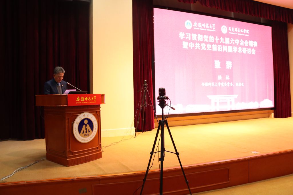 1月3日下午,由安徽师范大学马克思主义学院、《高校辅导员学刊》编辑部主办的“学习贯彻党的十九届六中全会精神暨中共党史前沿问题学术研讨会”以线上线下相结合的方式成功举行,这是我校举办的“学习贯彻党的十九届六中全会精神”前沿高端学术论坛系列的第四期。来自清华大学、中国人民大学、北京师范大学、南开大学、山东大学、兰州大学、大连理工大学、华南师范大学、郑州大学、南京航空航天大学、西北师范大学、贵州师范大学、安徽师范大学等高校的专家学者,以及《中共党史研究》《毛泽东邓小平理论研究》《教学与研究》《安徽日报》等学术期刊编辑部的负责人应邀参会并作主旨发言。安徽师范大学马克思主义学院院长、《高校辅导员学刊》编辑部主任姚宏志教授主持研讨会开幕式,校党委常委、副校长陆林教授致开幕辞。来自全国各高校、科研院所的1500余名专家学者和研究生通过线上方式参加了会议。