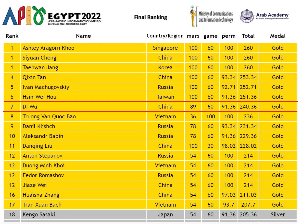 APIO是一个面向亚洲和太平洋地区的在校中学生的信息学奥林匹克竞赛,是信息学竞赛中核心赛事之一。此次主办国家是埃及,中国区活动由中国计算机学会主办、南京外国语学校承办,于5月26日-30日在南京顺利举行。选手分为A、B两组,A组成绩排名前6位的选手代表中国队参加主办国的成绩统计和国际奖牌竞争。APIO获奖比例参照当年全球国际信息学奥林匹克竞赛(International Olympiad in Informatics,简称IOI)。