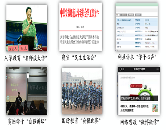 五年来,为了让大学生日常思想政治教育“走心”,学校坚持在“新”字上求突破,构建分类引导模式,出台了新生、毕业生和少数民族学生教育方案,建立了特殊群体和少数民族学生《成长档案》;创新教育项目载体,开辟了入学教育“名师谈大学”、学生寝室“民主生活会”、贫困学子“自强论坛”、利益诉求“学子心声”、网络思政“学工微信公众号”等栏目;出版了《主题班会策划书精选》《学生工作优秀案例集》,涌现一批精品项目,获批省辅导员名师工作室8项(居全省高校首位);实施了典型引领工程,组织评选“十佳班集体”“自强之星”等活动,举办颁奖典礼,给予优秀学子最高礼遇,实现表彰主体、表彰形式和表彰功能的转变。2015年学生处荣获学校首届“思想政治教育先进集体”称号。