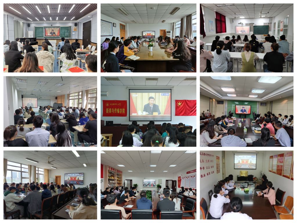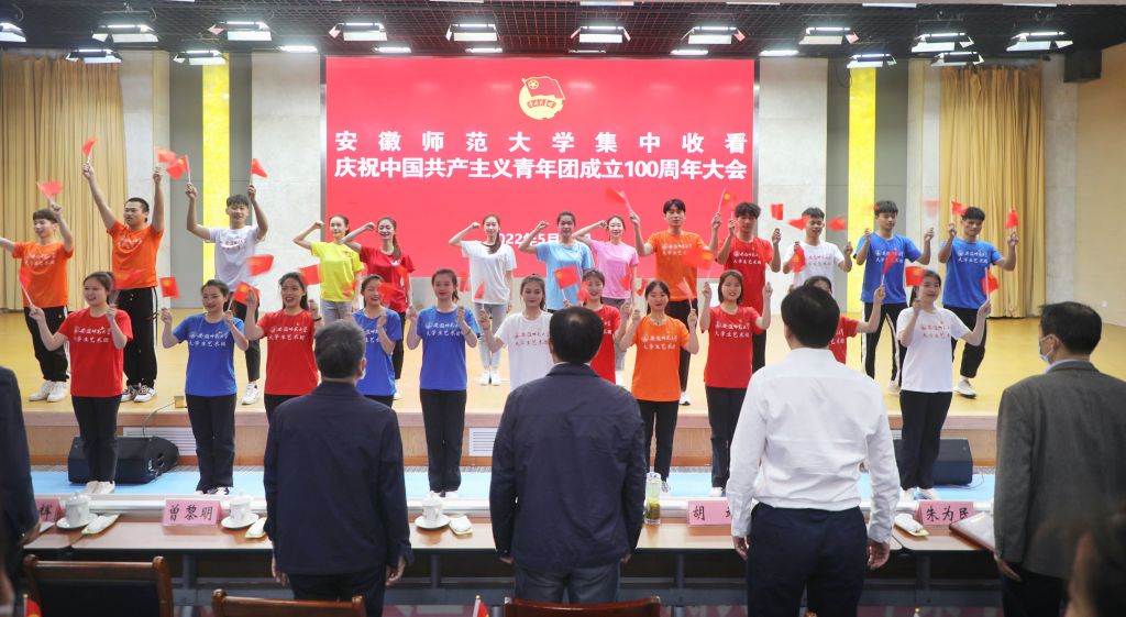 百年正青春、奋斗正当时,集中收看现场气氛热烈。直播开始之前,与会师生共同观看了师大万名学子红歌接力MV合集、共青团中央建团百年MV《有我》以及安师大老中青三代同唱《年轻的朋友来相会》MV。随后学生代表带来快闪表演,一群青年学子手执团旗,高唱《光荣啊,中国共青团》,表达了青年学子坚定听党话、跟党走的信心和决心。学校集中收看现场、各学院会议室,师生纷纷围坐在一起,认真聆听习近平总书记重要讲话,畅谈感想体会。