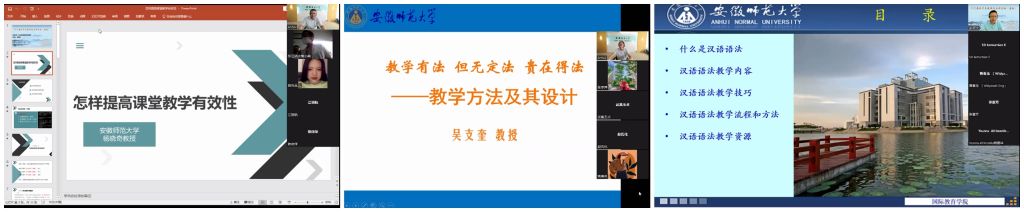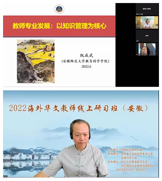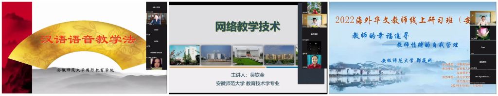 由国务院侨办主办,安徽省侨办、安徽师范大学承办的2022年海外华文教师线上研习班近日开班。针对海外华文教师的需求,我校对本次培训班的师资配备和课程设置进行了多轮优化调整,选派国际教育学院、教育科学学院、文学院和附属小学共27位资深教师,准备了教学能力提升、教学管理服务、智慧教学技术、综合素养提升、中华文化云体验等五大板块、二十八个专题的研习内容,涉及语言文化、网络教育、课堂管理、家校合作等课程,其多彩的教学形式和丰富的教学内容受到了主办方及全体学员的高度赞扬。