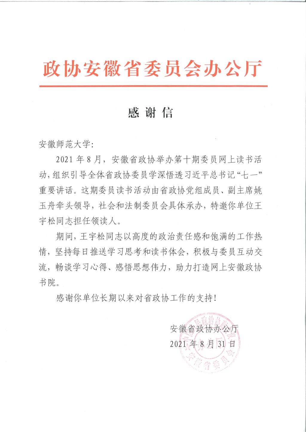 本网讯(党委统战部 钱程)9月8日,我校收到省政协办公厅感谢信,对法学院王宇松同志在安徽政协书院举办的第十期委员网上读书活动中的出色表现给予高度肯定。感谢信指出,王宇松同志在担任领读人期间,以高度的政治责任感和饱满的工作执情,坚持每日推送学习思考和读书体会,积极与委员互动交流,畅谈学习心得、感悟思想伟力,助力打造网上安徽政协书院。感谢你单位长期以来对省政协工作的支持!