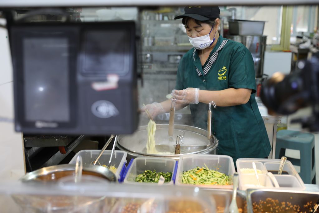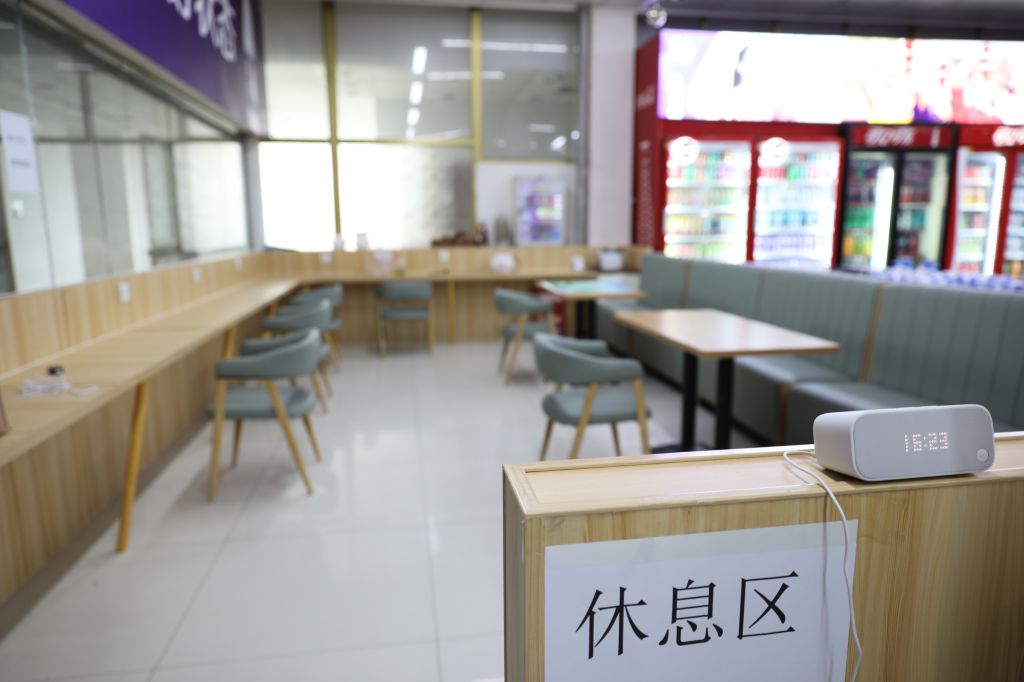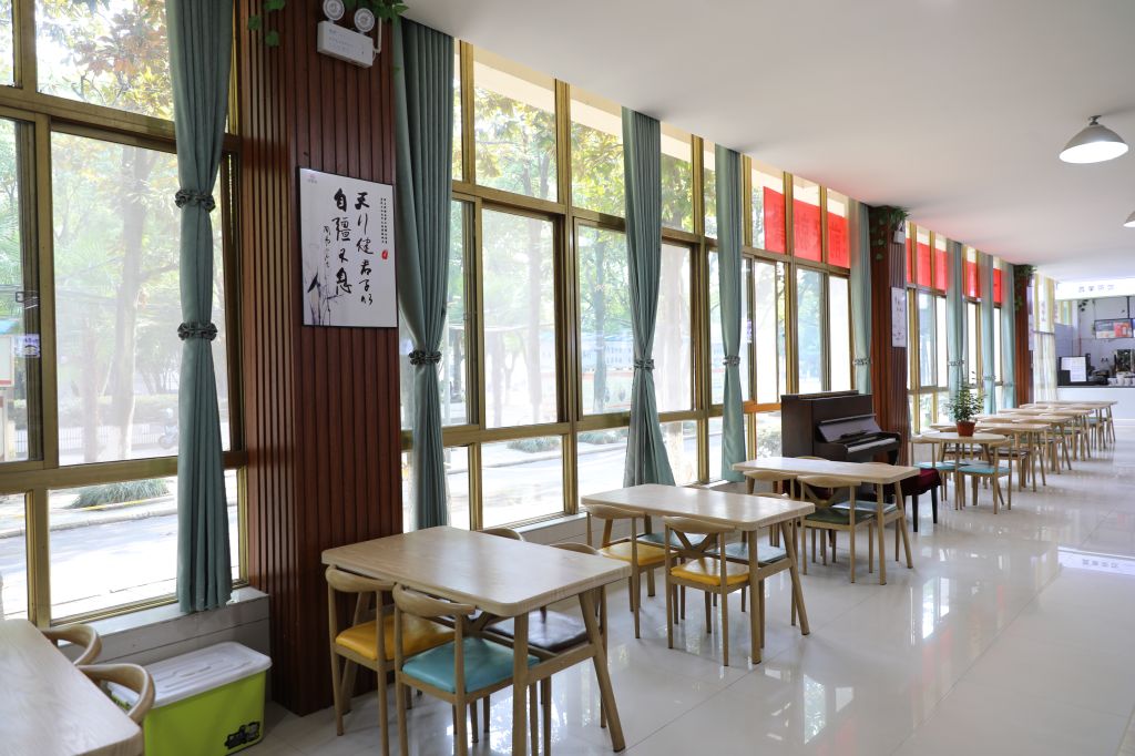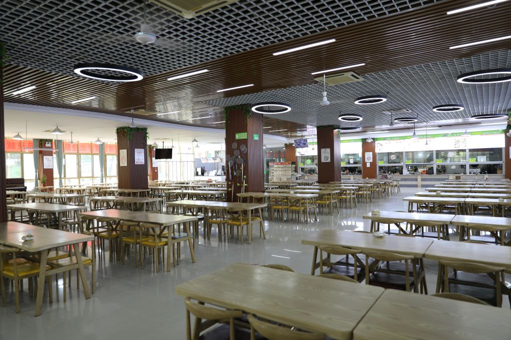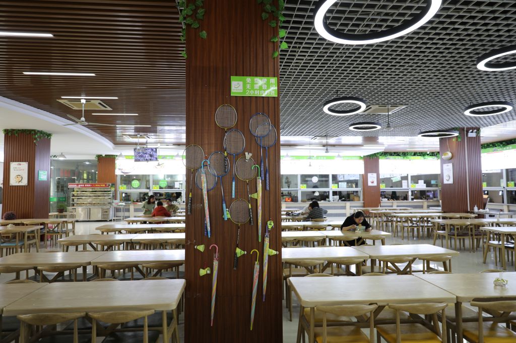 学校食堂有四层楼,距离宿舍和教学楼都非常近,目前开放1-2层,环境优雅,供应各种三餐,价格便宜,种类繁多。食堂内还配有奶茶店、水果店、超市等店铺,货品一应俱全,可实现一站式购物。食堂内中间墙壁上还暖心的悬挂了雨伞、球拍等物品,师生有需要可免费借用。校区还有菜鸟驿站、理发店等平时生活所需店铺,网购、理发等相当方便。