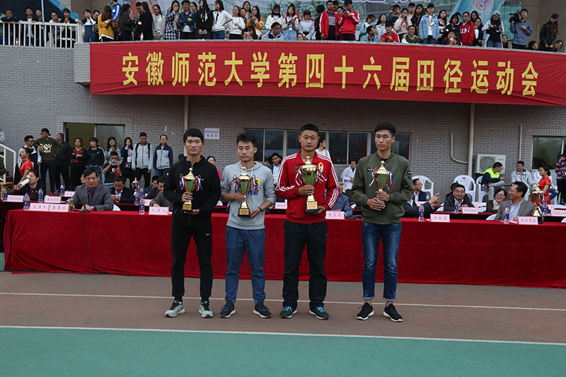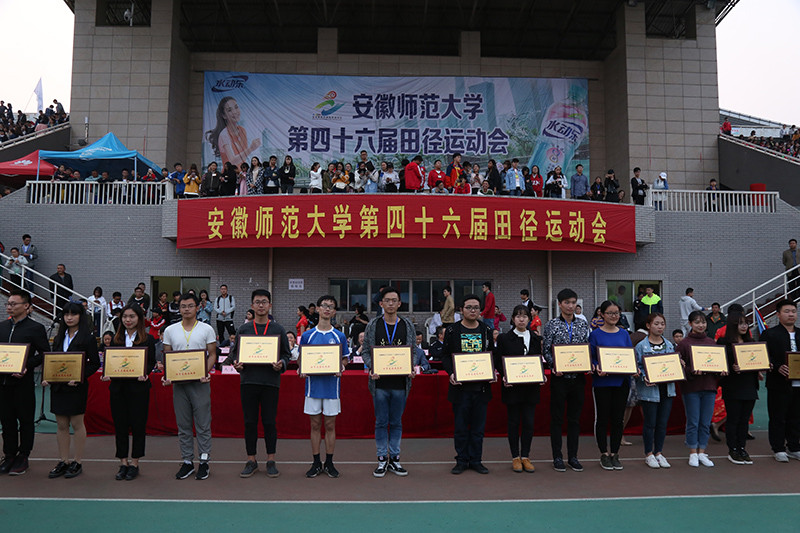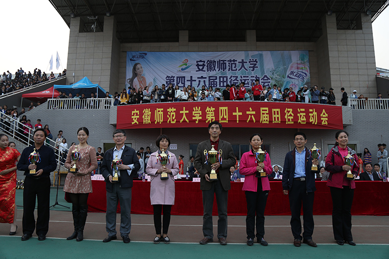 本网讯(校记者团 徐梓卓 王扣扣/文 潘雅丽 冀佳浩/图)青春的激情在赛道上尽情挥洒,胜利的歌声在田径场上飘扬。10月27日下午,为期三天的安徽师范大学第46届田径运动会在全校师生的热情参与和共同努力下,各项预定赛程圆满闭幕。校党委常委、副校长朱家存,各部门、各学院负责同志出席闭幕式并为获奖集体颁奖。闭幕仪式由体育学院党委书记袁德水主持。