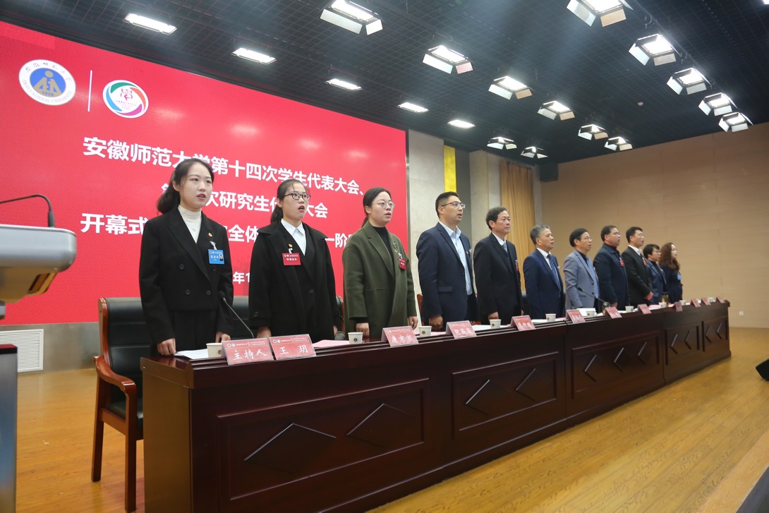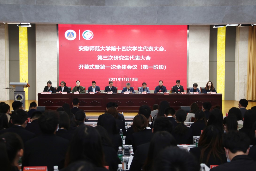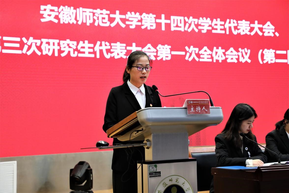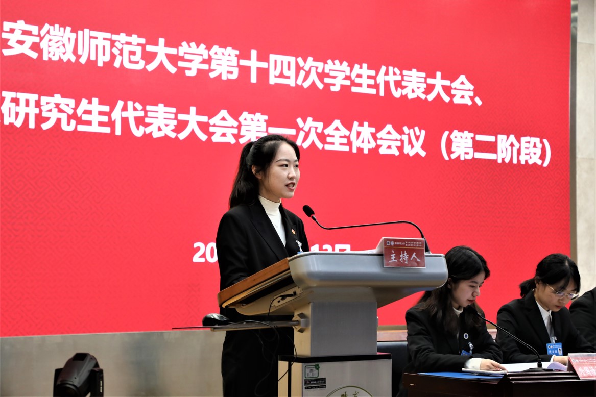 程倩倩在开幕式上致开幕词。大会审议并通过了王玥同学代表校第十三届学生委员会所作的题为《弘扬伟大建党精神,勇担民族复兴使命,团结带领广大本科生在新时代新征程中书写青春篇章》的工作报告和康京京同学代表校第二届研究生委员会所作的题为《在矢志奋斗中汇聚青春力量,在勇担使命中书写精彩华章》的工作报告,审议并通过了《安徽师范大学学生会章程修正案》《安徽师范大学研究生会章程修正案》《第十四次学生代表大会各专门委员会委员名单》,选举产生了新一届校学生会主席团、学生委员会和校研究生会主席团、研究生委员会。大会还征集了代表们提出的提案42份。