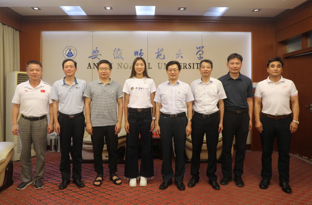 胜利总是青睐有准备的人。“我从小学五年级就开始训练,已经坚持了14年”。王春雨笑着向与会领导分享了自己的“冠军成长之路”,并简要汇报了在全国学生运动会、东京奥运会等训练参赛情况。交谈中,王春雨还特别感慨地提到了自己的外籍教练兰迪·亨廷顿,她表示:“遇到那么好的教练,我想再往世界赛上闯一闯!”。据悉,兰迪·亨廷顿现为中国田径队外籍教练,曾经带出过现中国国家田径队苏炳添、陆敏佳等队员。王春雨深情地对学校、国家以及社会各界的培养、关注和支持,表达了衷心的感谢。王春雨表示,在东京奥运会上自己会尽最大努力去拼搏,在国际赛场上证明自己,争取取得更好的成绩,为安徽师范大学争得荣誉,为安徽、为中国争光!