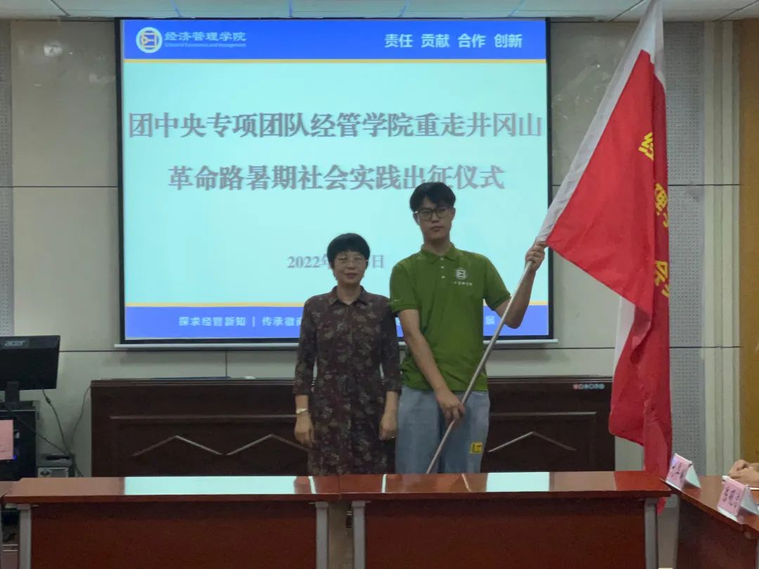 彭凤莲为团队授出征旗,并提出三点希望。一是提高思想认识,珍惜学习机会。要以饱满的热情投入实践,接受思想洗礼,在活动中展现师大学子优秀的政治素养和过硬的综合素质,牢记学校嘱托,沉下心、聚起神,用较短的时间,争取最优秀的成绩。二是强化团队意识,成果上精益求精。要积极参加党史学习教育、国情民情教育和素质拓展等活动,按照实践课题计划认真开展社会实践和校际交流,努力将社会实践调研成果转化为资政建议,推进社会实践成果培育转化。三是强化安全意识,行动上服从指挥。要遵章守纪,统一行动,注意安全,严格遵守常态化疫情防控要求,深入学习了解井冈山斗争史和井冈山精神,加强沟通交流,取长补短、建立友谊。