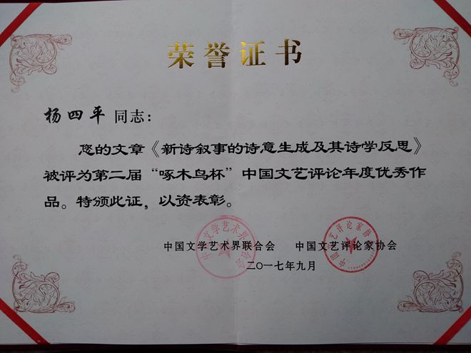 该文在安徽省文联2017年度文艺评论推优活动中荣获一等奖,后经省文联推荐参加第二届“啄木鸟杯”中国文艺评论年度推优活动。终评专家认为:该文聚焦新诗叙事化问题,将“诗歌叙事”历史化与系统化进行深入梳理性阐释,对中国诗歌以抒情为主,忽略叙事性的现状有弥补之功,角度较新,论述完整,有说服力。
