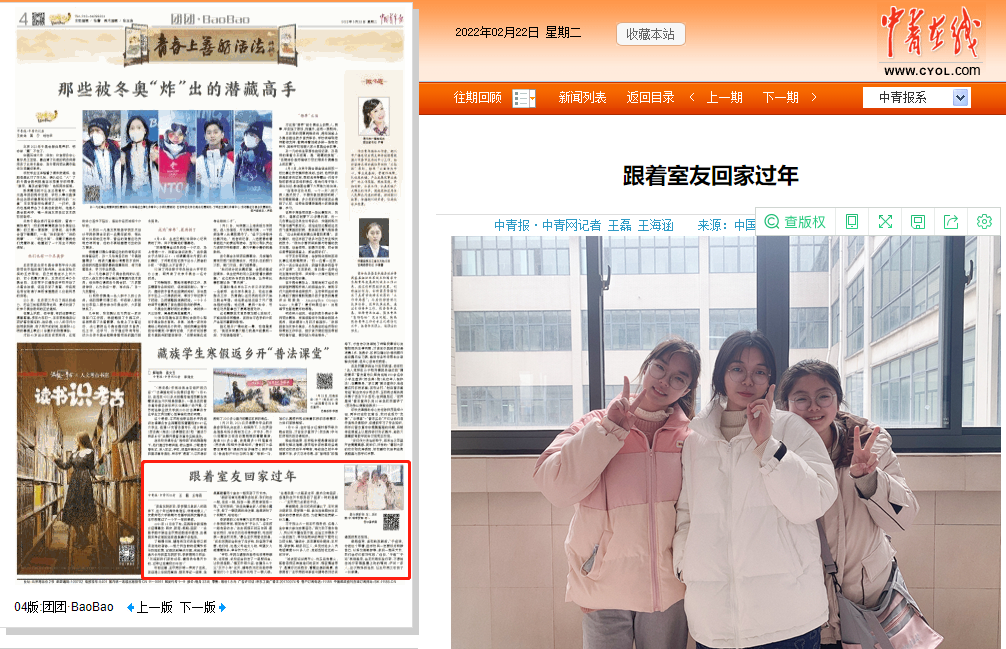 2月22日,《中国青年报》04版“团团·BaoBao ”栏目以“跟着室友回家过年”为题报道了我校新闻与传播学院学子胡家羽、李梦琪带着西安籍室友王欣雨回安徽省天长市家乡过年的暖心事迹。文中提到,2021年12月中下旬,陕西西安新冠肺炎疫情暴发,家在西安的新闻与传播学院学子王欣雨因疫情无法回家过年,在辅导员刘成俊老师的帮助下,在来自安徽省天长市的室友胡家羽、李梦琪的盛情邀请下,王欣雨跟着两个室友一起来到了天长市度过了一个不一样的寒假。