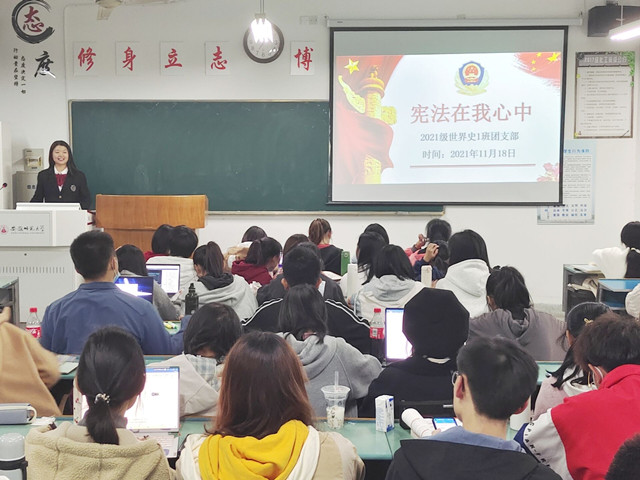 12月3日,青年法学社在花津校区大学生活动中心举行“以习近平法治思想为指引,坚定不移走中国特色社会主义法治道路”国家宪法日主题宣讲活动。主讲人围绕新中国成立以来宪法的历史沿革、地位和作用等主题,从“国家宪法日”“党的十九届六中全会”“习近平法治思想”三个方面进行了详实深入的讲解,并就具体宪法知识为同学们答疑解惑,进行深度普法。历史学院充分利用微信、QQ等新媒体平台及时发布相关宪法科普文章推文,围绕国家宪法日宣传主题详细介绍了宪法的内容以及宪法对公民日常生活的影响与重要性。同时,各班级组织开展了宪法宣传主题宣讲活动,通过面对面的形式普及宪法知识。