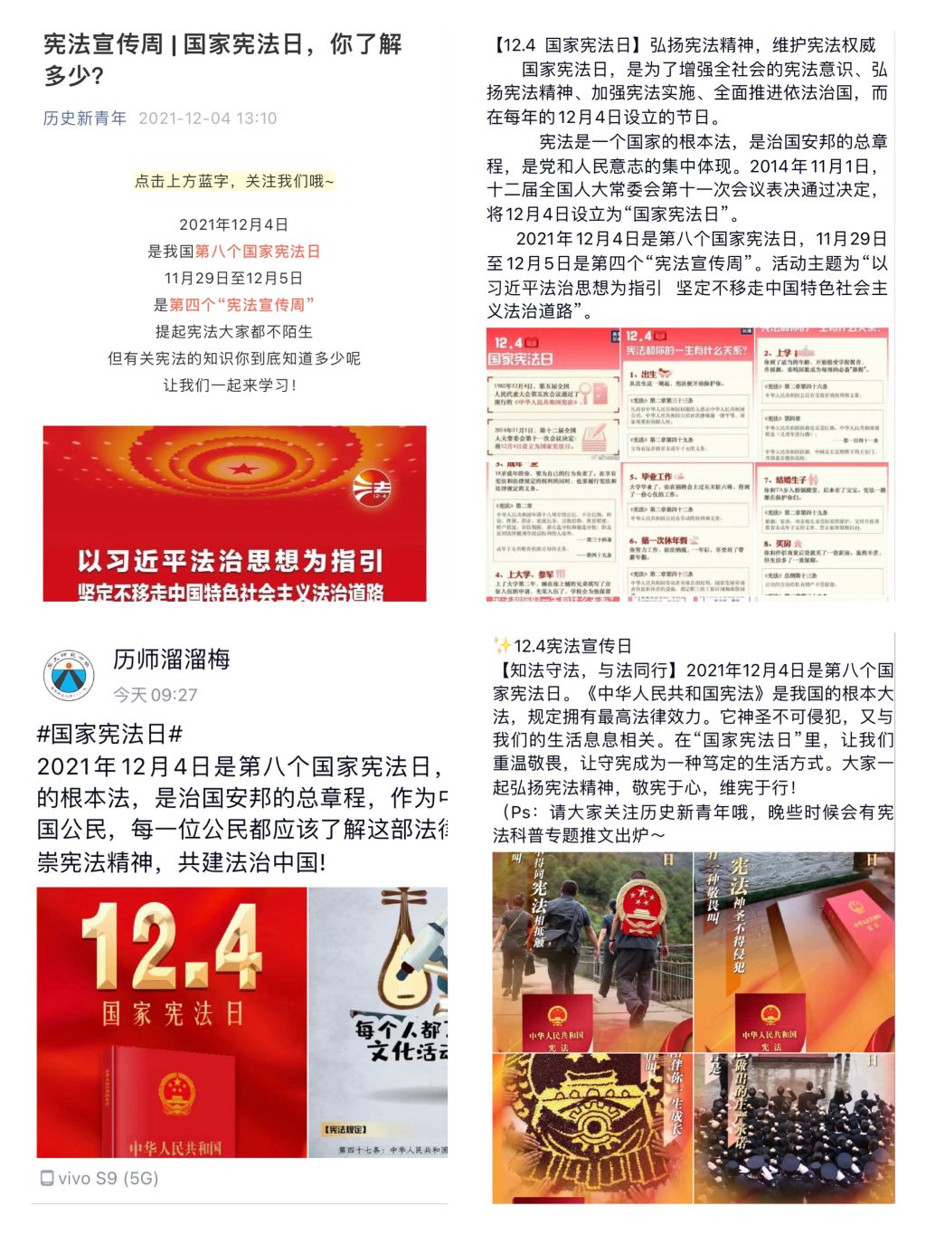 在“12·4”国家宪法日当天,各学院还开展了国家宪法日知识竞赛,竞赛以宪法条文为主要考查内容,结合宪法衍生的相关部门法对参赛选手进行考查,以赛促学,提高同学们学习宪法的积极性,在潜移默化中传播宪法精神、增强法治观念。