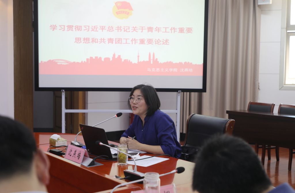 会上,与会人员集体观看学习了《庆祝中国共产主义青年团成立100周年大会在京隆重举行 习近平发表重要讲话》《安徽省“喜迎二十大、永远跟党走、奋进新征程”主题团日活动在合肥举行》《中共中央政治局常务委员会召开会议分析当前新冠肺炎疫情防控形势 研究部署抓紧抓实疫情防控重点工作 中共中央总书记习近平主持会议》等新闻视频。团中央青年讲师团讲师、安徽省委讲师团专家库宣讲专家、《习近平新时代中国特色社会主义思想概论》课程组负责人、马克思主义学院副教授沈燕培围绕“学习贯彻习近平总书记关于青年工作的重要思想和共青团工作的重要论述”作了专题辅导报告。陆林、胡靖分别结合自身的学习体会和工作实际,围绕“学习贯彻习近平总书记在庆祝中国共产主义青年团成立100周年大会上的重要讲话精神”这一主题作了专题研讨发言。