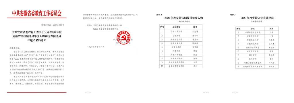 本网讯(新闻与传播学院)近日,中共安徽省委教育工委公布了安徽省2020年度高校辅导员年度人物评选活动名单,新闻与传播学院马星宇老师荣获殊荣。