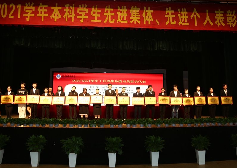 表彰大会在庄严的国歌声中拉开帷幕。校党委常委、副校长陆林宣读表彰决定。与会领导为获得三好学生标兵、优秀学生干部标兵、优秀团支部、优秀团员、优秀团干、暑期社会实践优秀重点团队、“感动师大”校园精神文明十佳事迹创建主体、十佳大学生、十佳自强之星、十佳志愿者、国家励志奖学金、国家奖学金、十佳班集体、十佳班集体提名奖等荣誉的先进集体和个人代表颁奖。文学院刘长恕同学、美术学院陈如意同学、物理与电子信息学院郭昌繁同学分别作为国家奖学金、十佳自强之星、校十佳班集体获奖代表发表获奖感言。