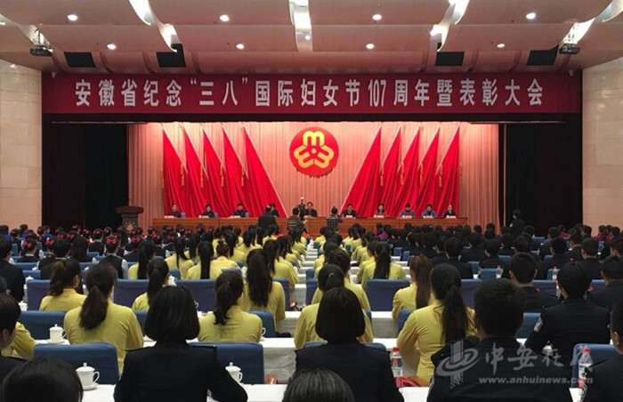 本网讯((文/图 孙月婷)3月3日,安徽省纪念“三八”国际妇女节107周年暨表彰大会在合肥召开,会议对安徽省三八红旗手标兵、安徽省三八红旗手和三八红旗集体进行表彰。来自新闻与传播院2014级广告学专业的黄金花,作为校园电商创业带头人,成为今年安徽省唯一一位获得“三八红旗手”殊荣的在校大学生,并作为代表在表彰大会上发言。