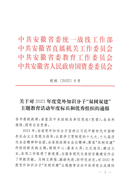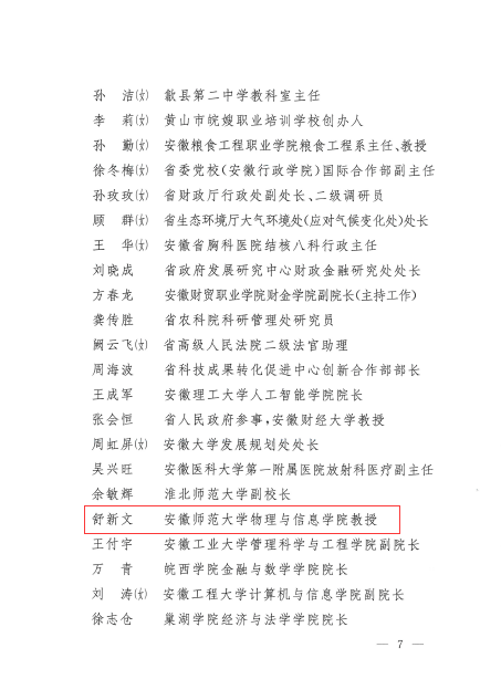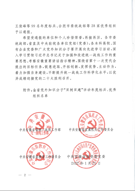 近日,安徽省委统战部、省直机关工委、省委教育工委和省国资委党委等四部门联合发文,对2021年度安徽省党外知识分子“双树双建”活动年度标兵和优秀组织进行通报表彰,我校欧美同学会副会长、九三学社基层委员会副主委、物理与电子信息学院教授舒新文获评“双树双建”活动年度标兵。