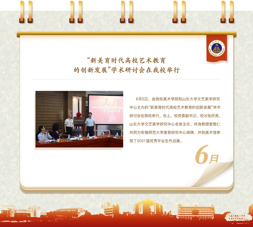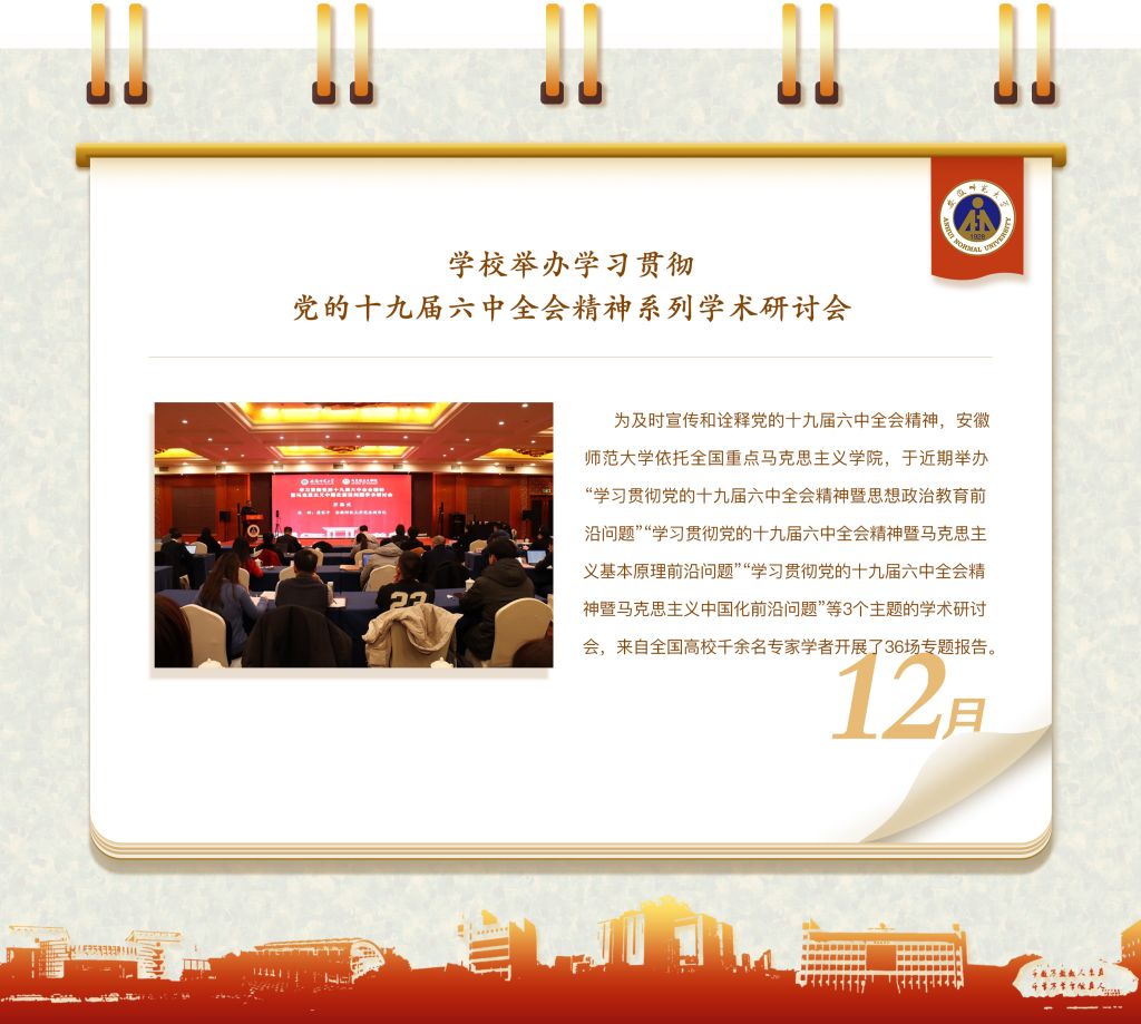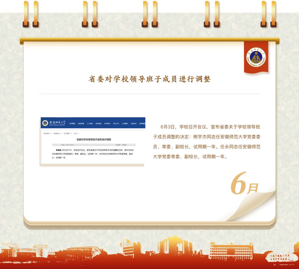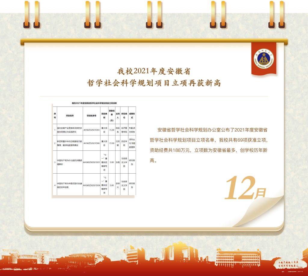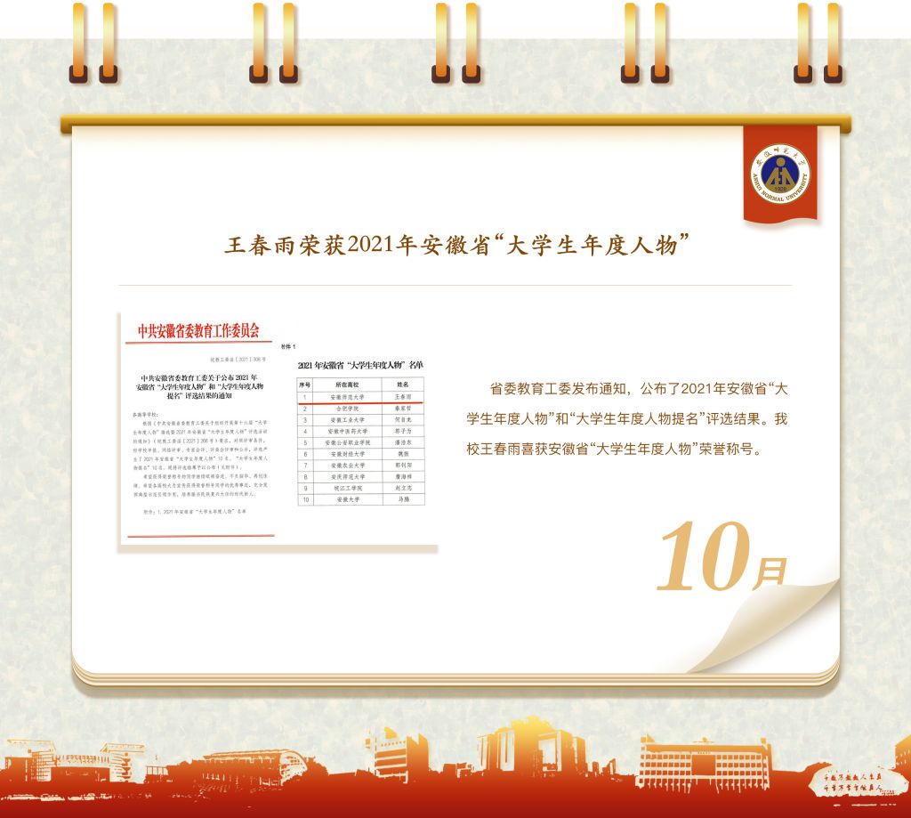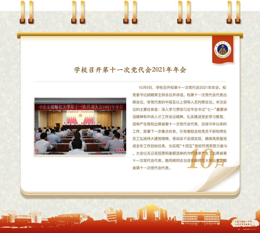 编者按 2021年是中国共产党成立100周年,是全面建设社会主义现代化国家新征程开启之年,也是“十四五”开局之年。这一年,党的十九届六中全会胜利召开,省第十一次党代会擘画安徽未来五年发展蓝图,校第九届教代会暨第七届工代会审议通过学校“十四五”事业发展规划……2021年,全体师大人凝心聚力、锐意进取,埋头苦干、勇毅前行,深入开展党史学习教育和“我为师生办实事”实践活动,加快推进高水平大学建设,在教学、科研、文化、服务等方面取得了丰硕成果。这一年,学校23个专业入选国家级、省级一流本科专业建设点,新增3个一级学科博士学位授权点、1个一级学科硕士学位授权点和6个硕士专业学位授权类别,我校学生工作被《人民日报》报道,路丙辉教授获评“全国优秀共产党员”并赴京参加庆祝中国共产党成立100周年有关活动,阮成武教授荣获“全国五一劳动奖章”,王春雨在东京奥运会上创造中国田径女子800米最好成绩,文科综合楼、教师教育实习实训中心等一大批新建筑顺利开工建设……一行行脚踏实地的足迹,印证了师大人干事创业的坚强定力;一次次永不止步的探索,书写了师大人追求卓越的强烈信念;一幅幅撸起袖子加油干的画面,诠释了师大人教书育人的初心和使命。