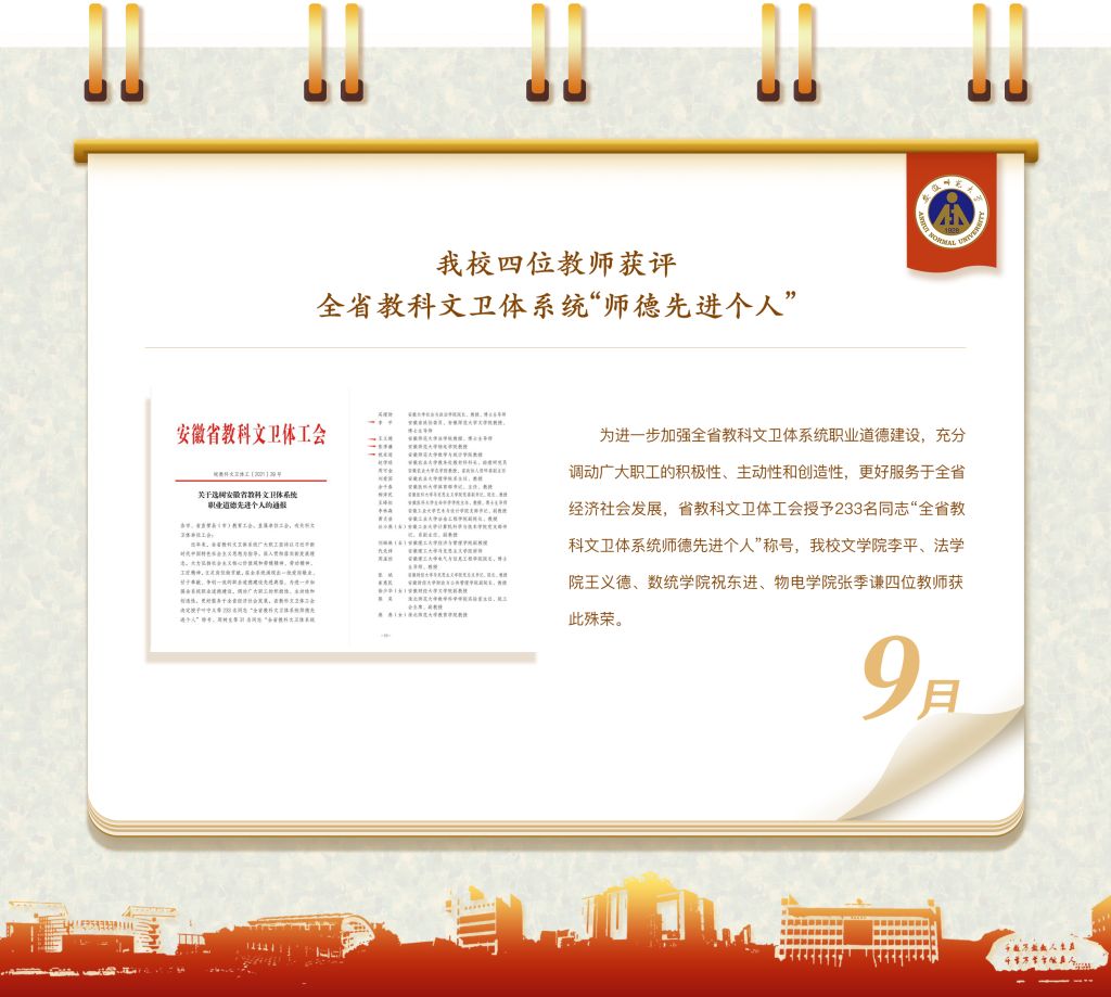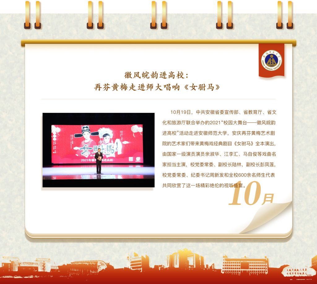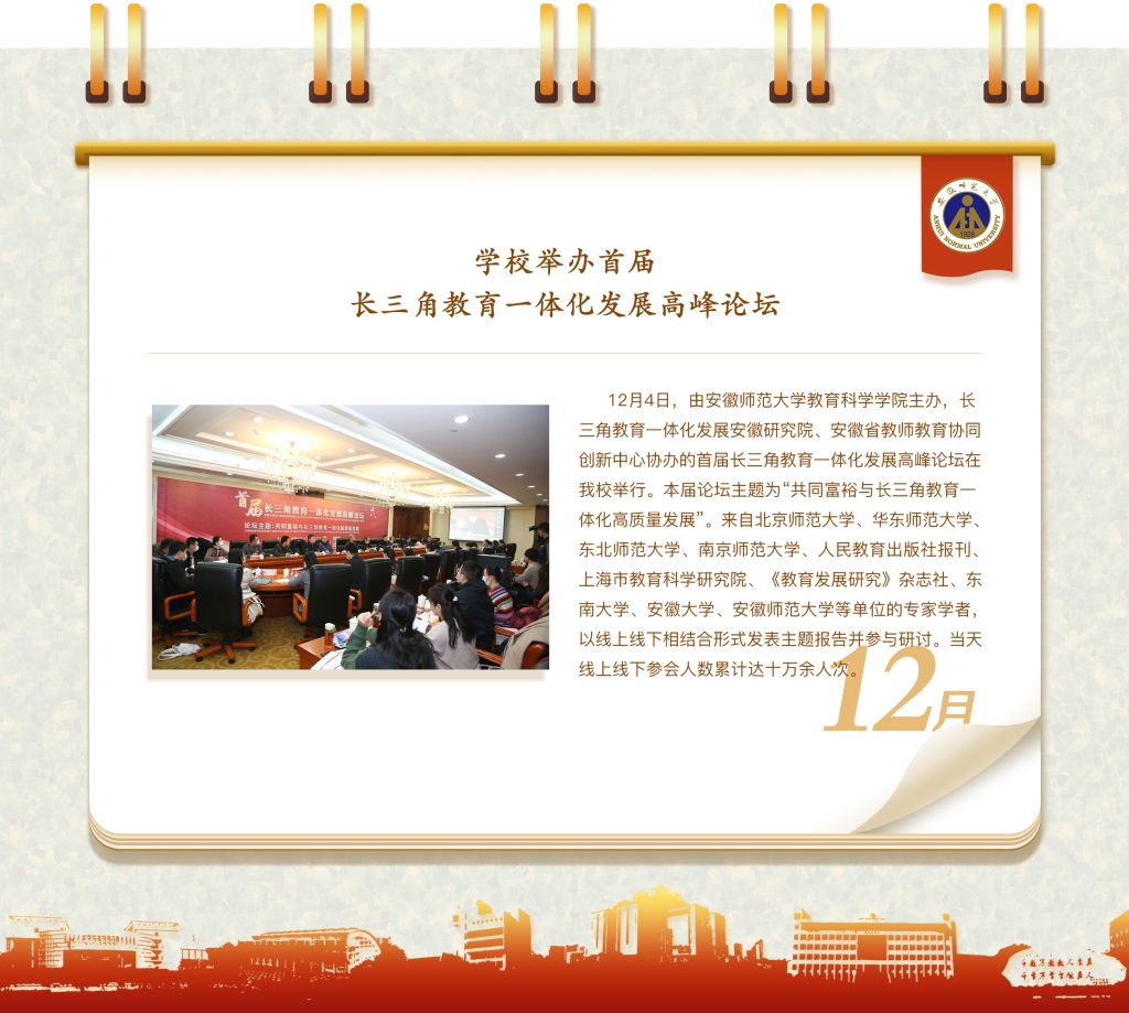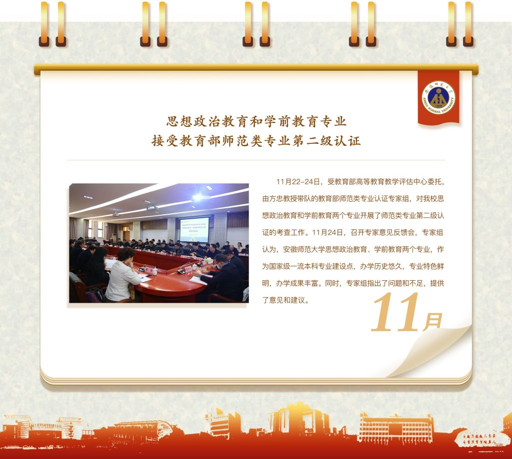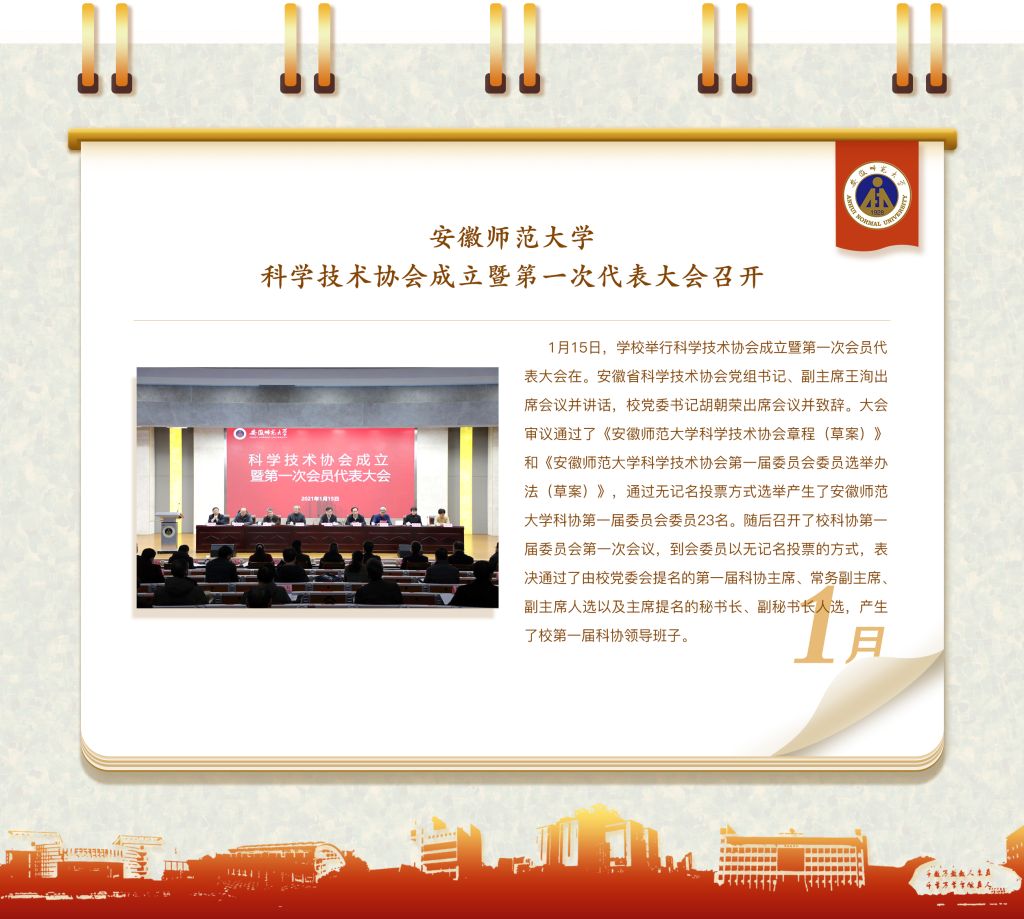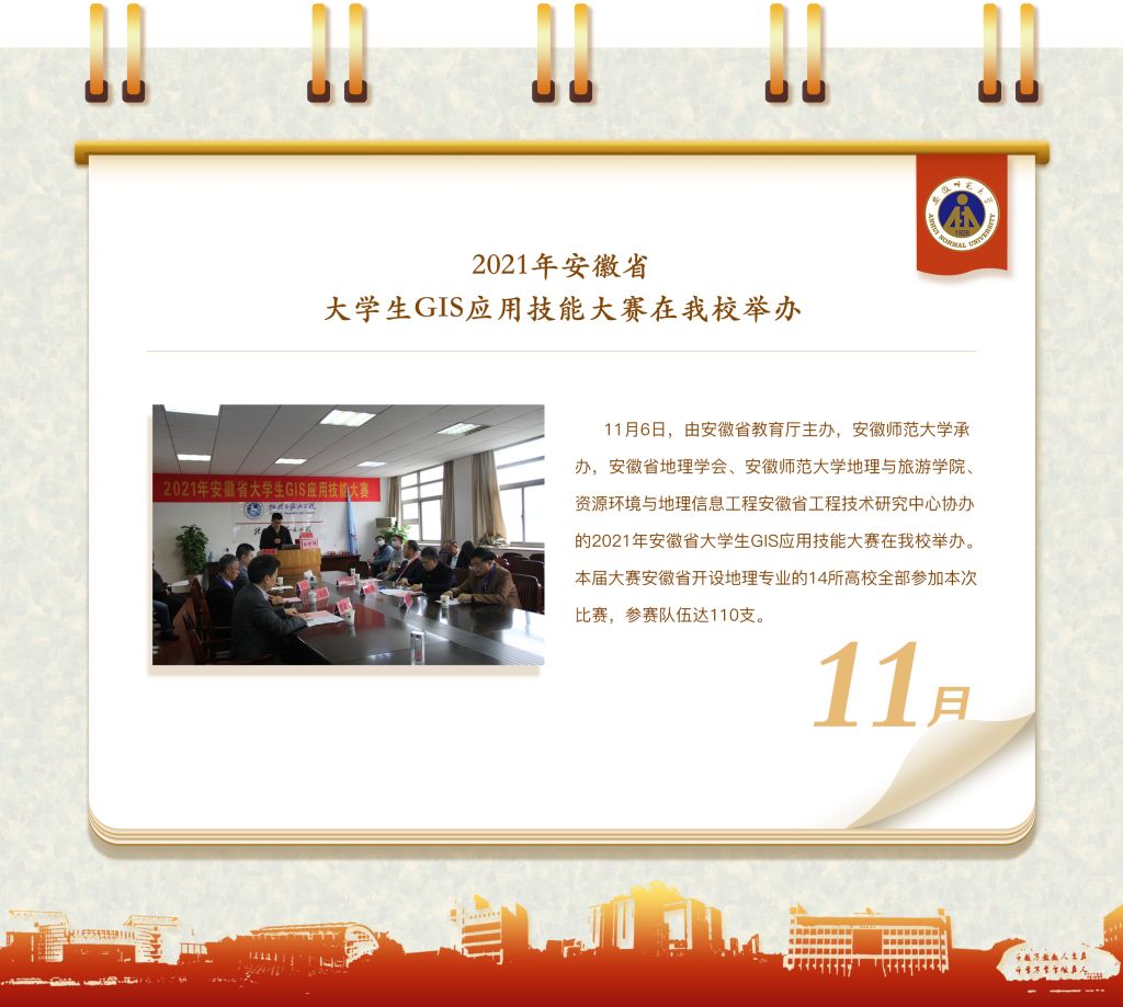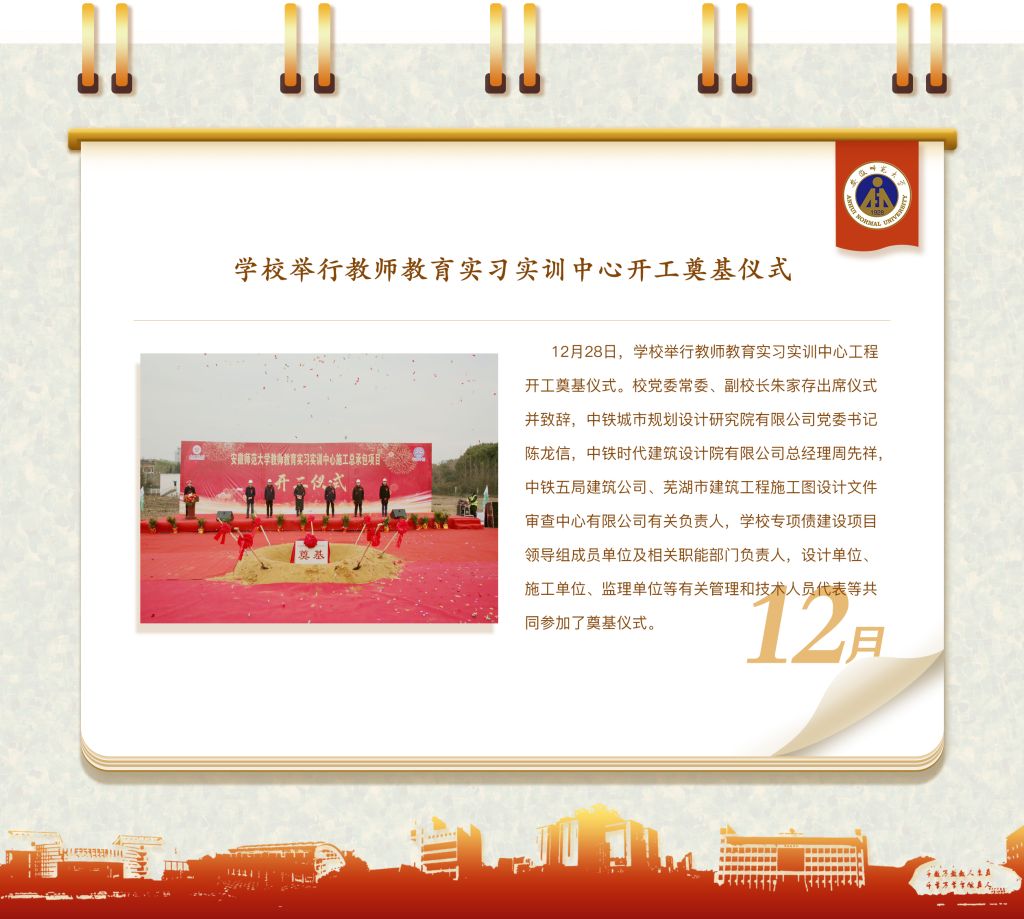 编者按 2021年是中国共产党成立100周年,是全面建设社会主义现代化国家新征程开启之年,也是“十四五”开局之年。这一年,党的十九届六中全会胜利召开,省第十一次党代会擘画安徽未来五年发展蓝图,校第九届教代会暨第七届工代会审议通过学校“十四五”事业发展规划……2021年,全体师大人凝心聚力、锐意进取,埋头苦干、勇毅前行,深入开展党史学习教育和“我为师生办实事”实践活动,加快推进高水平大学建设,在教学、科研、文化、服务等方面取得了丰硕成果。这一年,学校23个专业入选国家级、省级一流本科专业建设点,新增3个一级学科博士学位授权点、1个一级学科硕士学位授权点和6个硕士专业学位授权类别,我校学生工作被《人民日报》报道,路丙辉教授获评“全国优秀共产党员”并赴京参加庆祝中国共产党成立100周年有关活动,阮成武教授荣获“全国五一劳动奖章”,王春雨在东京奥运会上创造中国田径女子800米最好成绩,文科综合楼、教师教育实习实训中心等一大批新建筑顺利开工建设……一行行脚踏实地的足迹,印证了师大人干事创业的坚强定力;一次次永不止步的探索,书写了师大人追求卓越的强烈信念;一幅幅撸起袖子加油干的画面,诠释了师大人教书育人的初心和使命。