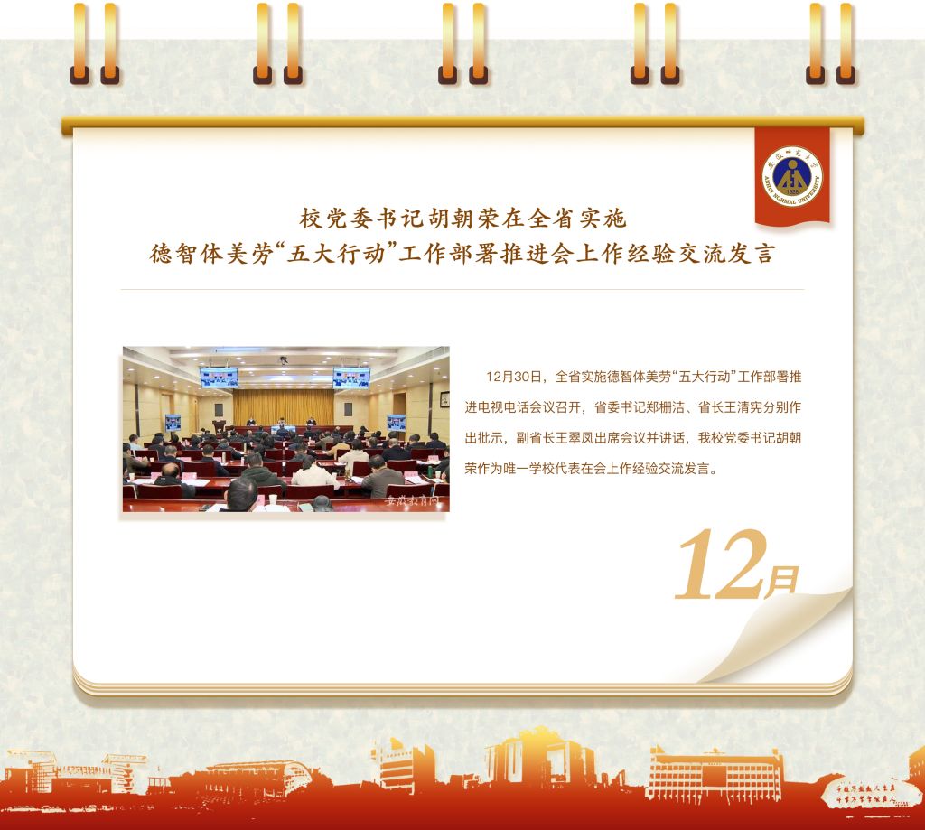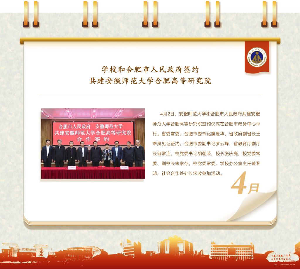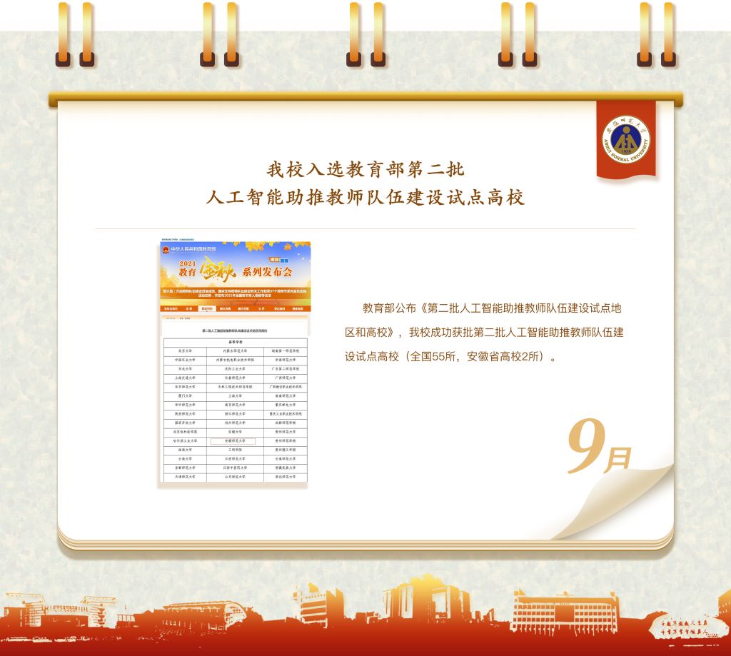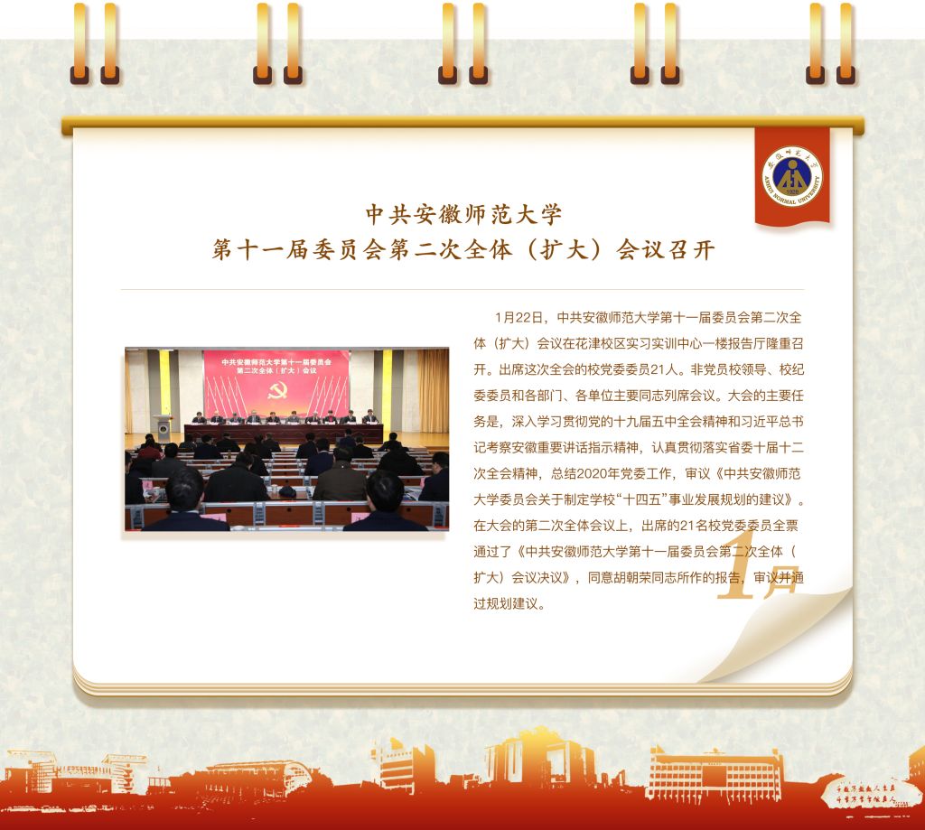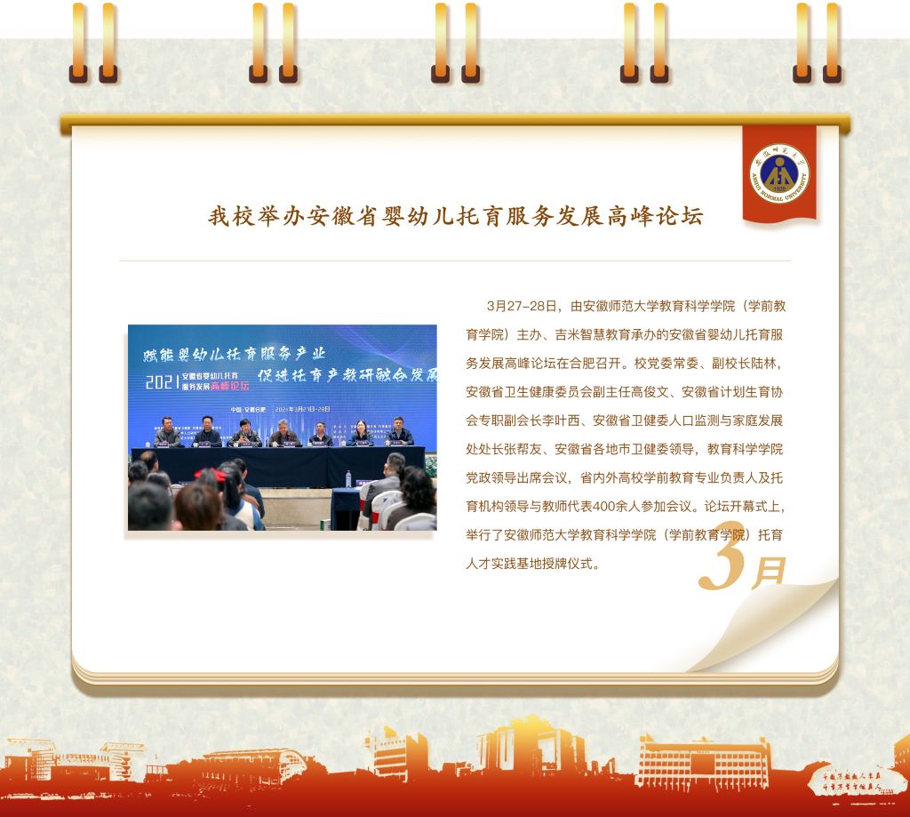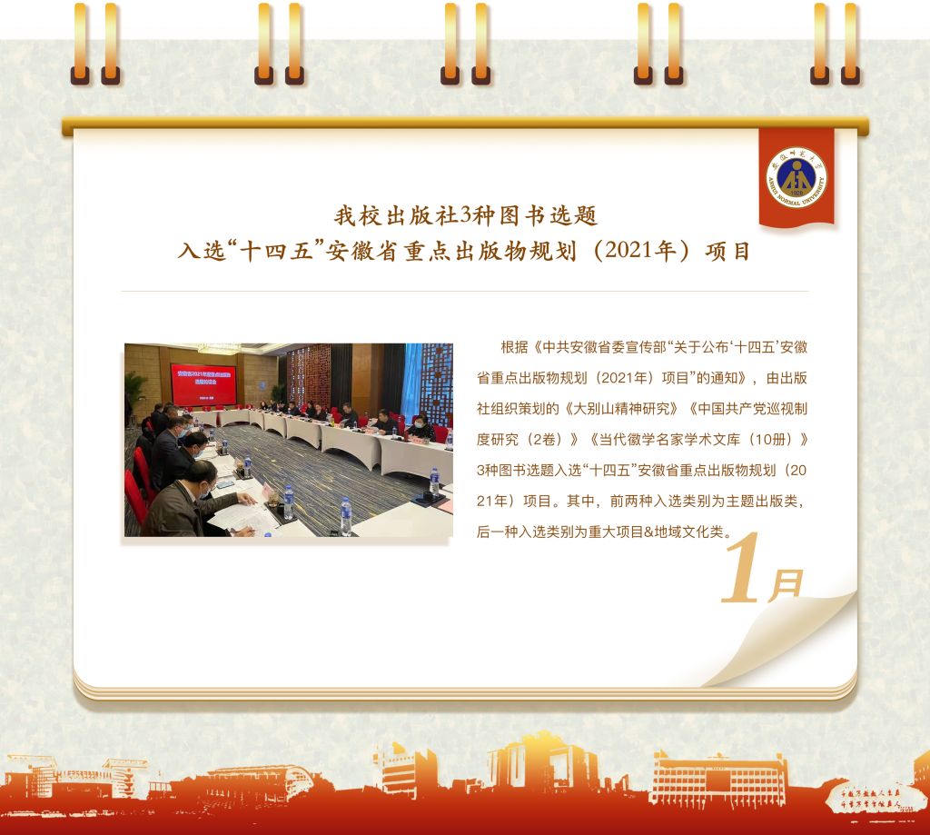 编者按 2021年是中国共产党成立100周年,是全面建设社会主义现代化国家新征程开启之年,也是“十四五”开局之年。这一年,党的十九届六中全会胜利召开,省第十一次党代会擘画安徽未来五年发展蓝图,校第九届教代会暨第七届工代会审议通过学校“十四五”事业发展规划……2021年,全体师大人凝心聚力、锐意进取,埋头苦干、勇毅前行,深入开展党史学习教育和“我为师生办实事”实践活动,加快推进高水平大学建设,在教学、科研、文化、服务等方面取得了丰硕成果。这一年,学校23个专业入选国家级、省级一流本科专业建设点,新增3个一级学科博士学位授权点、1个一级学科硕士学位授权点和6个硕士专业学位授权类别,我校学生工作被《人民日报》报道,路丙辉教授获评“全国优秀共产党员”并赴京参加庆祝中国共产党成立100周年有关活动,阮成武教授荣获“全国五一劳动奖章”,王春雨在东京奥运会上创造中国田径女子800米最好成绩,文科综合楼、教师教育实习实训中心等一大批新建筑顺利开工建设……一行行脚踏实地的足迹,印证了师大人干事创业的坚强定力;一次次永不止步的探索,书写了师大人追求卓越的强烈信念;一幅幅撸起袖子加油干的画面,诠释了师大人教书育人的初心和使命。