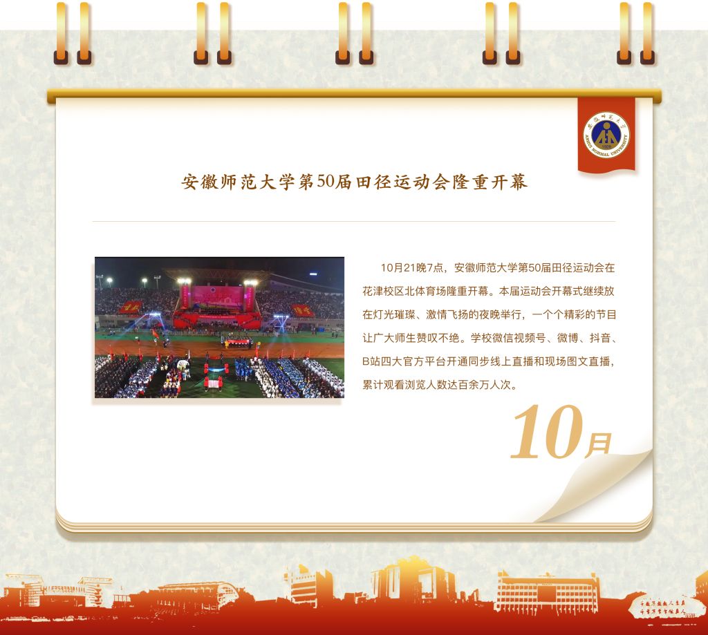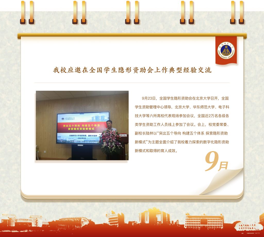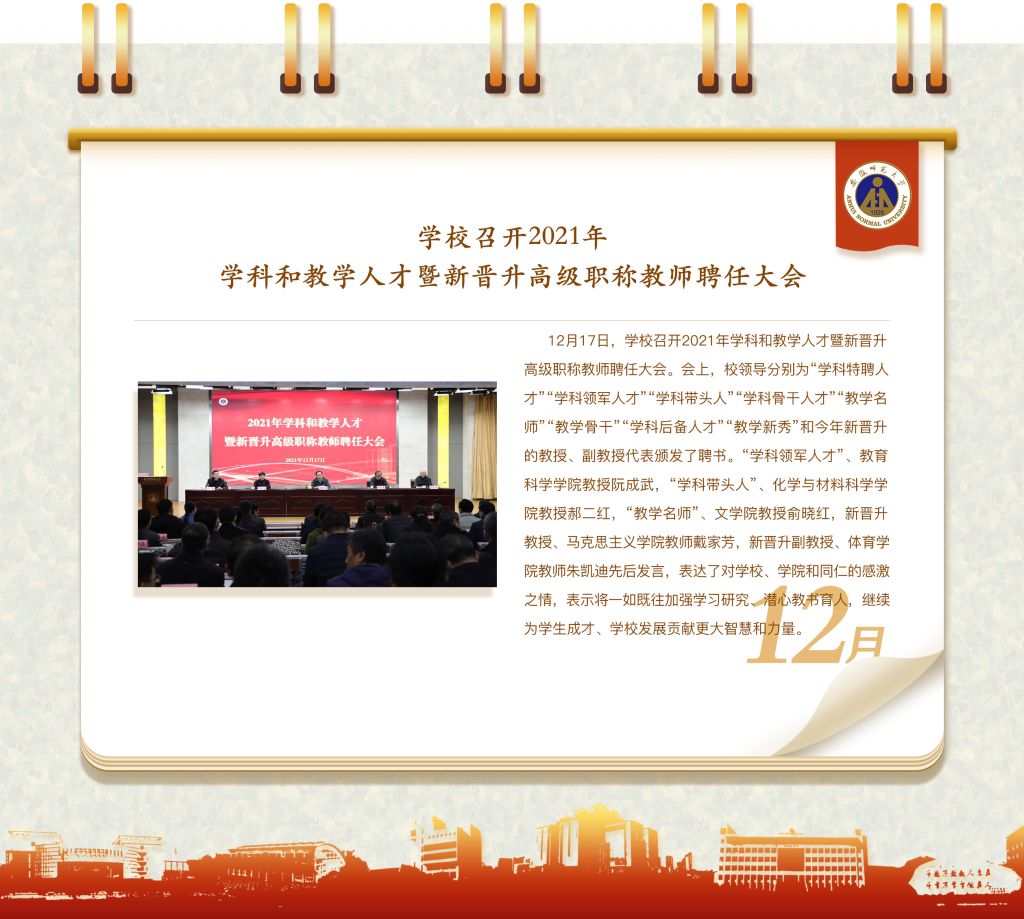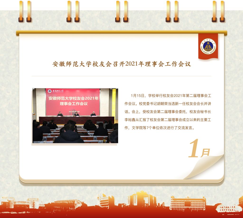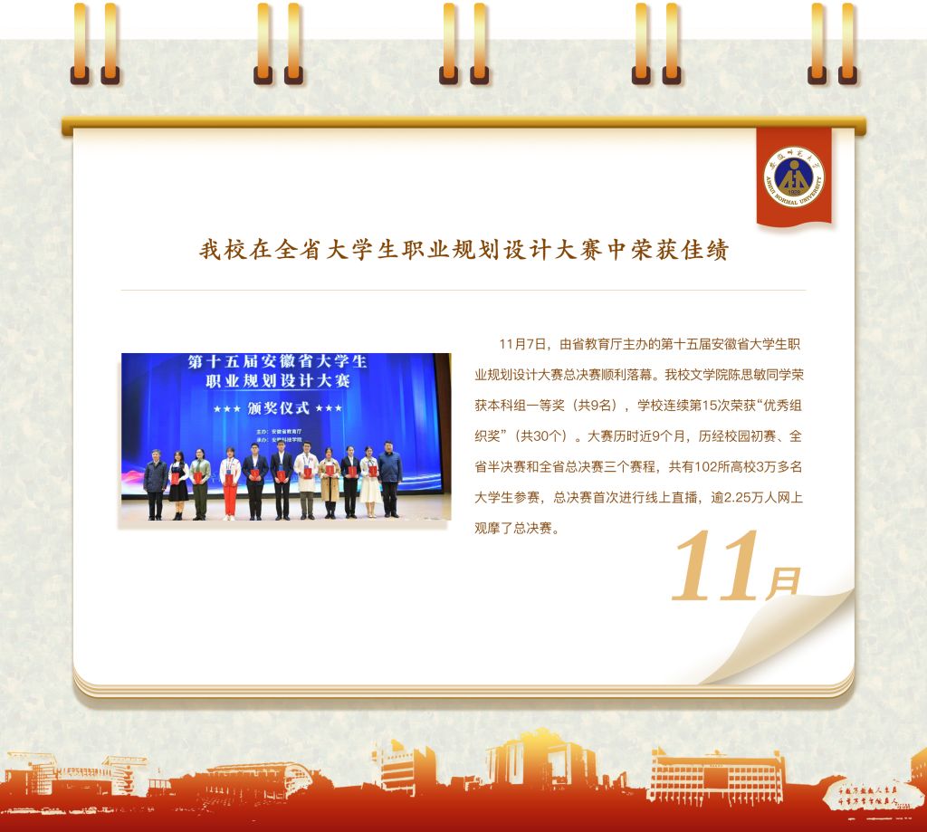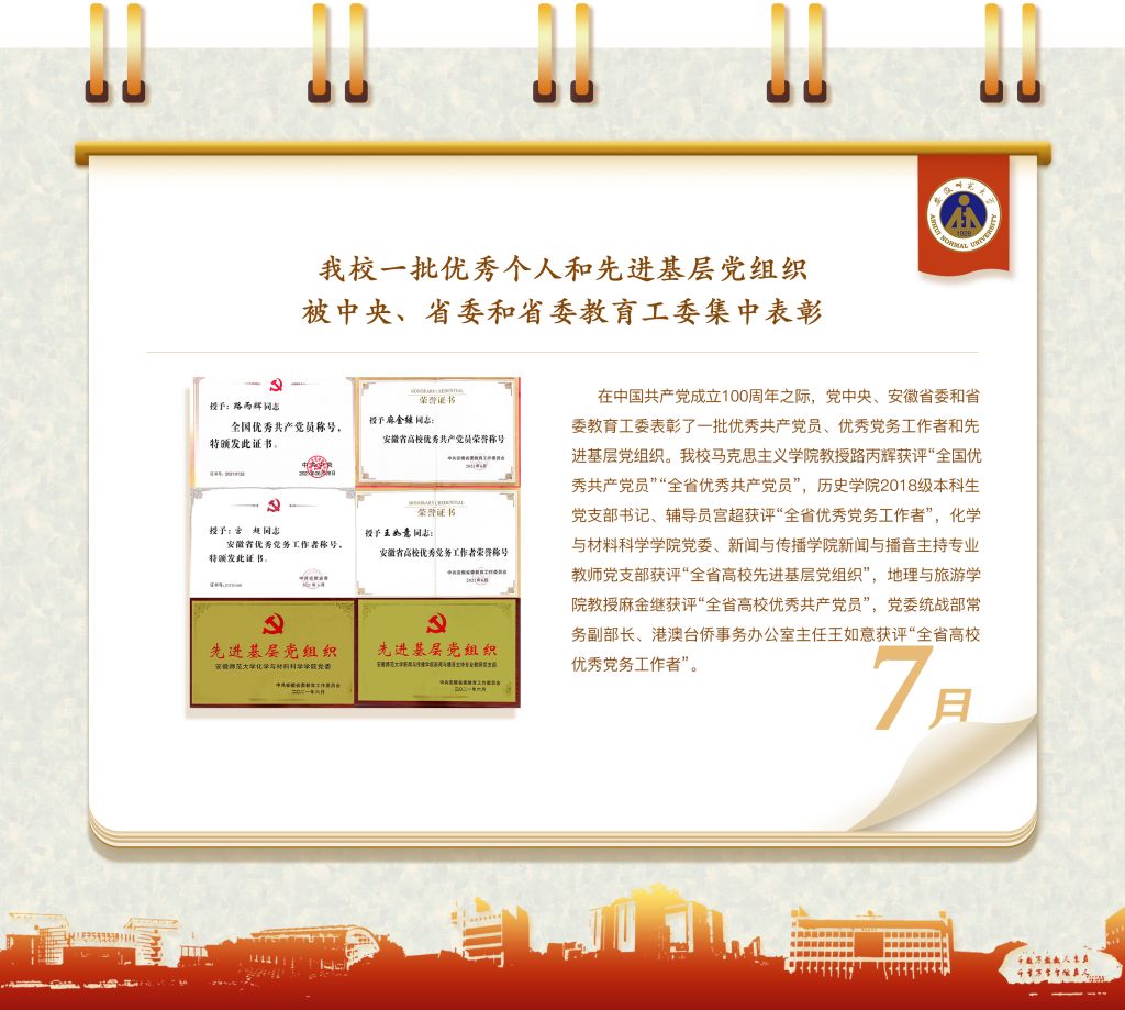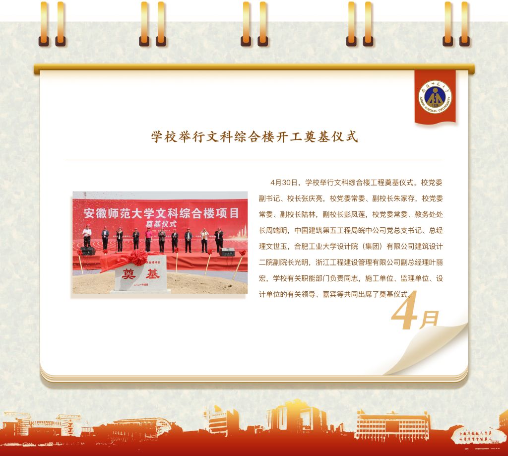 编者按 2021年是中国共产党成立100周年,是全面建设社会主义现代化国家新征程开启之年,也是“十四五”开局之年。这一年,党的十九届六中全会胜利召开,省第十一次党代会擘画安徽未来五年发展蓝图,校第九届教代会暨第七届工代会审议通过学校“十四五”事业发展规划……2021年,全体师大人凝心聚力、锐意进取,埋头苦干、勇毅前行,深入开展党史学习教育和“我为师生办实事”实践活动,加快推进高水平大学建设,在教学、科研、文化、服务等方面取得了丰硕成果。这一年,学校23个专业入选国家级、省级一流本科专业建设点,新增3个一级学科博士学位授权点、1个一级学科硕士学位授权点和6个硕士专业学位授权类别,我校学生工作被《人民日报》报道,路丙辉教授获评“全国优秀共产党员”并赴京参加庆祝中国共产党成立100周年有关活动,阮成武教授荣获“全国五一劳动奖章”,王春雨在东京奥运会上创造中国田径女子800米最好成绩,文科综合楼、教师教育实习实训中心等一大批新建筑顺利开工建设……一行行脚踏实地的足迹,印证了师大人干事创业的坚强定力;一次次永不止步的探索,书写了师大人追求卓越的强烈信念;一幅幅撸起袖子加油干的画面,诠释了师大人教书育人的初心和使命。