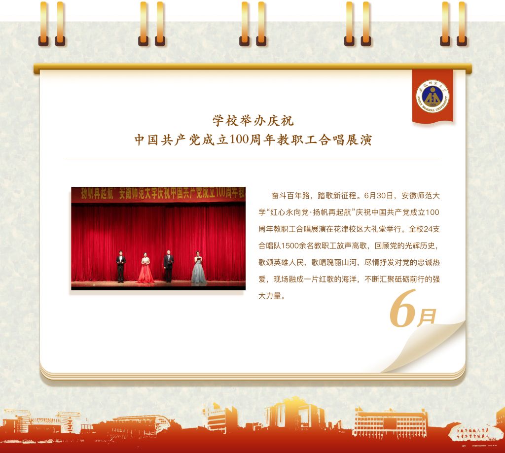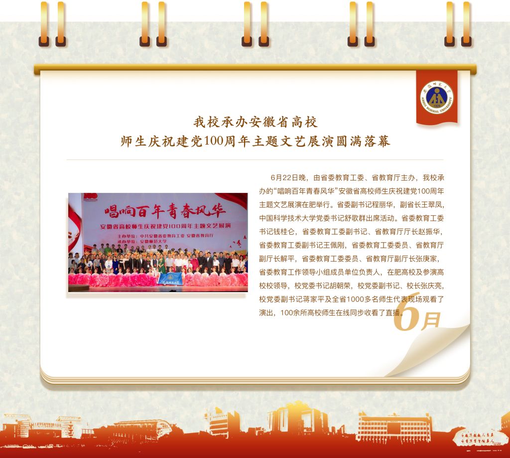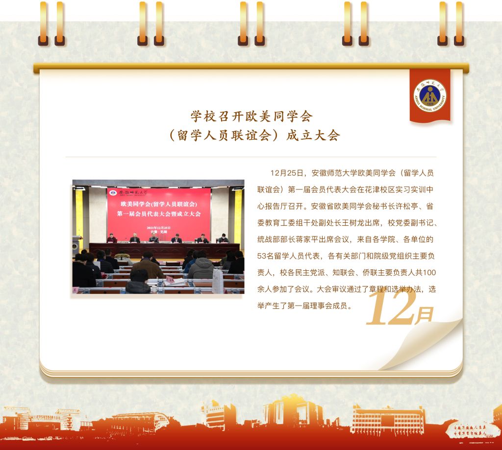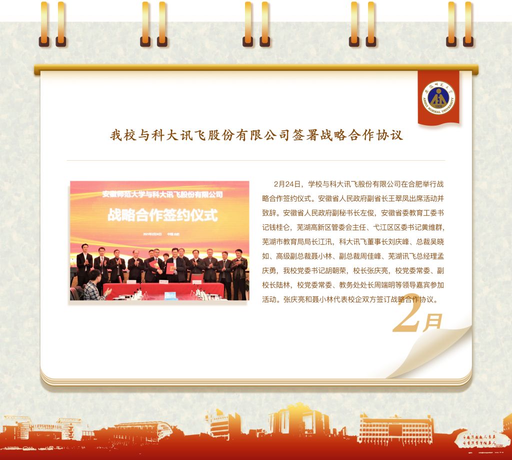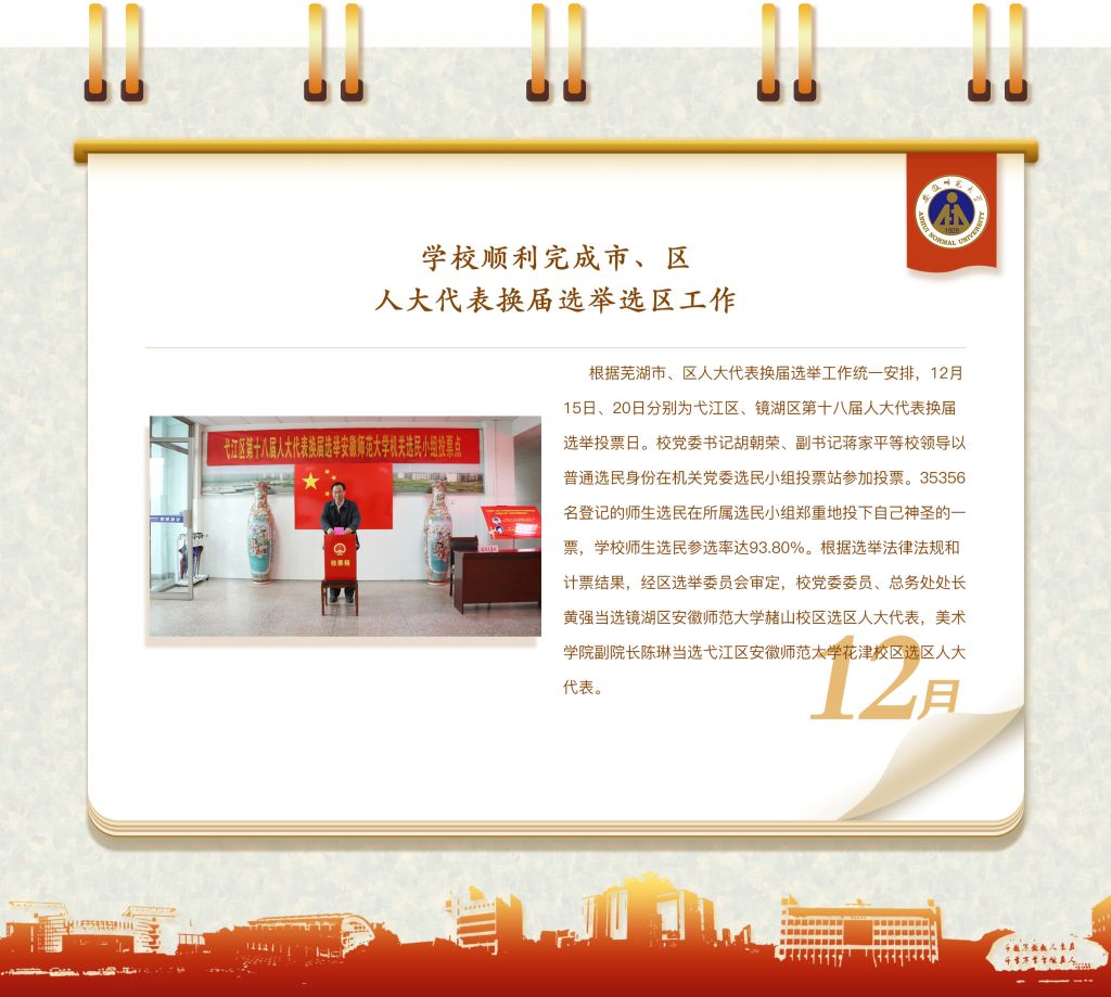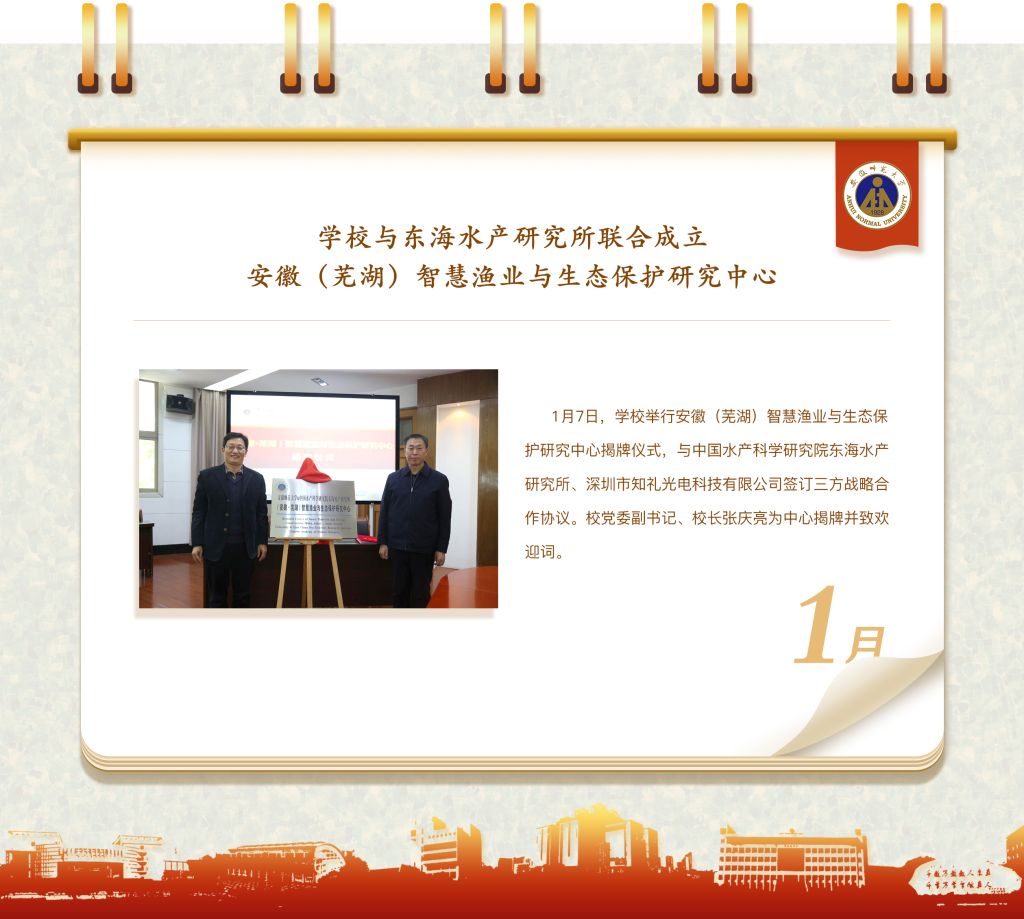 编者按 2021年是中国共产党成立100周年,是全面建设社会主义现代化国家新征程开启之年,也是“十四五”开局之年。这一年,党的十九届六中全会胜利召开,省第十一次党代会擘画安徽未来五年发展蓝图,校第九届教代会暨第七届工代会审议通过学校“十四五”事业发展规划……2021年,全体师大人凝心聚力、锐意进取,埋头苦干、勇毅前行,深入开展党史学习教育和“我为师生办实事”实践活动,加快推进高水平大学建设,在教学、科研、文化、服务等方面取得了丰硕成果。这一年,学校23个专业入选国家级、省级一流本科专业建设点,新增3个一级学科博士学位授权点、1个一级学科硕士学位授权点和6个硕士专业学位授权类别,我校学生工作被《人民日报》报道,路丙辉教授获评“全国优秀共产党员”并赴京参加庆祝中国共产党成立100周年有关活动,阮成武教授荣获“全国五一劳动奖章”,王春雨在东京奥运会上创造中国田径女子800米最好成绩,文科综合楼、教师教育实习实训中心等一大批新建筑顺利开工建设……一行行脚踏实地的足迹,印证了师大人干事创业的坚强定力;一次次永不止步的探索,书写了师大人追求卓越的强烈信念;一幅幅撸起袖子加油干的画面,诠释了师大人教书育人的初心和使命。