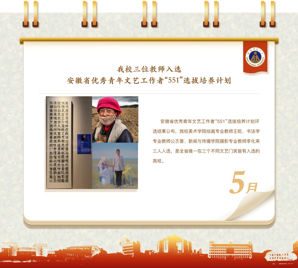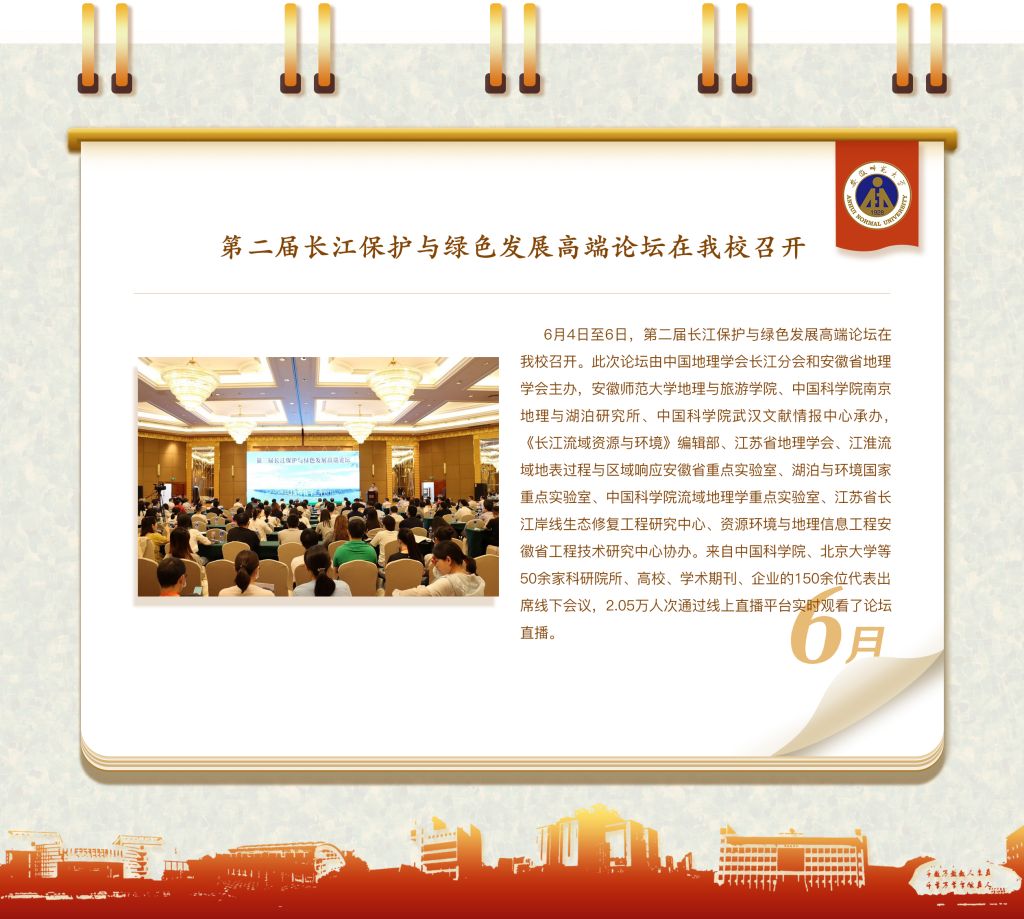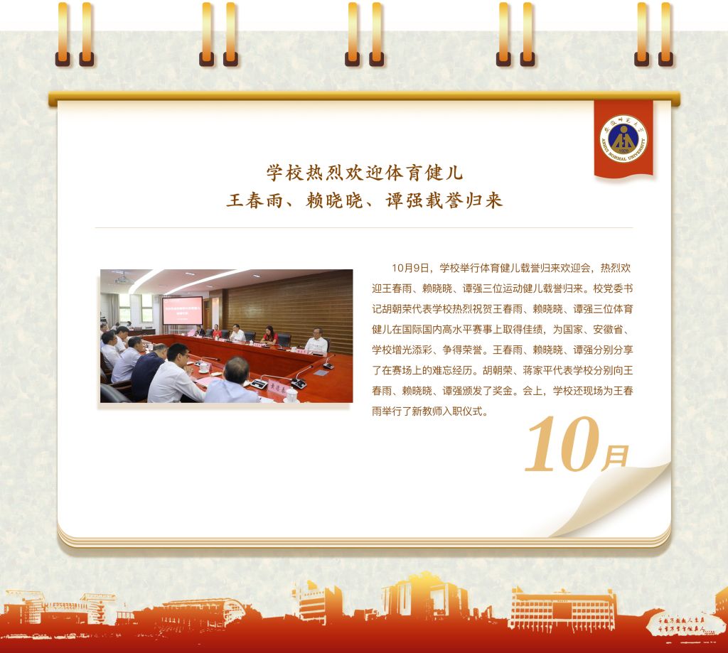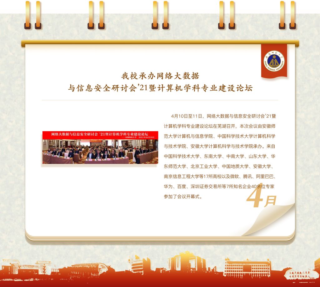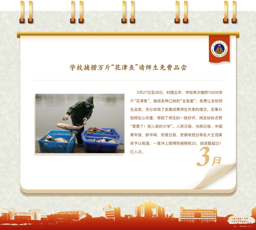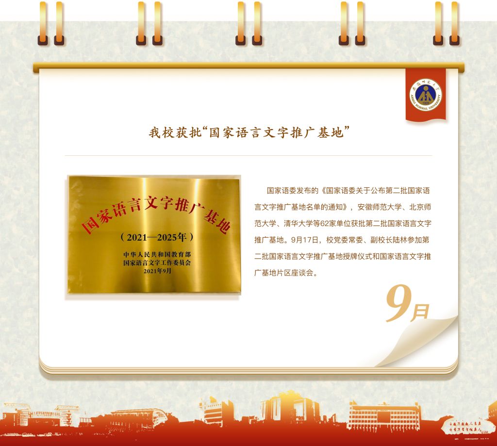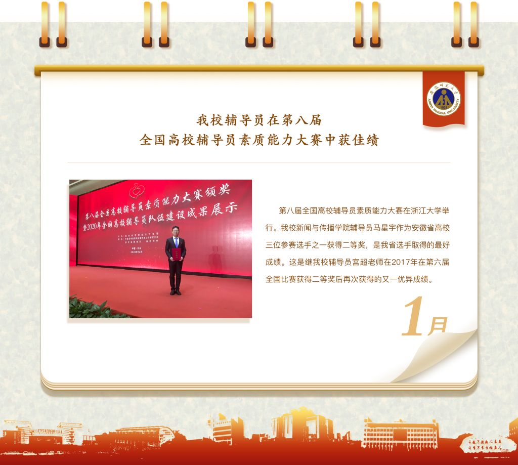 编者按 2021年是中国共产党成立100周年,是全面建设社会主义现代化国家新征程开启之年,也是“十四五”开局之年。这一年,党的十九届六中全会胜利召开,省第十一次党代会擘画安徽未来五年发展蓝图,校第九届教代会暨第七届工代会审议通过学校“十四五”事业发展规划……2021年,全体师大人凝心聚力、锐意进取,埋头苦干、勇毅前行,深入开展党史学习教育和“我为师生办实事”实践活动,加快推进高水平大学建设,在教学、科研、文化、服务等方面取得了丰硕成果。这一年,学校23个专业入选国家级、省级一流本科专业建设点,新增3个一级学科博士学位授权点、1个一级学科硕士学位授权点和6个硕士专业学位授权类别,我校学生工作被《人民日报》报道,路丙辉教授获评“全国优秀共产党员”并赴京参加庆祝中国共产党成立100周年有关活动,阮成武教授荣获“全国五一劳动奖章”,王春雨在东京奥运会上创造中国田径女子800米最好成绩,文科综合楼、教师教育实习实训中心等一大批新建筑顺利开工建设……一行行脚踏实地的足迹,印证了师大人干事创业的坚强定力;一次次永不止步的探索,书写了师大人追求卓越的强烈信念;一幅幅撸起袖子加油干的画面,诠释了师大人教书育人的初心和使命。