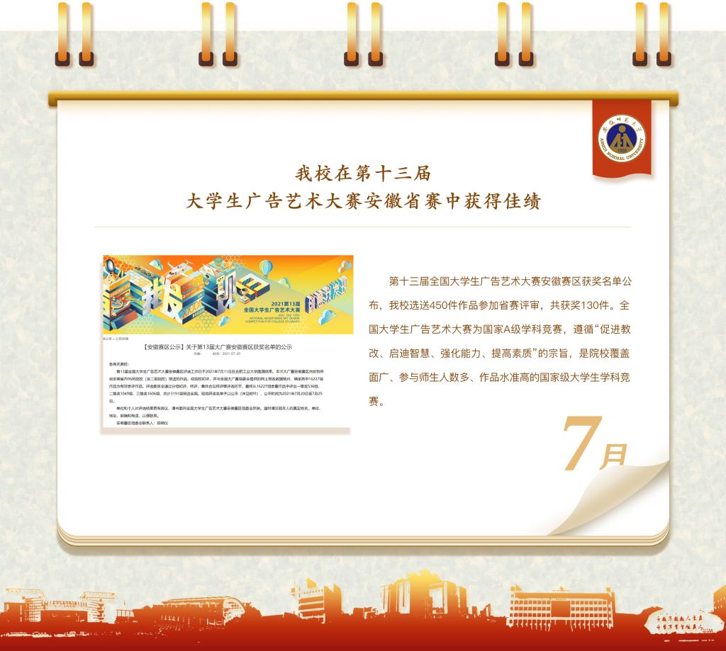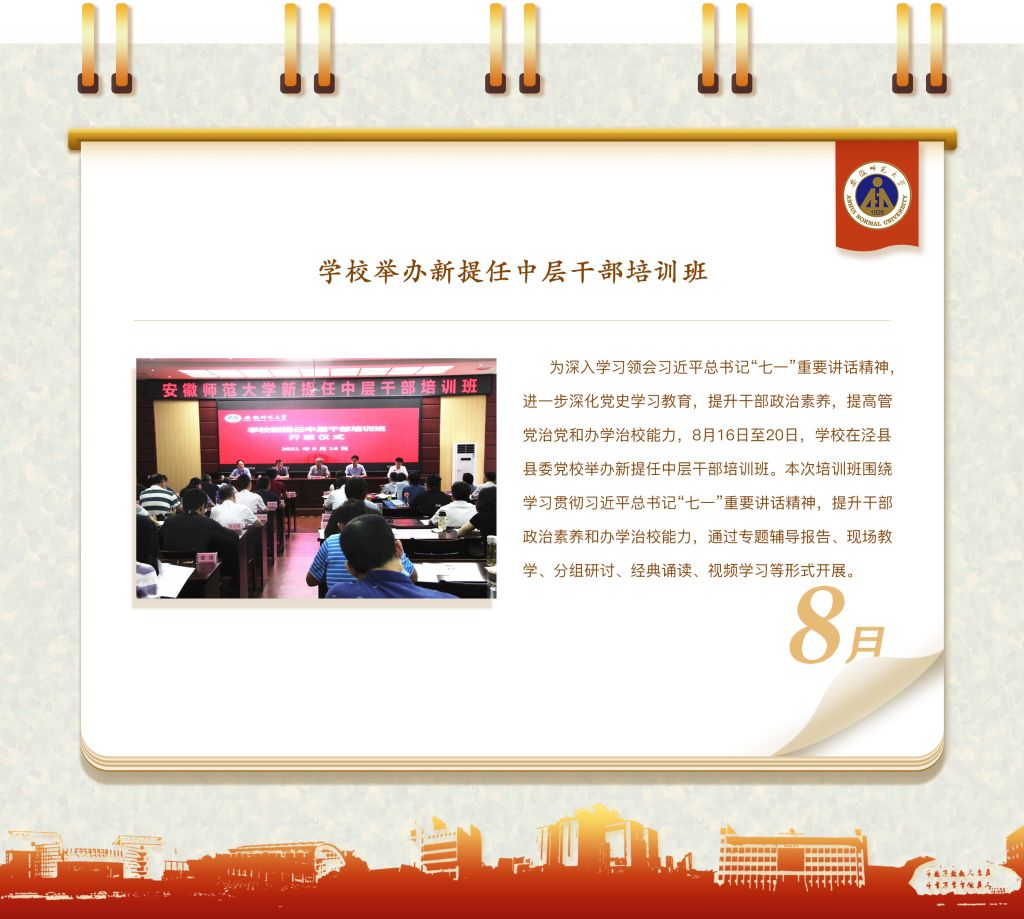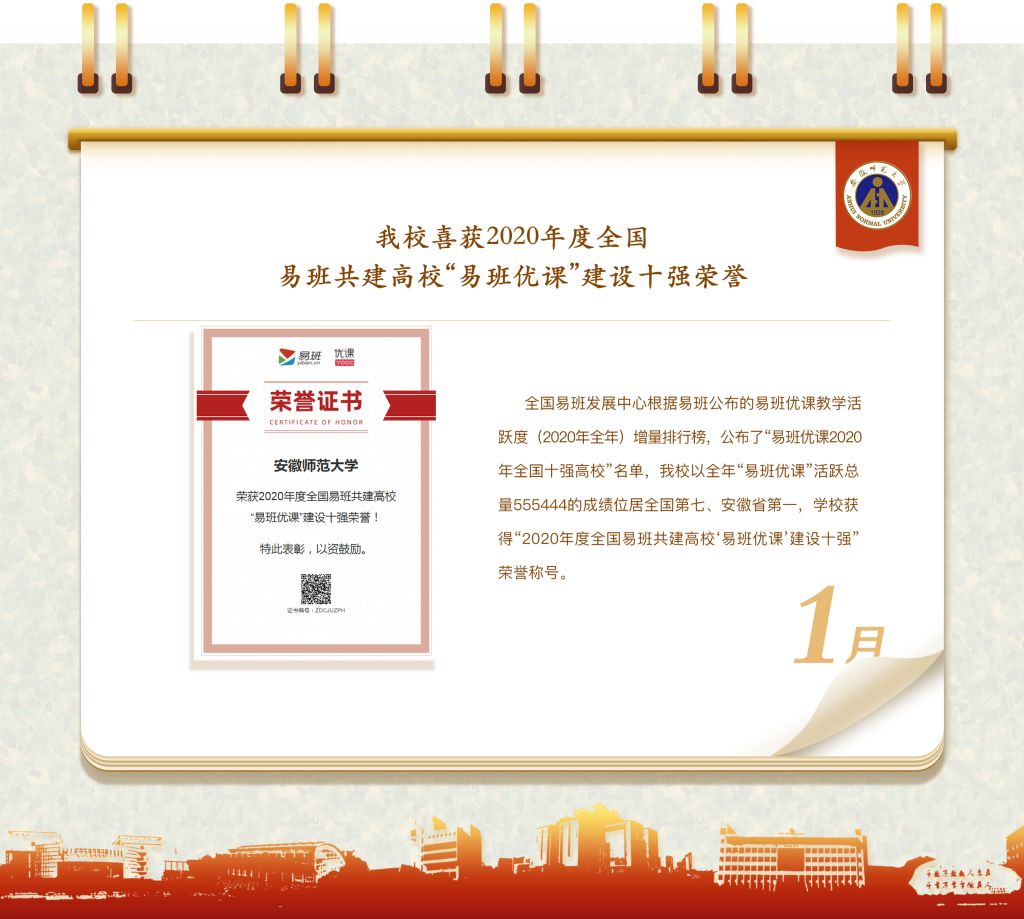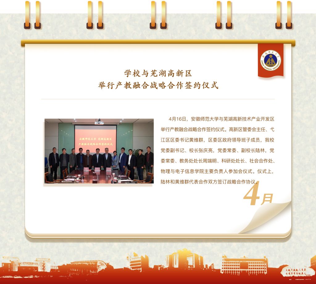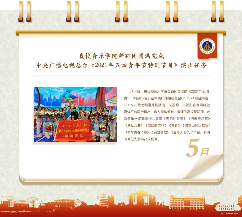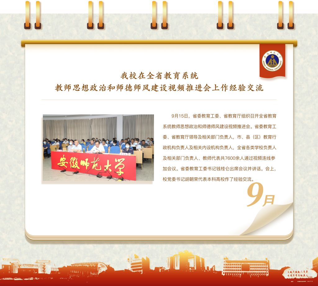 编者按 2021年是中国共产党成立100周年,是全面建设社会主义现代化国家新征程开启之年,也是“十四五”开局之年。这一年,党的十九届六中全会胜利召开,省第十一次党代会擘画安徽未来五年发展蓝图,校第九届教代会暨第七届工代会审议通过学校“十四五”事业发展规划……2021年,全体师大人凝心聚力、锐意进取,埋头苦干、勇毅前行,深入开展党史学习教育和“我为师生办实事”实践活动,加快推进高水平大学建设,在教学、科研、文化、服务等方面取得了丰硕成果。这一年,学校23个专业入选国家级、省级一流本科专业建设点,新增3个一级学科博士学位授权点、1个一级学科硕士学位授权点和6个硕士专业学位授权类别,我校学生工作被《人民日报》报道,路丙辉教授获评“全国优秀共产党员”并赴京参加庆祝中国共产党成立100周年有关活动,阮成武教授荣获“全国五一劳动奖章”,王春雨在东京奥运会上创造中国田径女子800米最好成绩,文科综合楼、教师教育实习实训中心等一大批新建筑顺利开工建设……一行行脚踏实地的足迹,印证了师大人干事创业的坚强定力;一次次永不止步的探索,书写了师大人追求卓越的强烈信念;一幅幅撸起袖子加油干的画面,诠释了师大人教书育人的初心和使命。