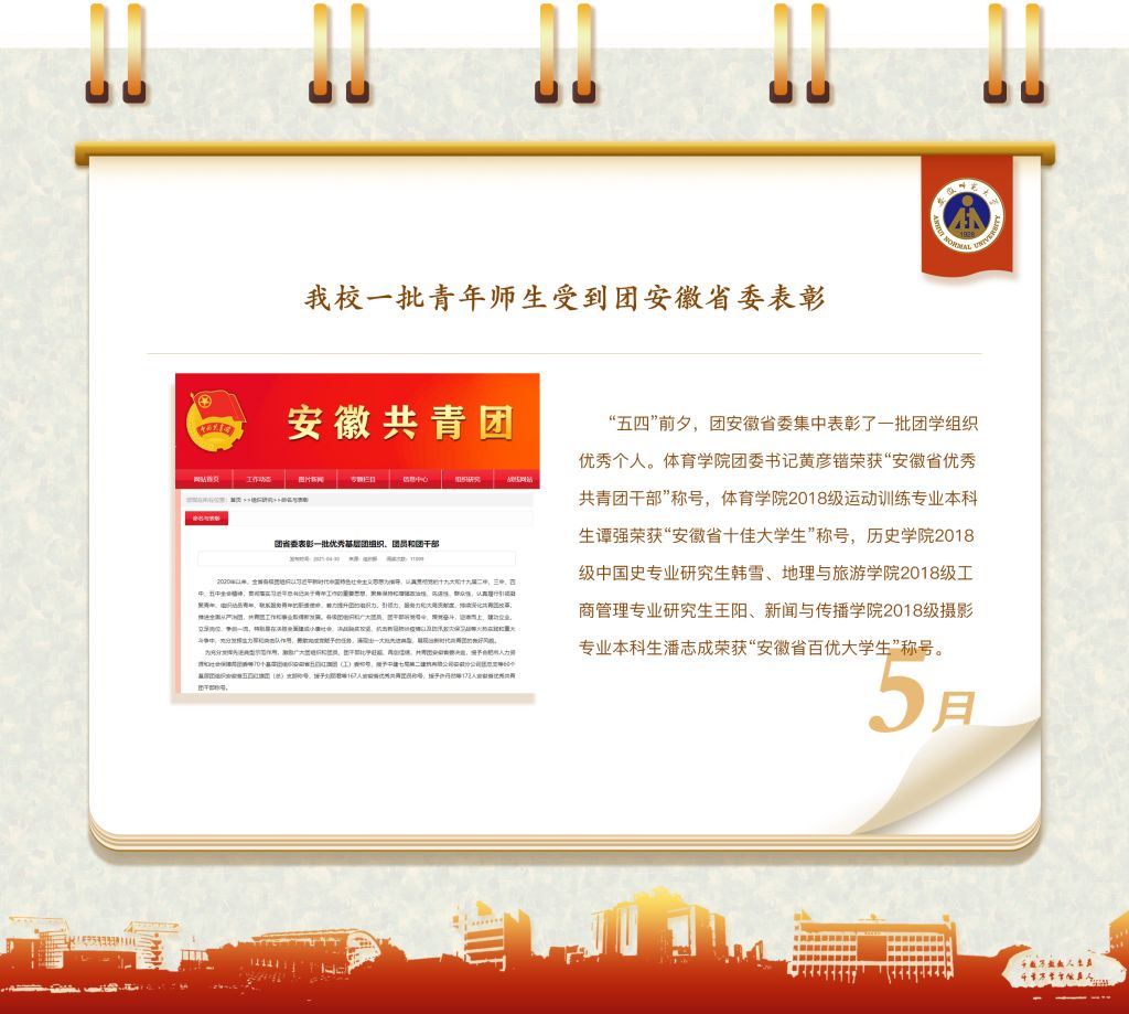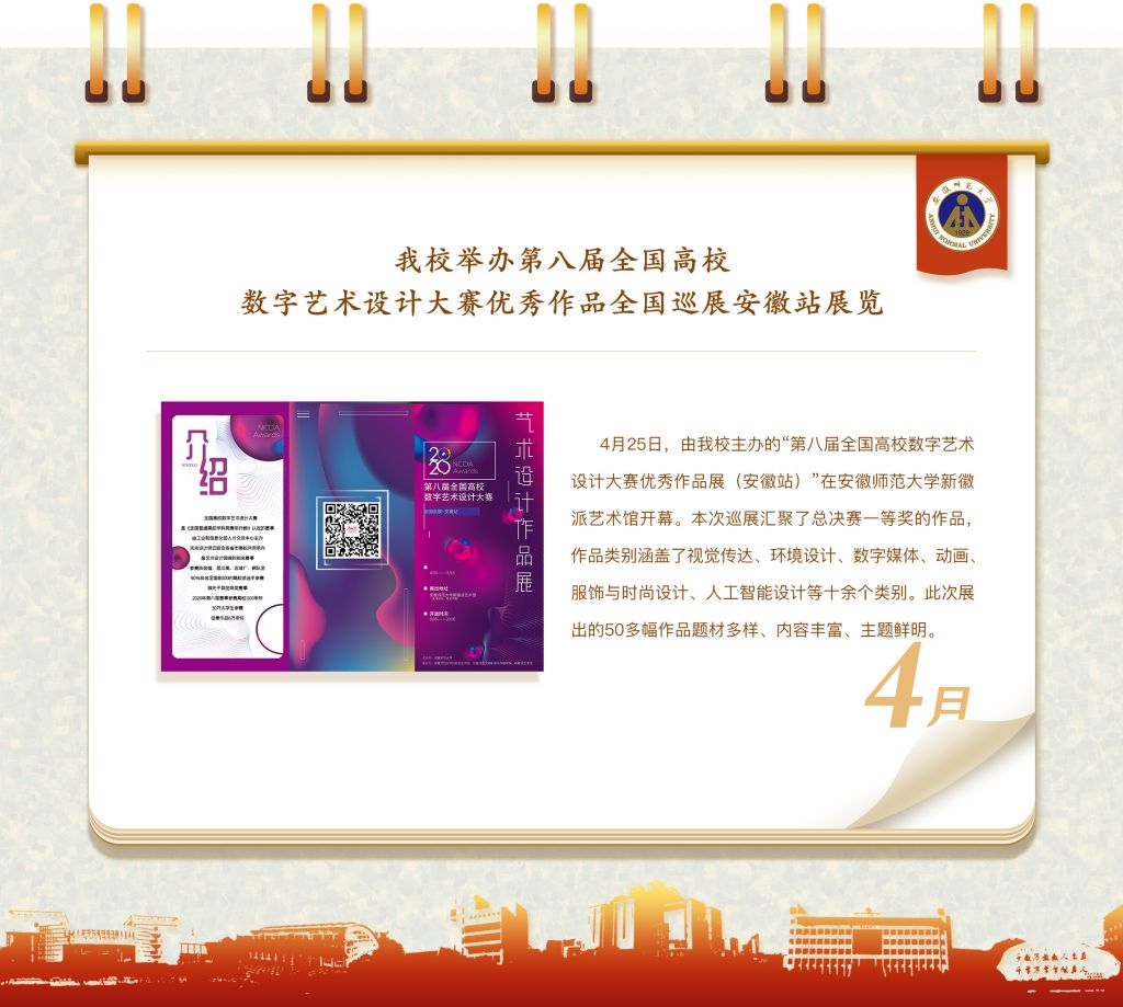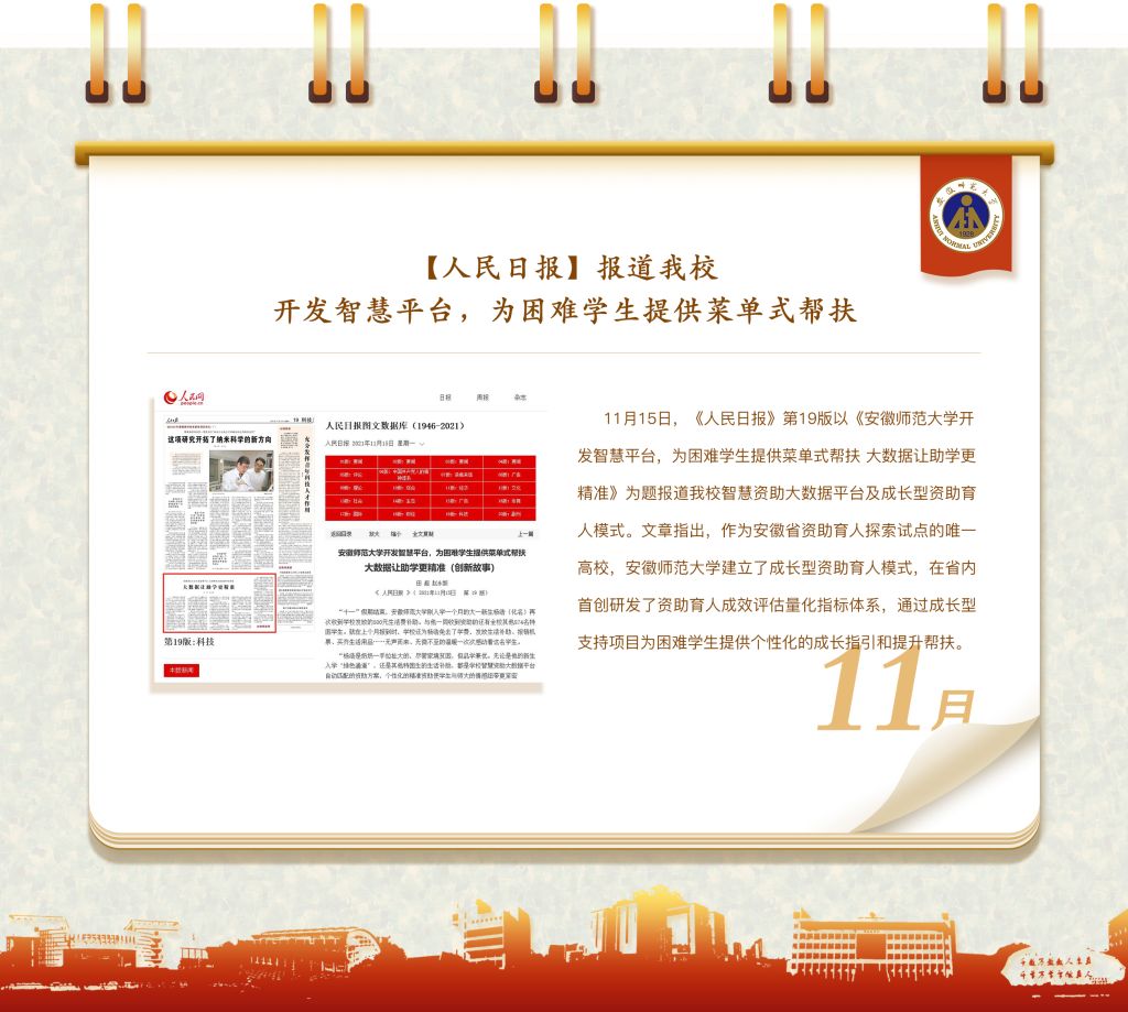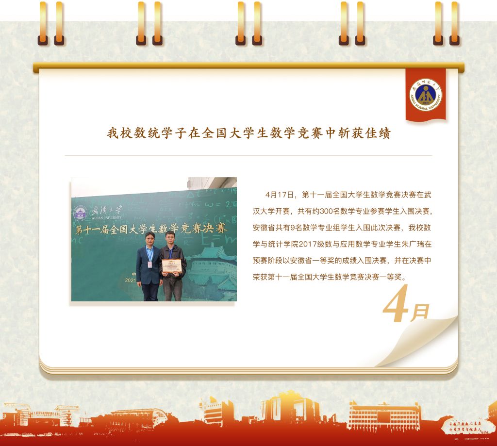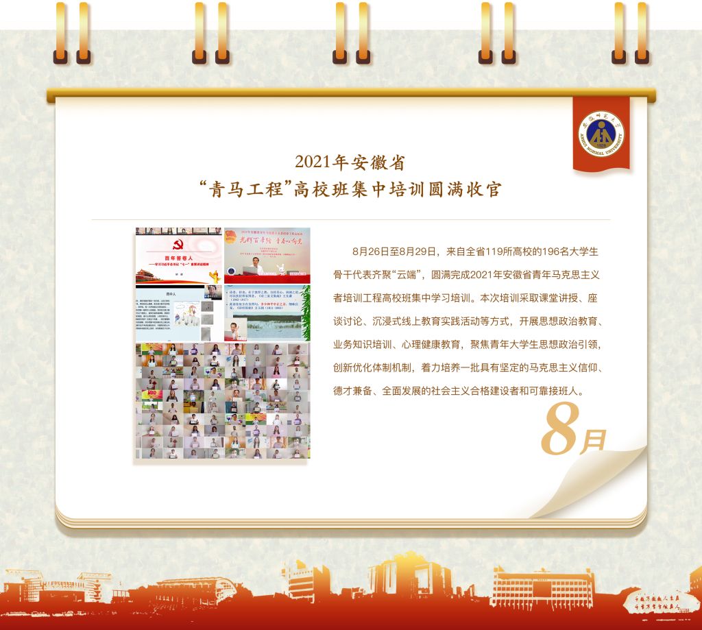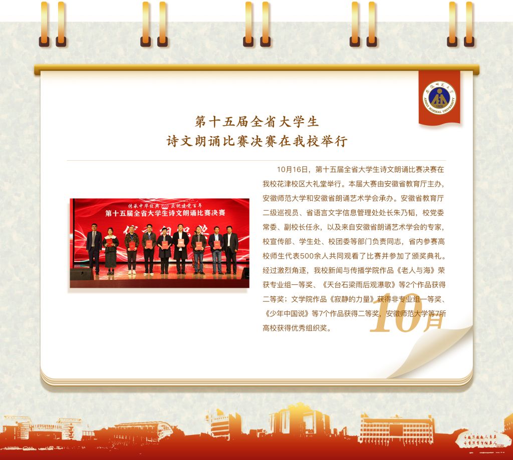 编者按 2021年是中国共产党成立100周年,是全面建设社会主义现代化国家新征程开启之年,也是“十四五”开局之年。这一年,党的十九届六中全会胜利召开,省第十一次党代会擘画安徽未来五年发展蓝图,校第九届教代会暨第七届工代会审议通过学校“十四五”事业发展规划……2021年,全体师大人凝心聚力、锐意进取,埋头苦干、勇毅前行,深入开展党史学习教育和“我为师生办实事”实践活动,加快推进高水平大学建设,在教学、科研、文化、服务等方面取得了丰硕成果。这一年,学校23个专业入选国家级、省级一流本科专业建设点,新增3个一级学科博士学位授权点、1个一级学科硕士学位授权点和6个硕士专业学位授权类别,我校学生工作被《人民日报》报道,路丙辉教授获评“全国优秀共产党员”并赴京参加庆祝中国共产党成立100周年有关活动,阮成武教授荣获“全国五一劳动奖章”,王春雨在东京奥运会上创造中国田径女子800米最好成绩,文科综合楼、教师教育实习实训中心等一大批新建筑顺利开工建设……一行行脚踏实地的足迹,印证了师大人干事创业的坚强定力;一次次永不止步的探索,书写了师大人追求卓越的强烈信念;一幅幅撸起袖子加油干的画面,诠释了师大人教书育人的初心和使命。