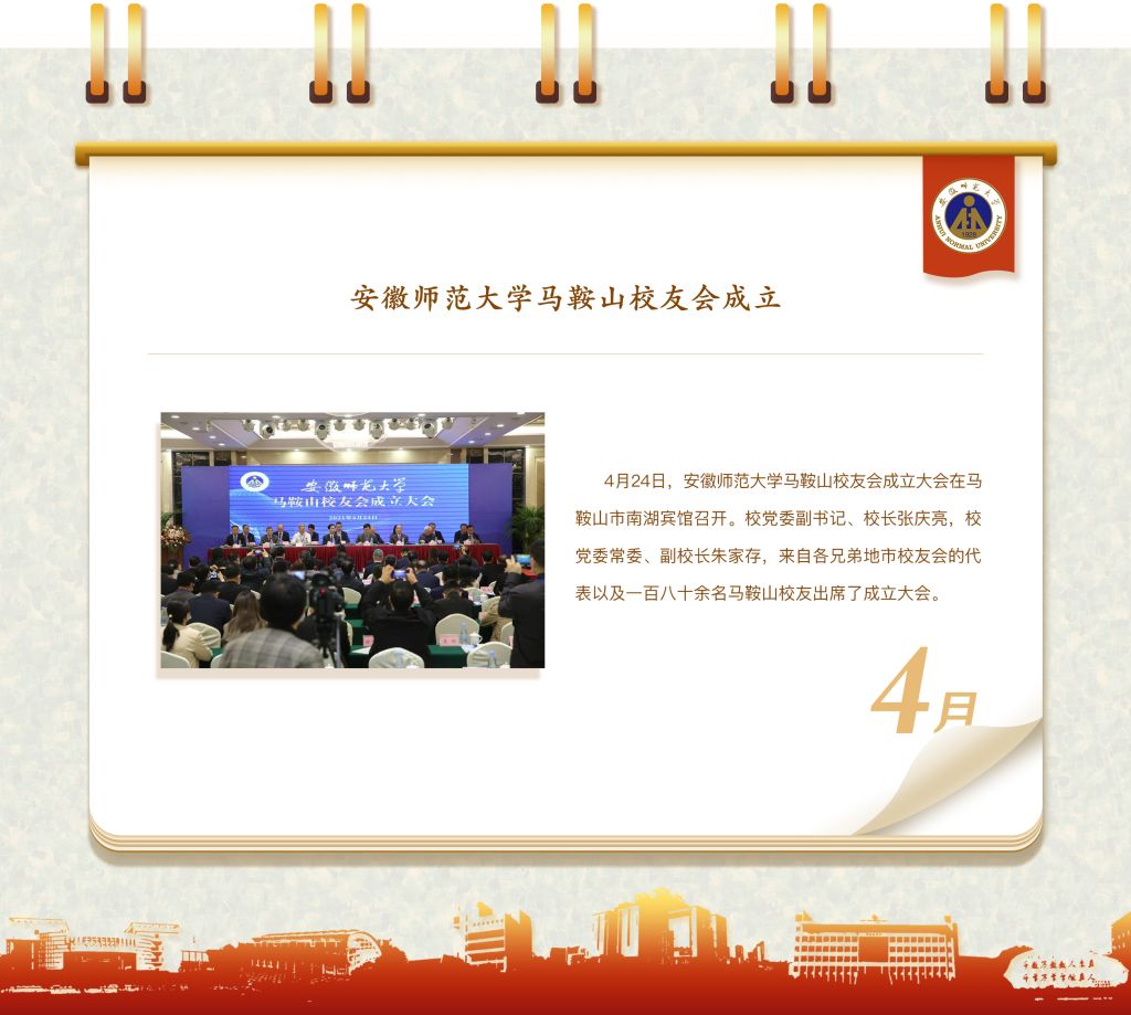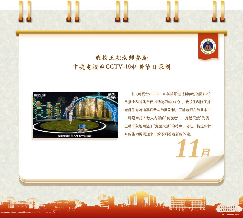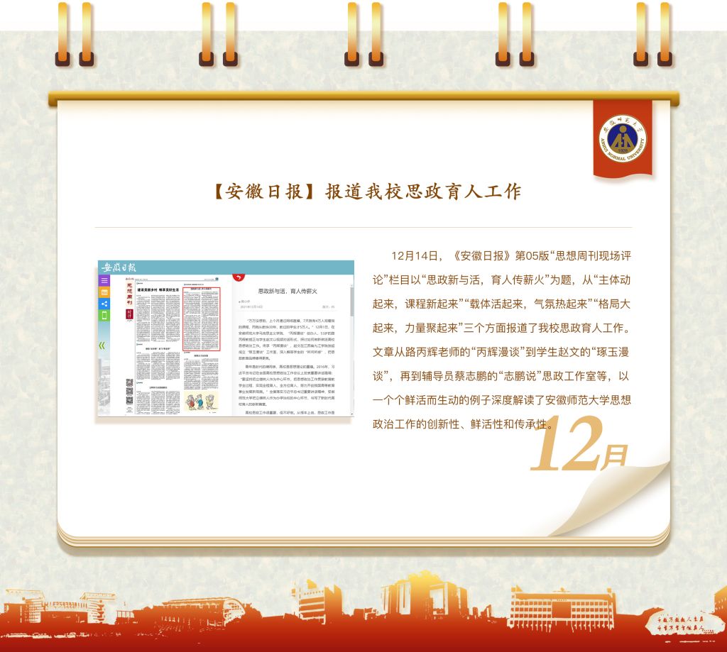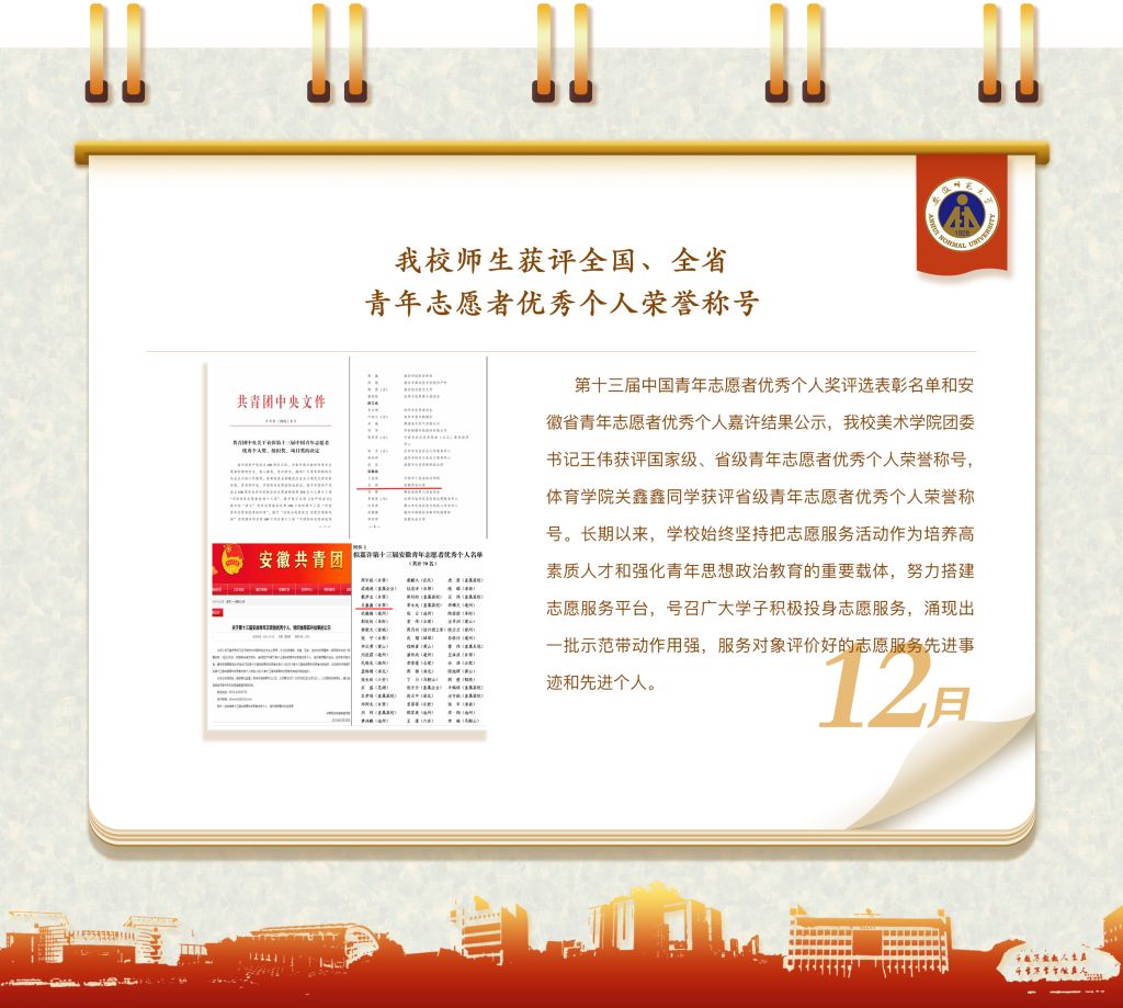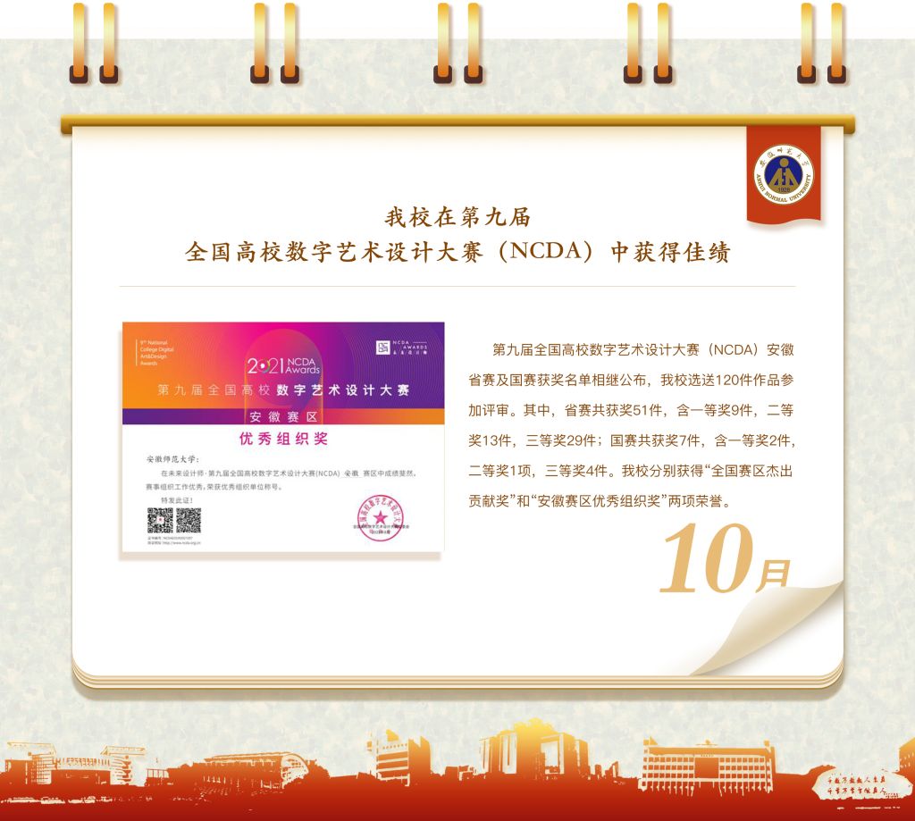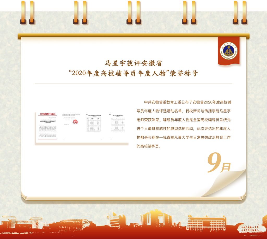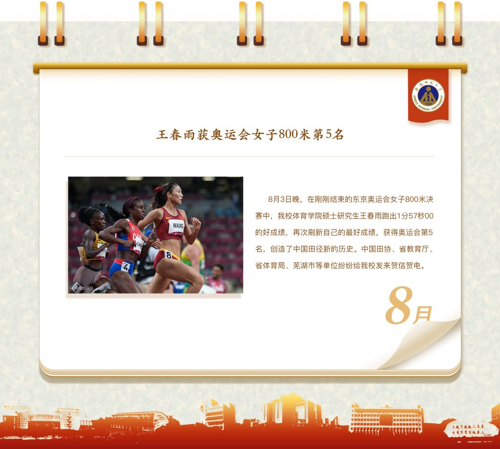 编者按 2021年是中国共产党成立100周年,是全面建设社会主义现代化国家新征程开启之年,也是“十四五”开局之年。这一年,党的十九届六中全会胜利召开,省第十一次党代会擘画安徽未来五年发展蓝图,校第九届教代会暨第七届工代会审议通过学校“十四五”事业发展规划……2021年,全体师大人凝心聚力、锐意进取,埋头苦干、勇毅前行,深入开展党史学习教育和“我为师生办实事”实践活动,加快推进高水平大学建设,在教学、科研、文化、服务等方面取得了丰硕成果。这一年,学校23个专业入选国家级、省级一流本科专业建设点,新增3个一级学科博士学位授权点、1个一级学科硕士学位授权点和6个硕士专业学位授权类别,我校学生工作被《人民日报》报道,路丙辉教授获评“全国优秀共产党员”并赴京参加庆祝中国共产党成立100周年有关活动,阮成武教授荣获“全国五一劳动奖章”,王春雨在东京奥运会上创造中国田径女子800米最好成绩,文科综合楼、教师教育实习实训中心等一大批新建筑顺利开工建设……一行行脚踏实地的足迹,印证了师大人干事创业的坚强定力;一次次永不止步的探索,书写了师大人追求卓越的强烈信念;一幅幅撸起袖子加油干的画面,诠释了师大人教书育人的初心和使命。