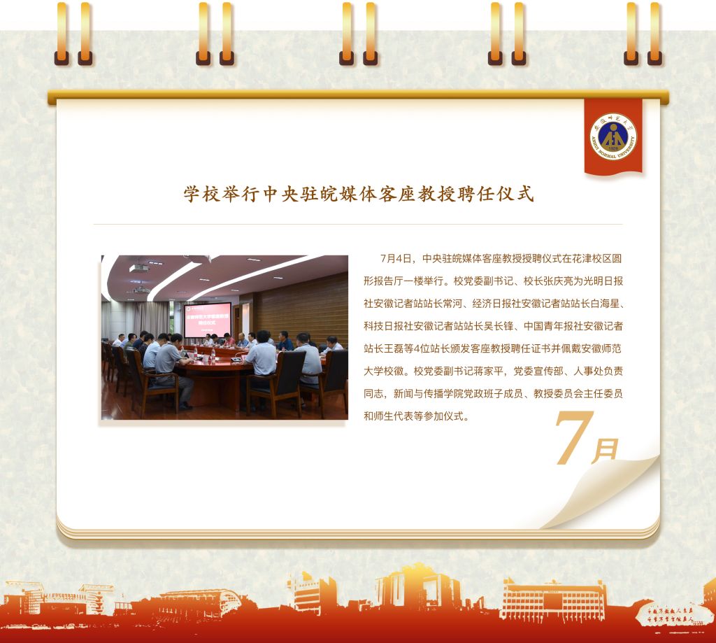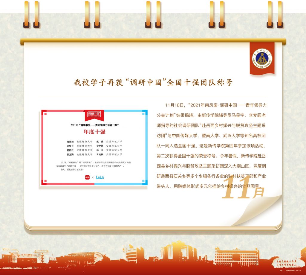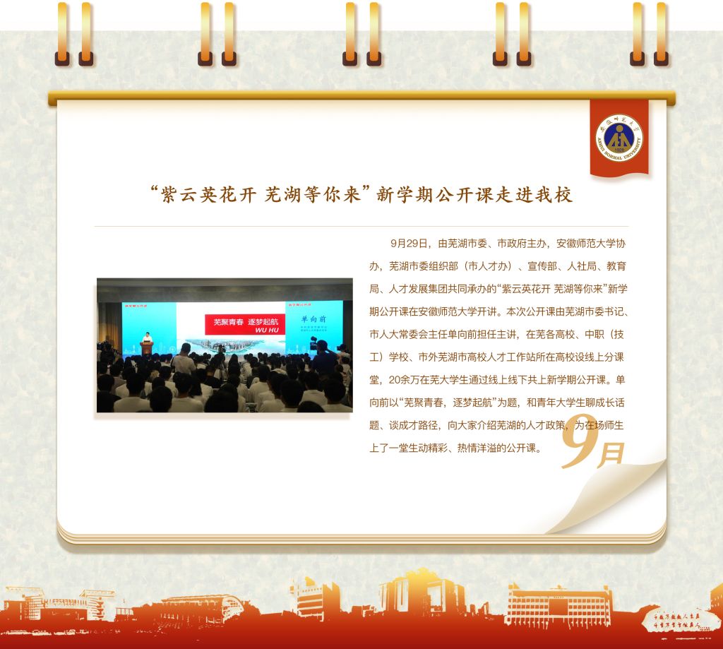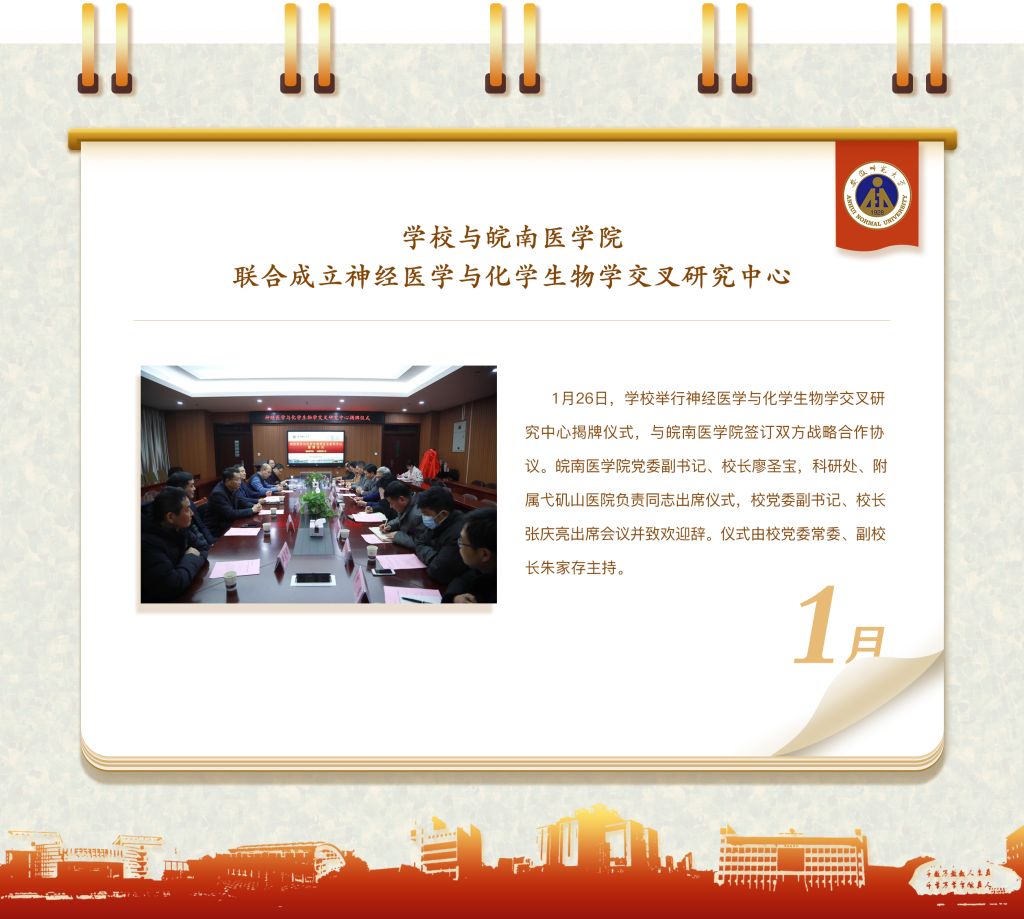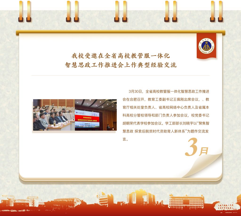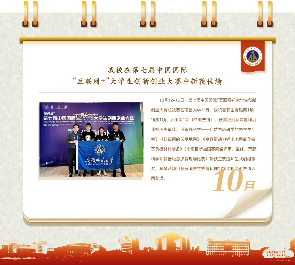 编者按 2021年是中国共产党成立100周年,是全面建设社会主义现代化国家新征程开启之年,也是“十四五”开局之年。这一年,党的十九届六中全会胜利召开,省第十一次党代会擘画安徽未来五年发展蓝图,校第九届教代会暨第七届工代会审议通过学校“十四五”事业发展规划……2021年,全体师大人凝心聚力、锐意进取,埋头苦干、勇毅前行,深入开展党史学习教育和“我为师生办实事”实践活动,加快推进高水平大学建设,在教学、科研、文化、服务等方面取得了丰硕成果。这一年,学校23个专业入选国家级、省级一流本科专业建设点,新增3个一级学科博士学位授权点、1个一级学科硕士学位授权点和6个硕士专业学位授权类别,我校学生工作被《人民日报》报道,路丙辉教授获评“全国优秀共产党员”并赴京参加庆祝中国共产党成立100周年有关活动,阮成武教授荣获“全国五一劳动奖章”,王春雨在东京奥运会上创造中国田径女子800米最好成绩,文科综合楼、教师教育实习实训中心等一大批新建筑顺利开工建设……一行行脚踏实地的足迹,印证了师大人干事创业的坚强定力;一次次永不止步的探索,书写了师大人追求卓越的强烈信念;一幅幅撸起袖子加油干的画面,诠释了师大人教书育人的初心和使命。