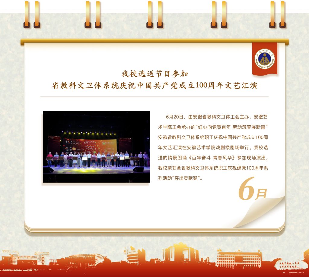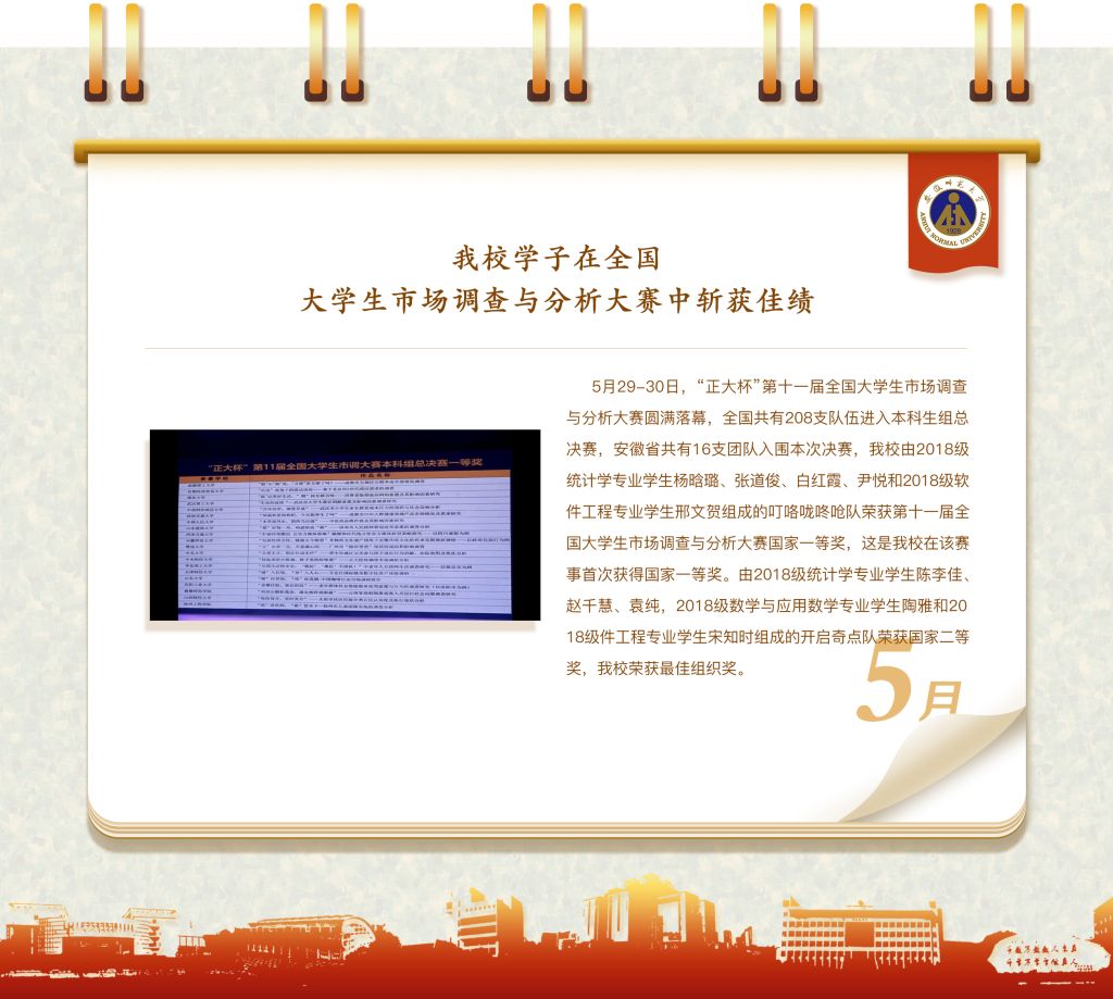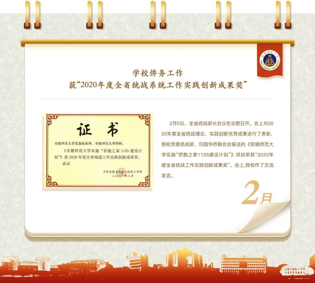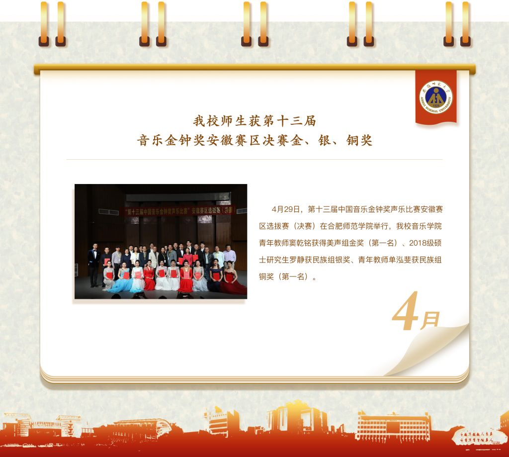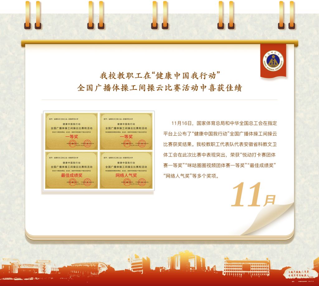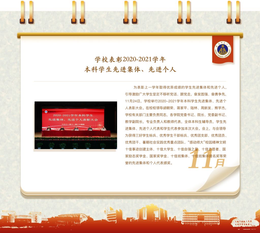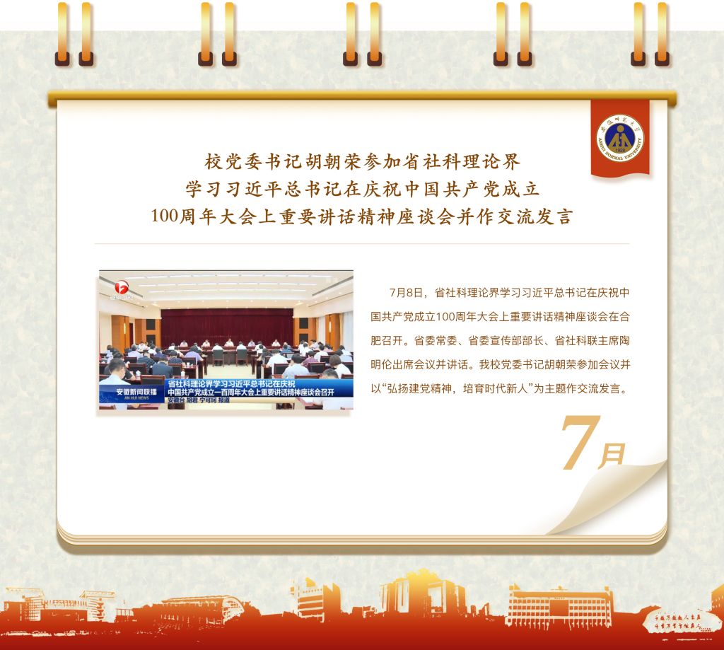 编者按 2021年是中国共产党成立100周年,是全面建设社会主义现代化国家新征程开启之年,也是“十四五”开局之年。这一年,党的十九届六中全会胜利召开,省第十一次党代会擘画安徽未来五年发展蓝图,校第九届教代会暨第七届工代会审议通过学校“十四五”事业发展规划……2021年,全体师大人凝心聚力、锐意进取,埋头苦干、勇毅前行,深入开展党史学习教育和“我为师生办实事”实践活动,加快推进高水平大学建设,在教学、科研、文化、服务等方面取得了丰硕成果。这一年,学校23个专业入选国家级、省级一流本科专业建设点,新增3个一级学科博士学位授权点、1个一级学科硕士学位授权点和6个硕士专业学位授权类别,我校学生工作被《人民日报》报道,路丙辉教授获评“全国优秀共产党员”并赴京参加庆祝中国共产党成立100周年有关活动,阮成武教授荣获“全国五一劳动奖章”,王春雨在东京奥运会上创造中国田径女子800米最好成绩,文科综合楼、教师教育实习实训中心等一大批新建筑顺利开工建设……一行行脚踏实地的足迹,印证了师大人干事创业的坚强定力;一次次永不止步的探索,书写了师大人追求卓越的强烈信念;一幅幅撸起袖子加油干的画面,诠释了师大人教书育人的初心和使命。