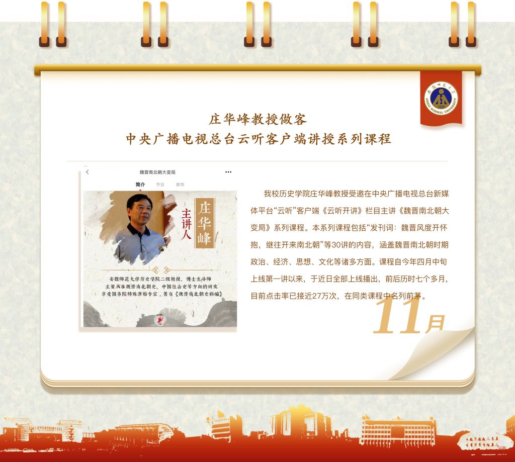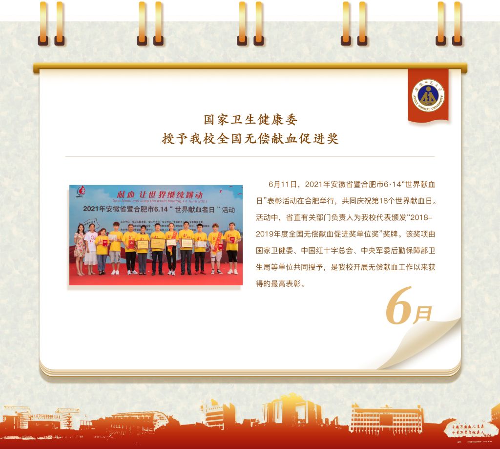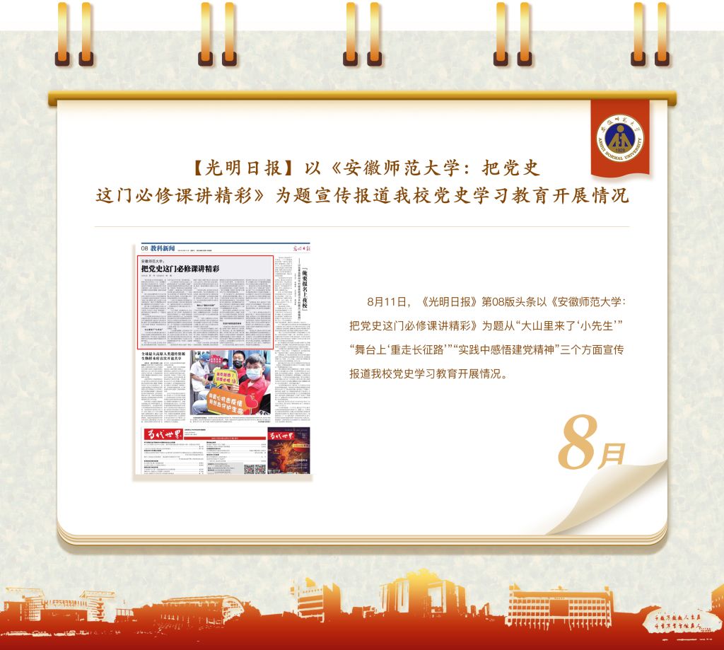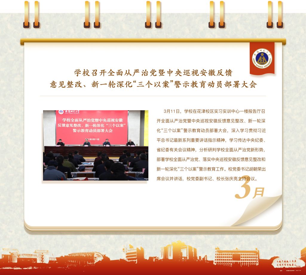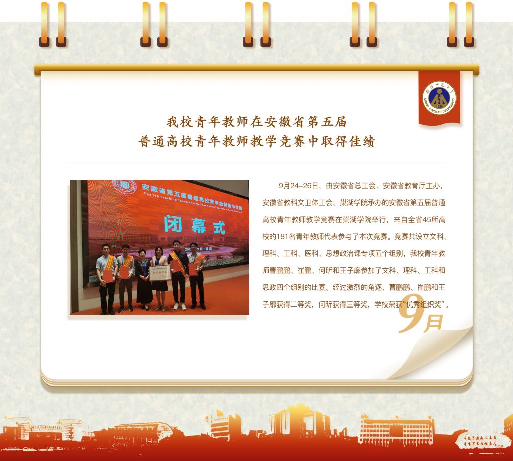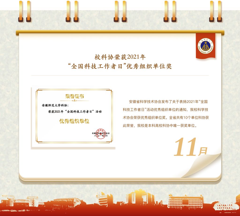编者按 2021年是中国共产党成立100周年,是全面建设社会主义现代化国家新征程开启之年,也是“十四五”开局之年。这一年,党的十九届六中全会胜利召开,省第十一次党代会擘画安徽未来五年发展蓝图,校第九届教代会暨第七届工代会审议通过学校“十四五”事业发展规划……2021年,全体师大人凝心聚力、锐意进取,埋头苦干、勇毅前行,深入开展党史学习教育和“我为师生办实事”实践活动,加快推进高水平大学建设,在教学、科研、文化、服务等方面取得了丰硕成果。这一年,学校23个专业入选国家级、省级一流本科专业建设点,新增3个一级学科博士学位授权点、1个一级学科硕士学位授权点和6个硕士专业学位授权类别,我校学生工作被《人民日报》报道,路丙辉教授获评“全国优秀共产党员”并赴京参加庆祝中国共产党成立100周年有关活动,阮成武教授荣获“全国五一劳动奖章”,王春雨在东京奥运会上创造中国田径女子800米最好成绩,文科综合楼、教师教育实习实训中心等一大批新建筑顺利开工建设……一行行脚踏实地的足迹,印证了师大人干事创业的坚强定力;一次次永不止步的探索,书写了师大人追求卓越的强烈信念;一幅幅撸起袖子加油干的画面,诠释了师大人教书育人的初心和使命。