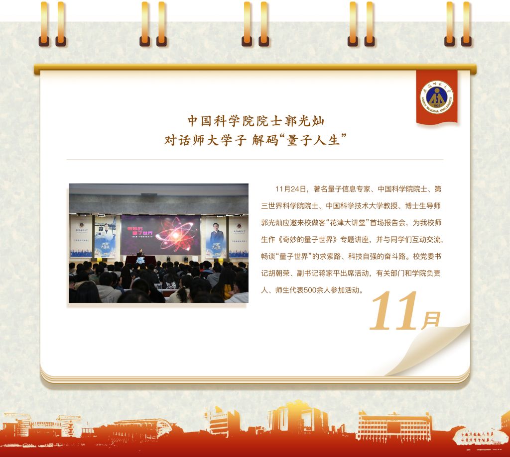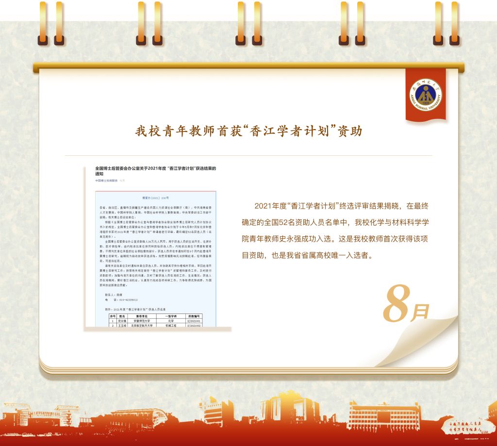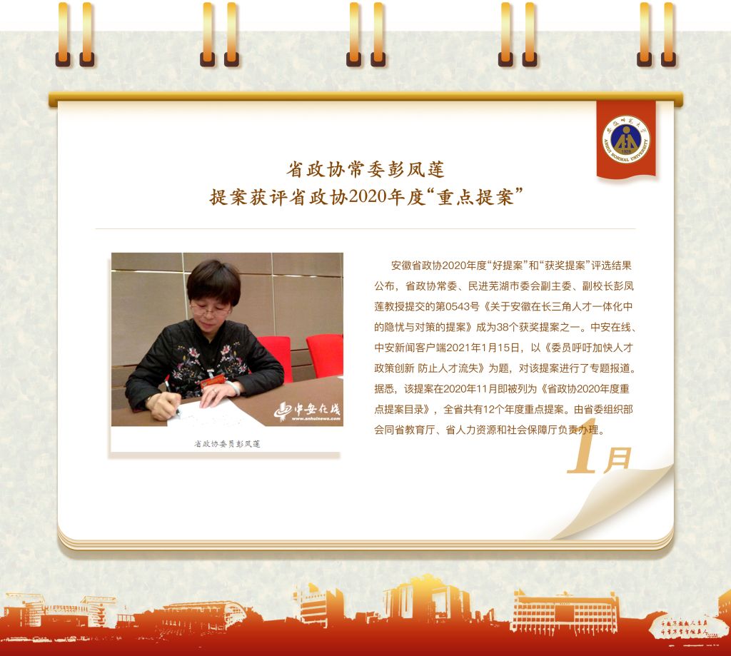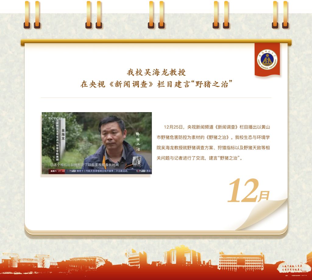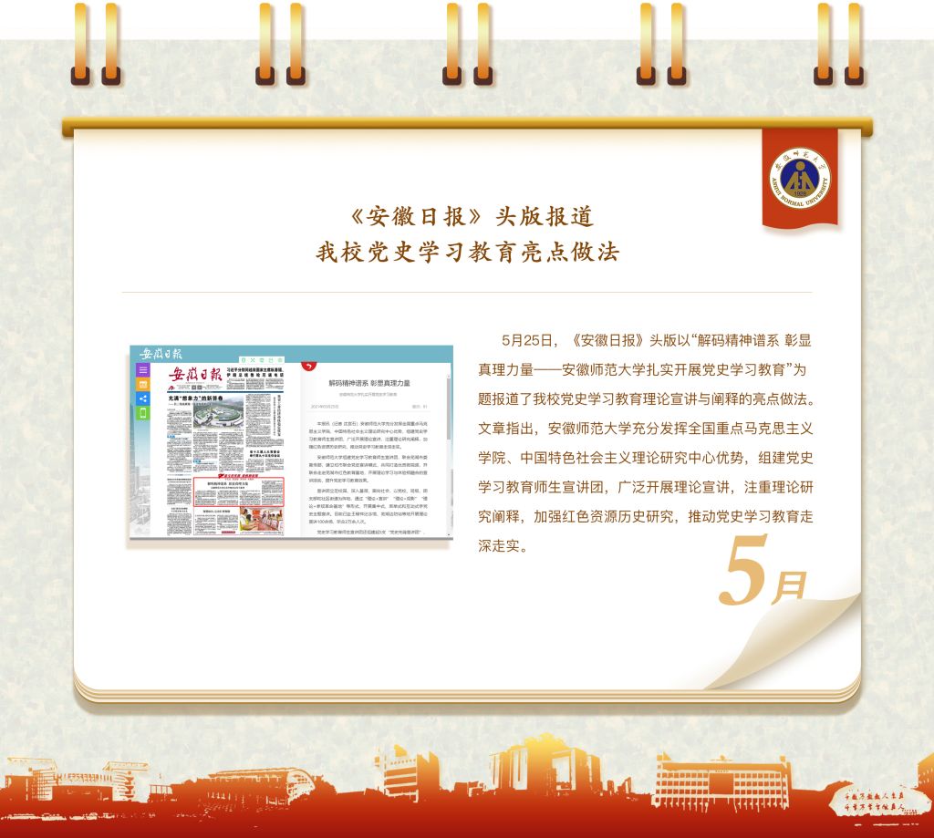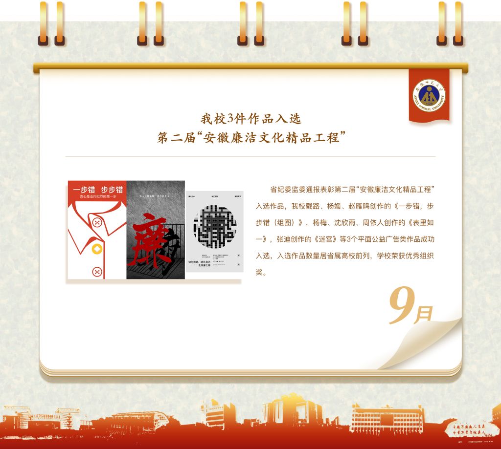 编者按 2021年是中国共产党成立100周年,是全面建设社会主义现代化国家新征程开启之年,也是“十四五”开局之年。这一年,党的十九届六中全会胜利召开,省第十一次党代会擘画安徽未来五年发展蓝图,校第九届教代会暨第七届工代会审议通过学校“十四五”事业发展规划……2021年,全体师大人凝心聚力、锐意进取,埋头苦干、勇毅前行,深入开展党史学习教育和“我为师生办实事”实践活动,加快推进高水平大学建设,在教学、科研、文化、服务等方面取得了丰硕成果。这一年,学校23个专业入选国家级、省级一流本科专业建设点,新增3个一级学科博士学位授权点、1个一级学科硕士学位授权点和6个硕士专业学位授权类别,我校学生工作被《人民日报》报道,路丙辉教授获评“全国优秀共产党员”并赴京参加庆祝中国共产党成立100周年有关活动,阮成武教授荣获“全国五一劳动奖章”,王春雨在东京奥运会上创造中国田径女子800米最好成绩,文科综合楼、教师教育实习实训中心等一大批新建筑顺利开工建设……一行行脚踏实地的足迹,印证了师大人干事创业的坚强定力;一次次永不止步的探索,书写了师大人追求卓越的强烈信念;一幅幅撸起袖子加油干的画面,诠释了师大人教书育人的初心和使命。