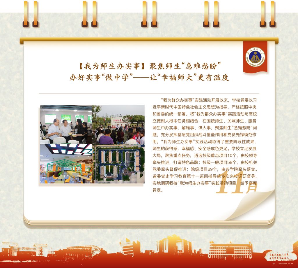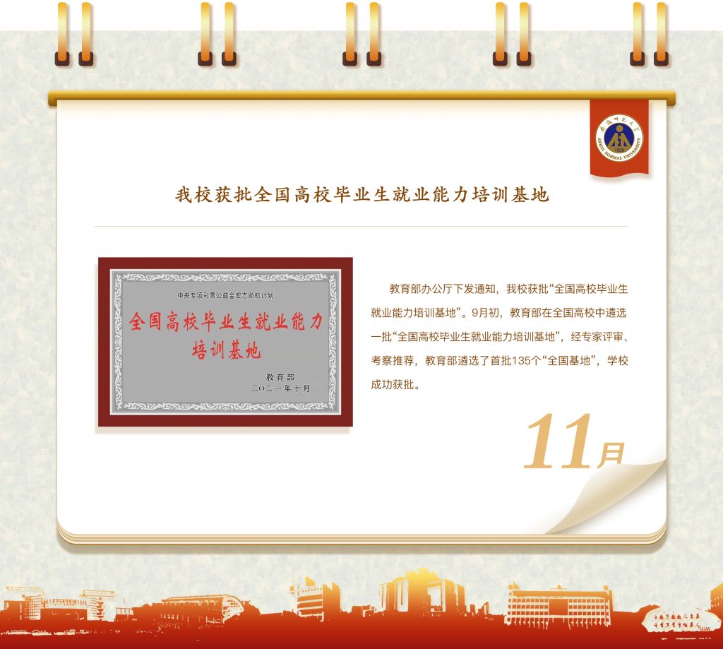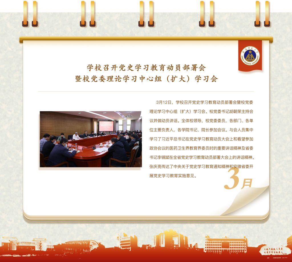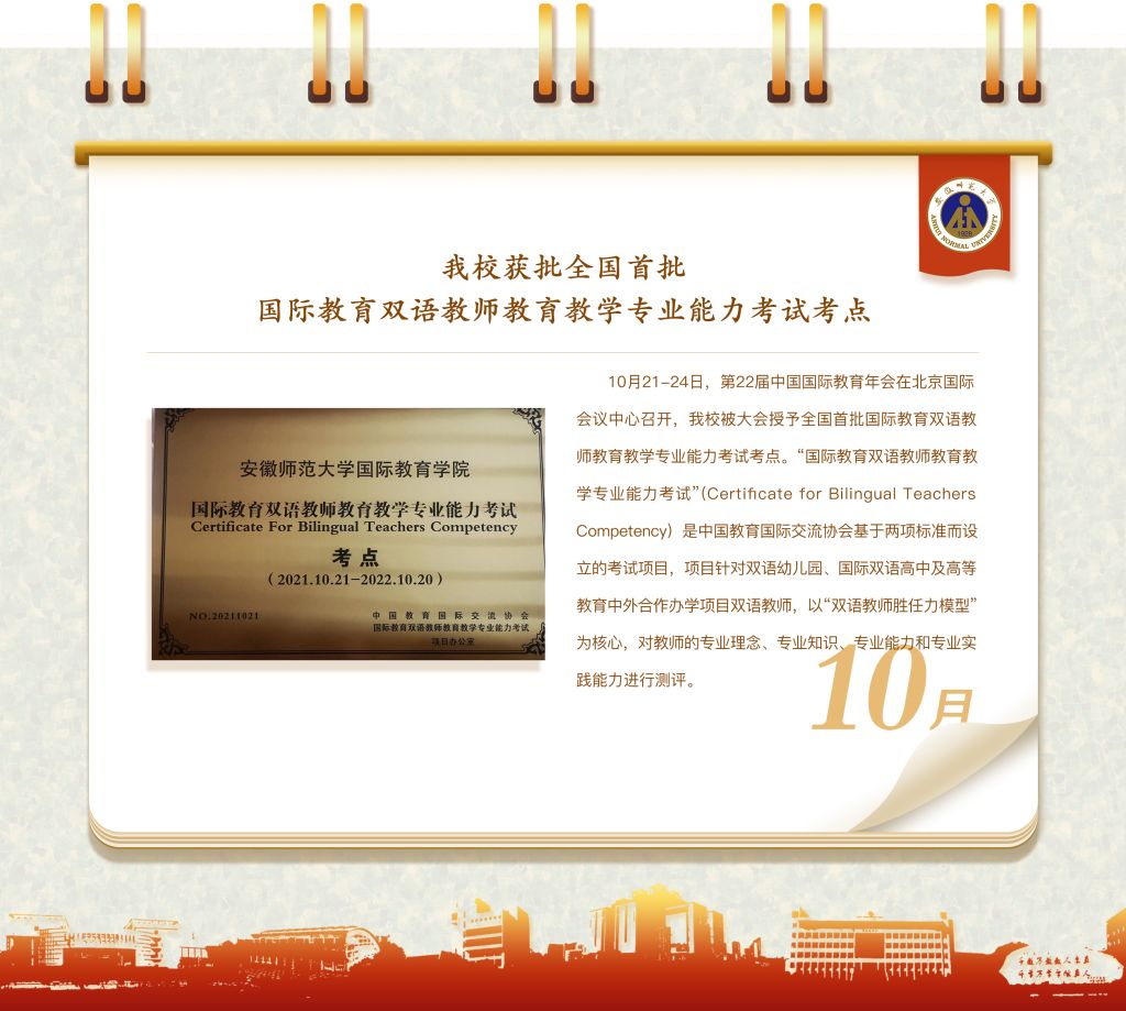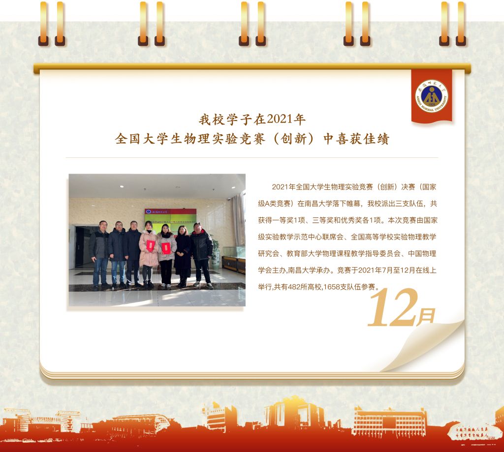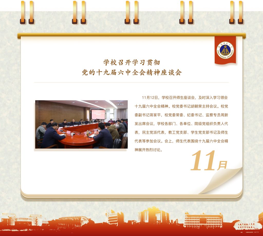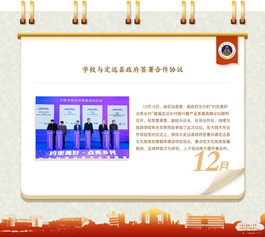 编者按 2021年是中国共产党成立100周年,是全面建设社会主义现代化国家新征程开启之年,也是“十四五”开局之年。这一年,党的十九届六中全会胜利召开,省第十一次党代会擘画安徽未来五年发展蓝图,校第九届教代会暨第七届工代会审议通过学校“十四五”事业发展规划……2021年,全体师大人凝心聚力、锐意进取,埋头苦干、勇毅前行,深入开展党史学习教育和“我为师生办实事”实践活动,加快推进高水平大学建设,在教学、科研、文化、服务等方面取得了丰硕成果。这一年,学校23个专业入选国家级、省级一流本科专业建设点,新增3个一级学科博士学位授权点、1个一级学科硕士学位授权点和6个硕士专业学位授权类别,我校学生工作被《人民日报》报道,路丙辉教授获评“全国优秀共产党员”并赴京参加庆祝中国共产党成立100周年有关活动,阮成武教授荣获“全国五一劳动奖章”,王春雨在东京奥运会上创造中国田径女子800米最好成绩,文科综合楼、教师教育实习实训中心等一大批新建筑顺利开工建设……一行行脚踏实地的足迹,印证了师大人干事创业的坚强定力;一次次永不止步的探索,书写了师大人追求卓越的强烈信念;一幅幅撸起袖子加油干的画面,诠释了师大人教书育人的初心和使命。