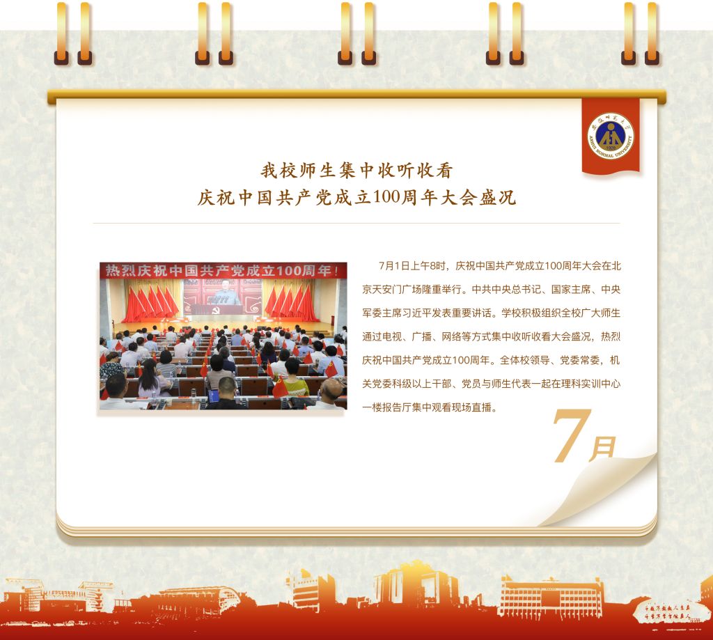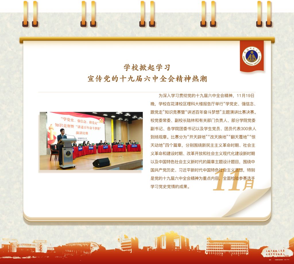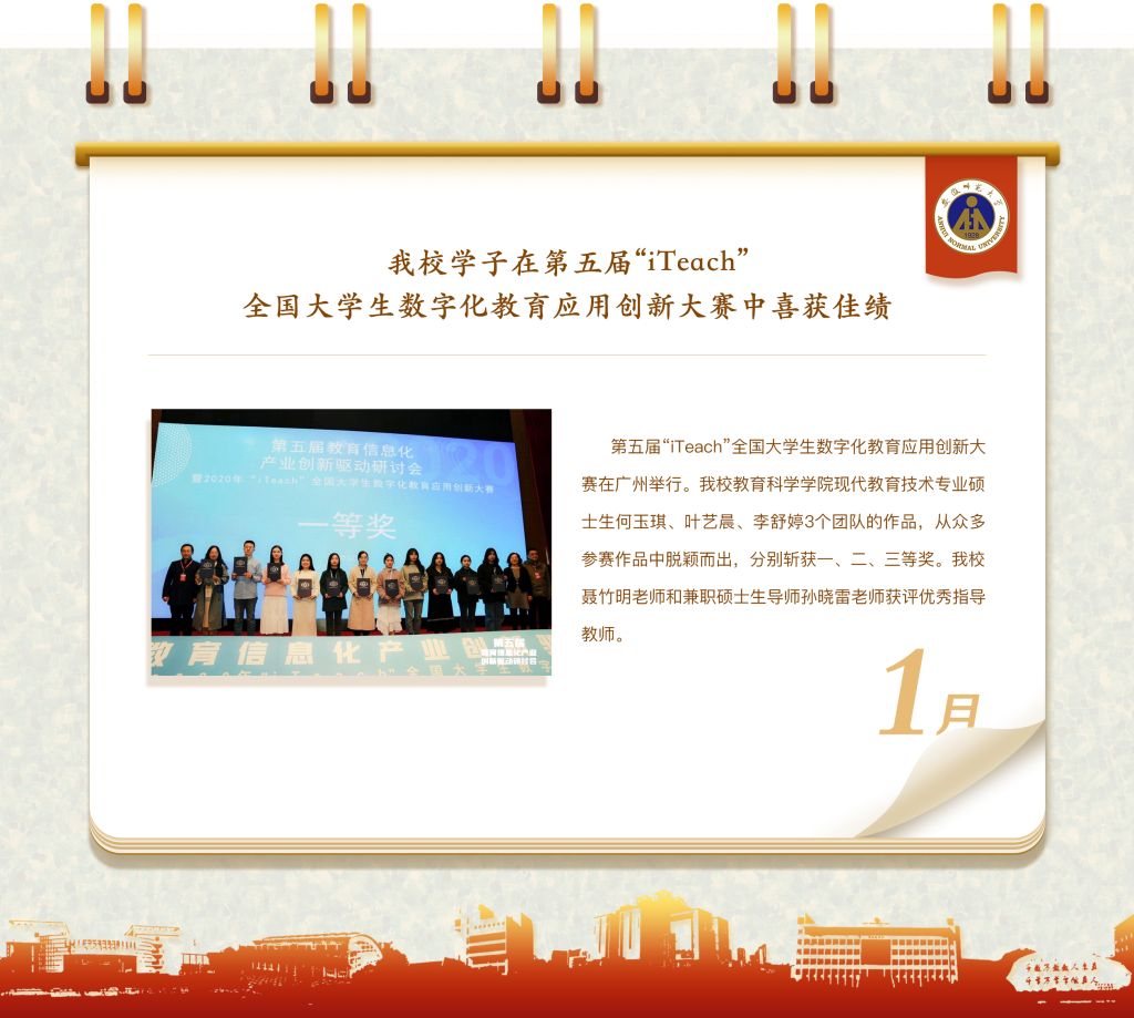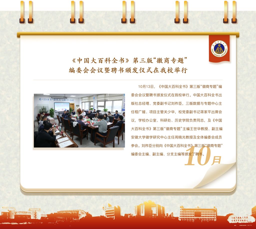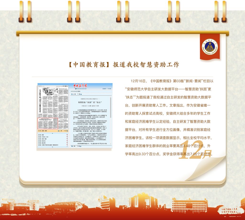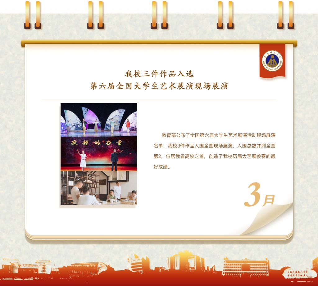 编者按 2021年是中国共产党成立100周年,是全面建设社会主义现代化国家新征程开启之年,也是“十四五”开局之年。这一年,党的十九届六中全会胜利召开,省第十一次党代会擘画安徽未来五年发展蓝图,校第九届教代会暨第七届工代会审议通过学校“十四五”事业发展规划……2021年,全体师大人凝心聚力、锐意进取,埋头苦干、勇毅前行,深入开展党史学习教育和“我为师生办实事”实践活动,加快推进高水平大学建设,在教学、科研、文化、服务等方面取得了丰硕成果。这一年,学校23个专业入选国家级、省级一流本科专业建设点,新增3个一级学科博士学位授权点、1个一级学科硕士学位授权点和6个硕士专业学位授权类别,我校学生工作被《人民日报》报道,路丙辉教授获评“全国优秀共产党员”并赴京参加庆祝中国共产党成立100周年有关活动,阮成武教授荣获“全国五一劳动奖章”,王春雨在东京奥运会上创造中国田径女子800米最好成绩,文科综合楼、教师教育实习实训中心等一大批新建筑顺利开工建设……一行行脚踏实地的足迹,印证了师大人干事创业的坚强定力;一次次永不止步的探索,书写了师大人追求卓越的强烈信念;一幅幅撸起袖子加油干的画面,诠释了师大人教书育人的初心和使命。