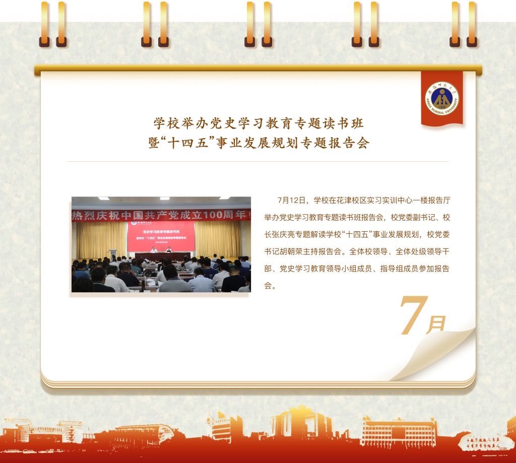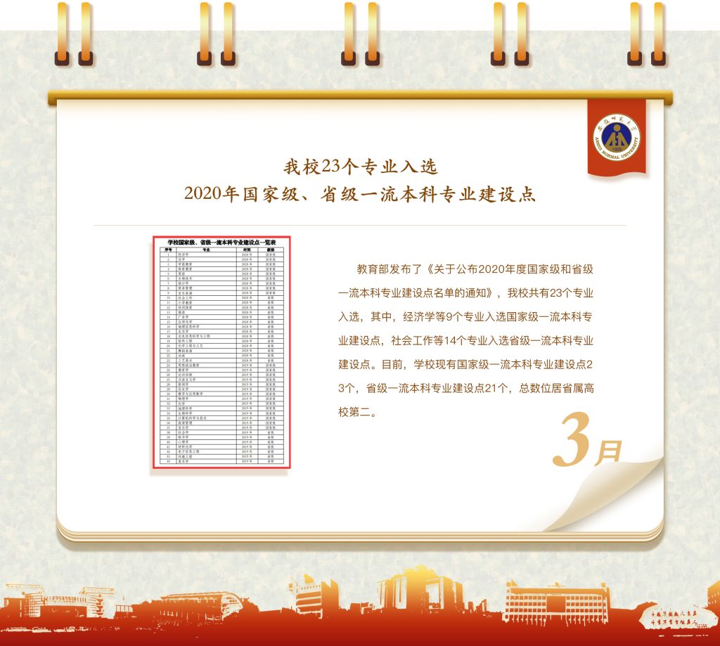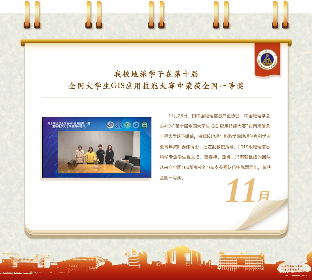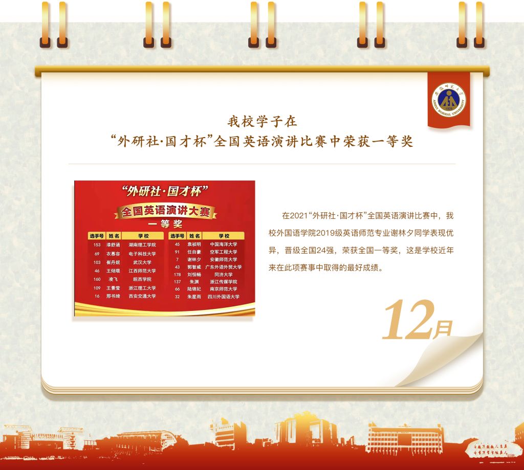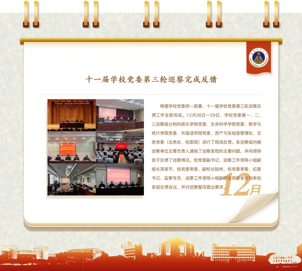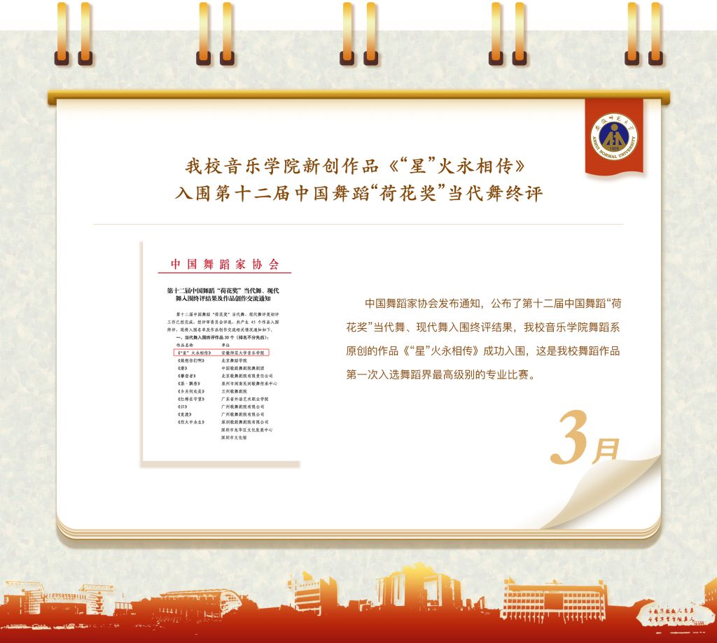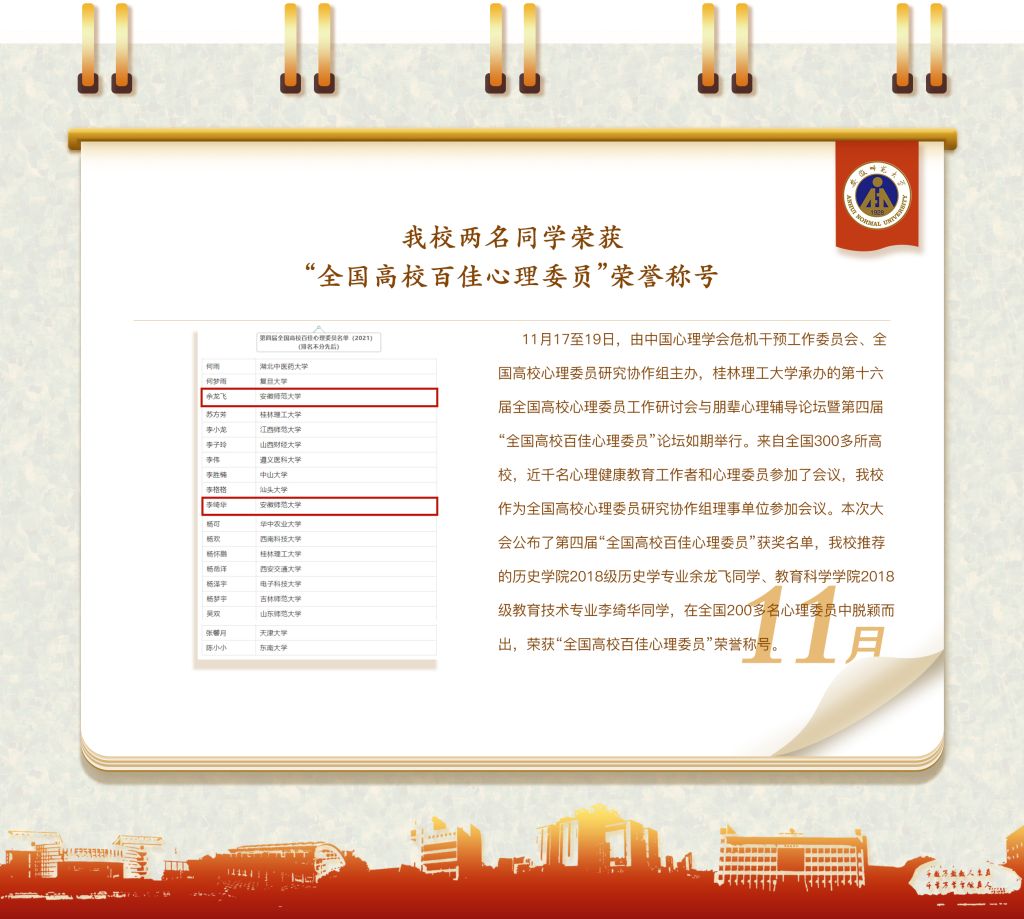 编者按 2021年是中国共产党成立100周年,是全面建设社会主义现代化国家新征程开启之年,也是“十四五”开局之年。这一年,党的十九届六中全会胜利召开,省第十一次党代会擘画安徽未来五年发展蓝图,校第九届教代会暨第七届工代会审议通过学校“十四五”事业发展规划……2021年,全体师大人凝心聚力、锐意进取,埋头苦干、勇毅前行,深入开展党史学习教育和“我为师生办实事”实践活动,加快推进高水平大学建设,在教学、科研、文化、服务等方面取得了丰硕成果。这一年,学校23个专业入选国家级、省级一流本科专业建设点,新增3个一级学科博士学位授权点、1个一级学科硕士学位授权点和6个硕士专业学位授权类别,我校学生工作被《人民日报》报道,路丙辉教授获评“全国优秀共产党员”并赴京参加庆祝中国共产党成立100周年有关活动,阮成武教授荣获“全国五一劳动奖章”,王春雨在东京奥运会上创造中国田径女子800米最好成绩,文科综合楼、教师教育实习实训中心等一大批新建筑顺利开工建设……一行行脚踏实地的足迹,印证了师大人干事创业的坚强定力;一次次永不止步的探索,书写了师大人追求卓越的强烈信念;一幅幅撸起袖子加油干的画面,诠释了师大人教书育人的初心和使命。