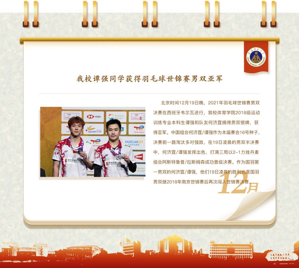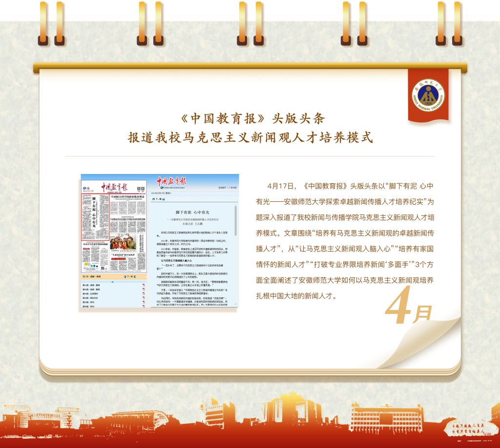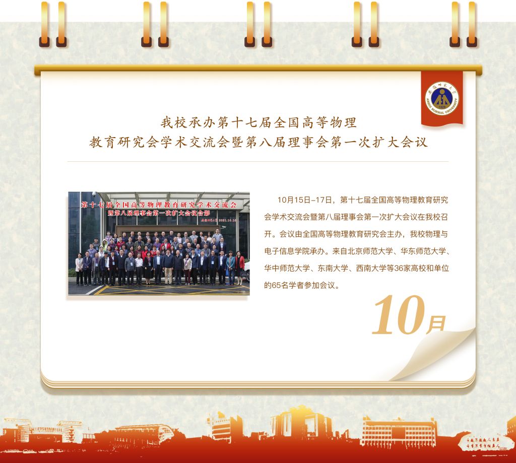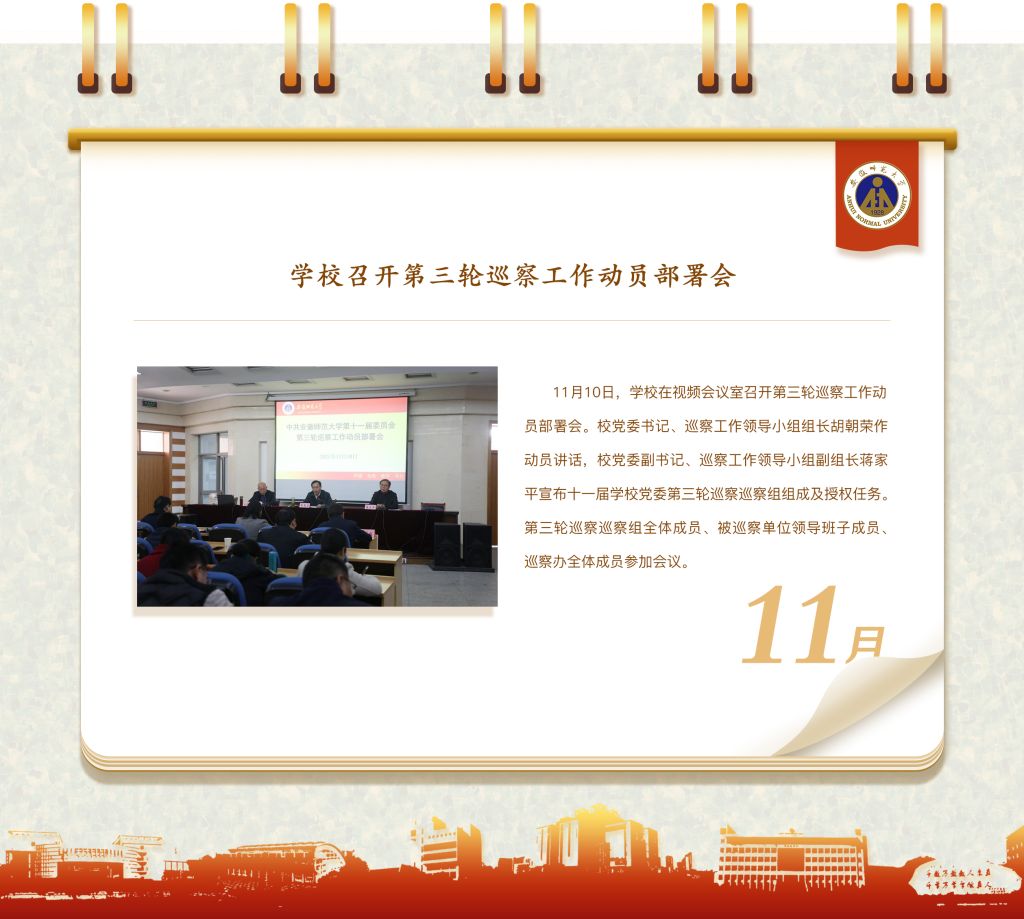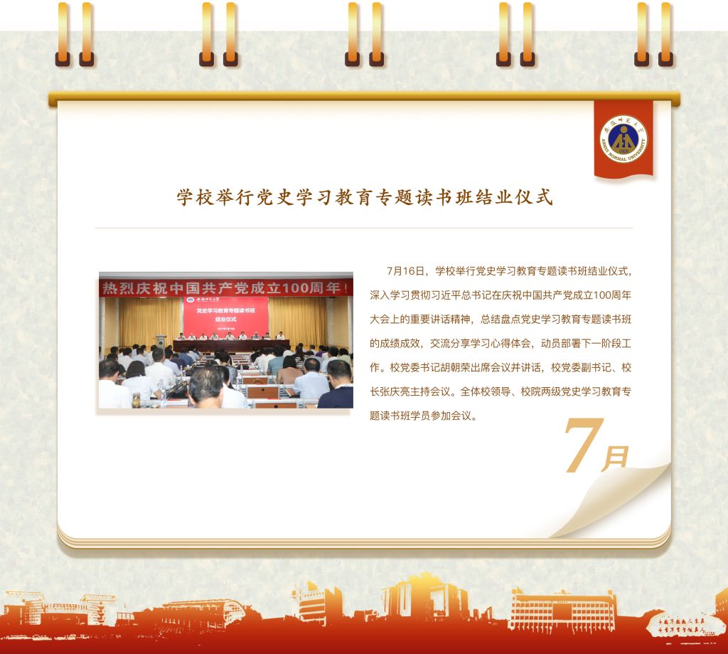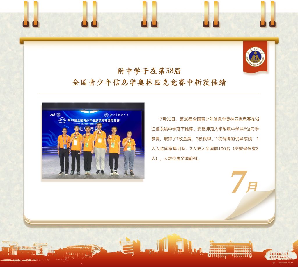 编者按 2021年是中国共产党成立100周年,是全面建设社会主义现代化国家新征程开启之年,也是“十四五”开局之年。这一年,党的十九届六中全会胜利召开,省第十一次党代会擘画安徽未来五年发展蓝图,校第九届教代会暨第七届工代会审议通过学校“十四五”事业发展规划……2021年,全体师大人凝心聚力、锐意进取,埋头苦干、勇毅前行,深入开展党史学习教育和“我为师生办实事”实践活动,加快推进高水平大学建设,在教学、科研、文化、服务等方面取得了丰硕成果。这一年,学校23个专业入选国家级、省级一流本科专业建设点,新增3个一级学科博士学位授权点、1个一级学科硕士学位授权点和6个硕士专业学位授权类别,我校学生工作被《人民日报》报道,路丙辉教授获评“全国优秀共产党员”并赴京参加庆祝中国共产党成立100周年有关活动,阮成武教授荣获“全国五一劳动奖章”,王春雨在东京奥运会上创造中国田径女子800米最好成绩,文科综合楼、教师教育实习实训中心等一大批新建筑顺利开工建设……一行行脚踏实地的足迹,印证了师大人干事创业的坚强定力;一次次永不止步的探索,书写了师大人追求卓越的强烈信念;一幅幅撸起袖子加油干的画面,诠释了师大人教书育人的初心和使命。