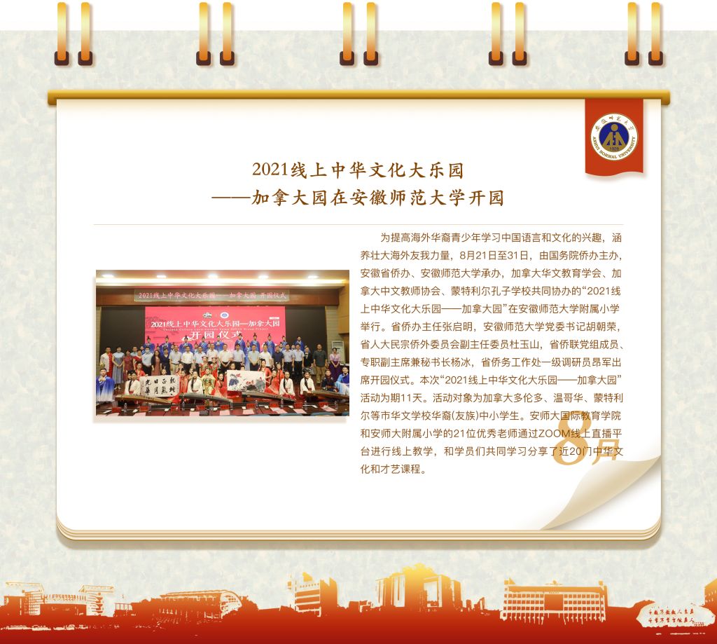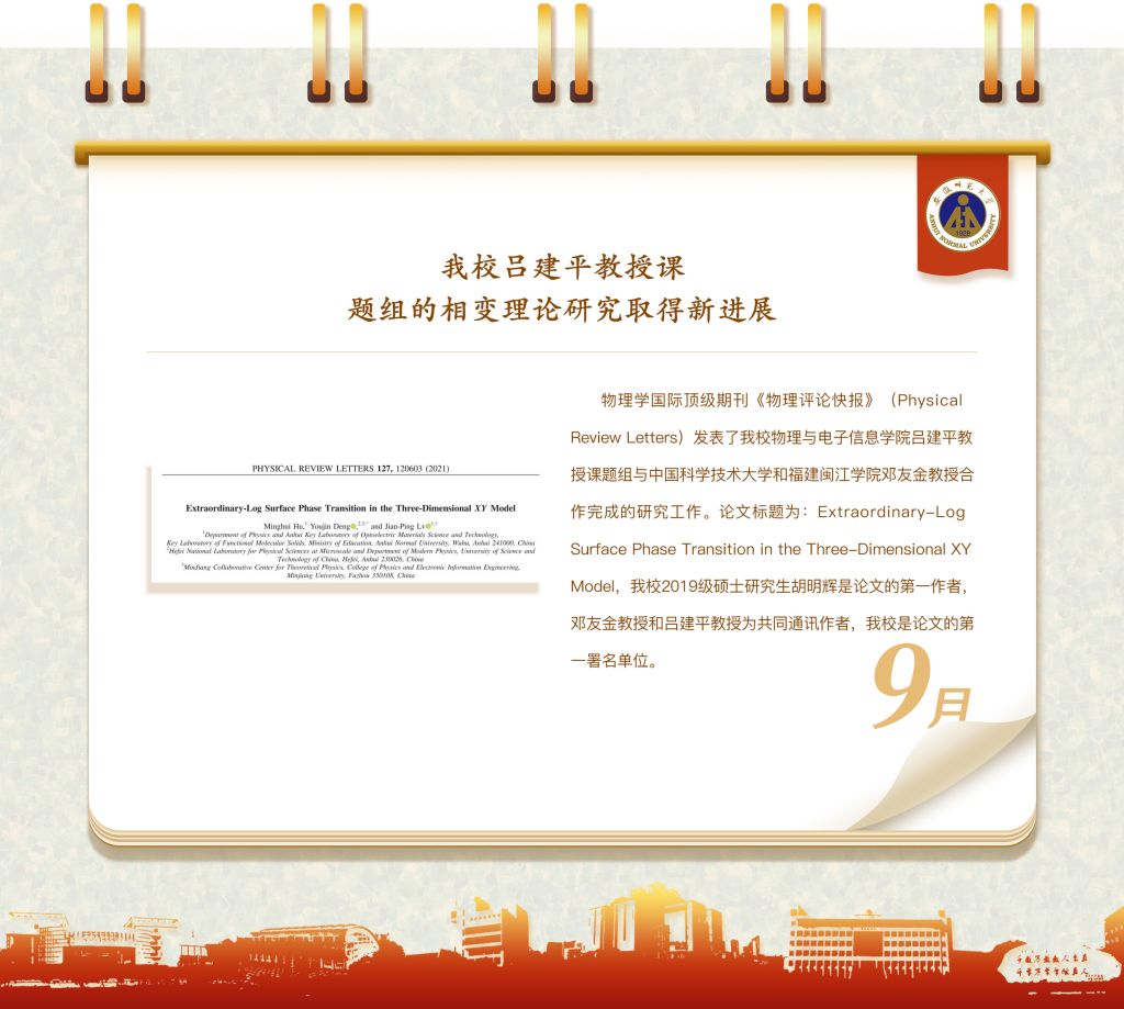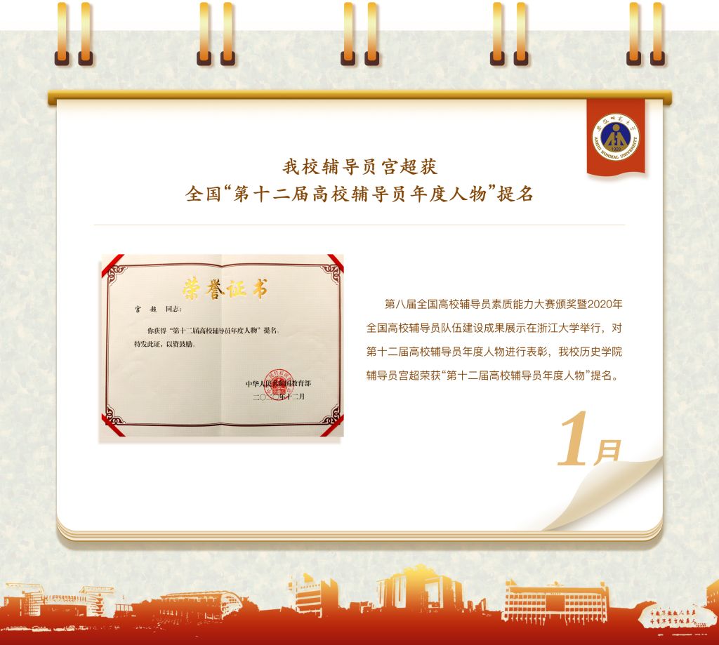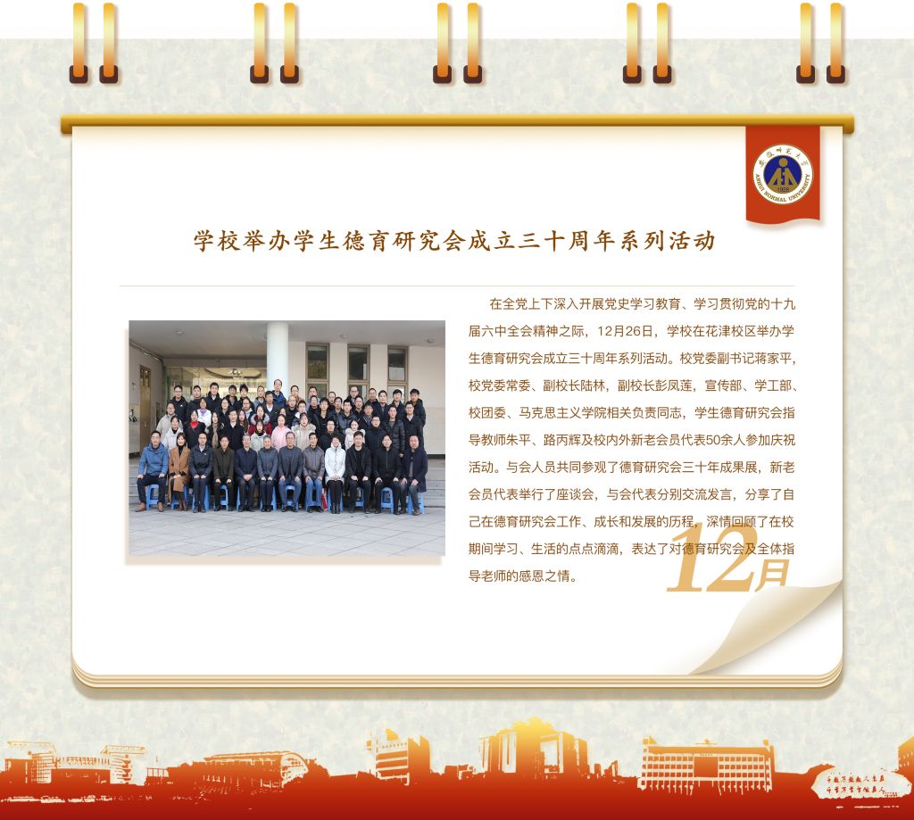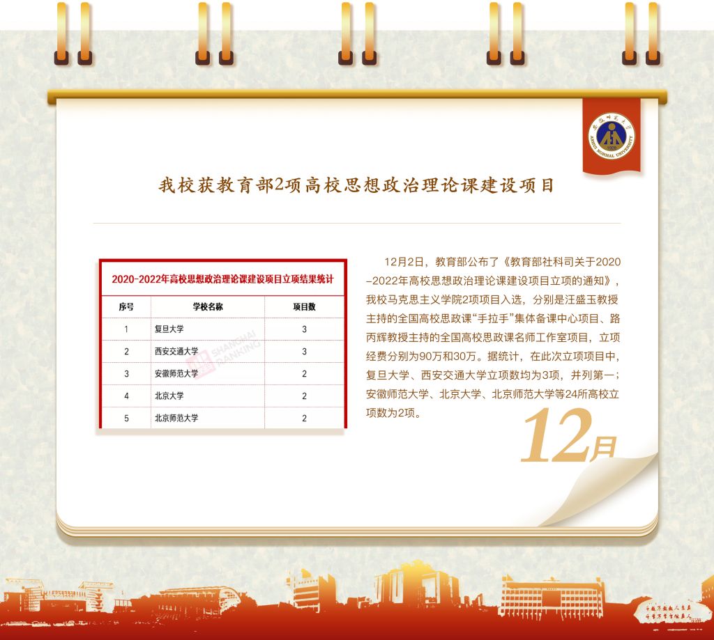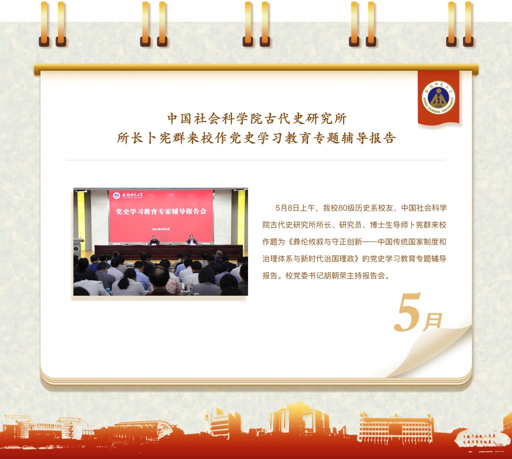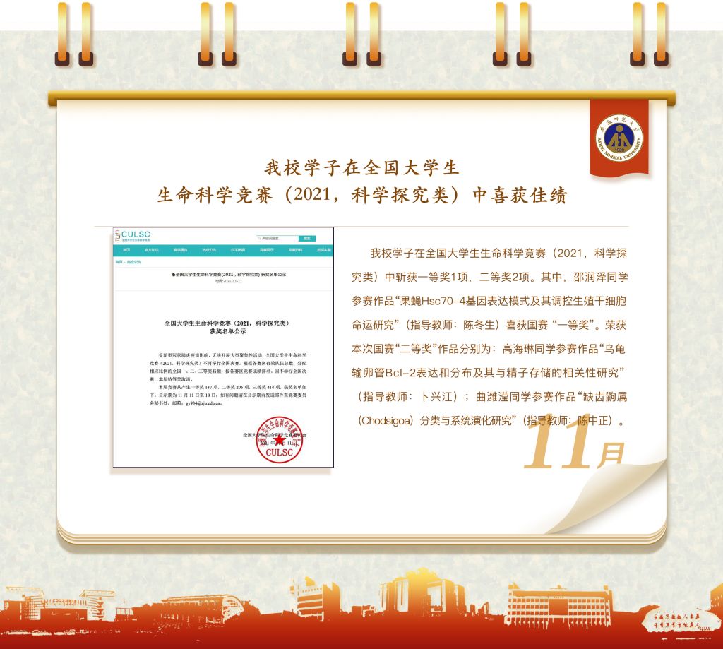 编者按 2021年是中国共产党成立100周年,是全面建设社会主义现代化国家新征程开启之年,也是“十四五”开局之年。这一年,党的十九届六中全会胜利召开,省第十一次党代会擘画安徽未来五年发展蓝图,校第九届教代会暨第七届工代会审议通过学校“十四五”事业发展规划……2021年,全体师大人凝心聚力、锐意进取,埋头苦干、勇毅前行,深入开展党史学习教育和“我为师生办实事”实践活动,加快推进高水平大学建设,在教学、科研、文化、服务等方面取得了丰硕成果。这一年,学校23个专业入选国家级、省级一流本科专业建设点,新增3个一级学科博士学位授权点、1个一级学科硕士学位授权点和6个硕士专业学位授权类别,我校学生工作被《人民日报》报道,路丙辉教授获评“全国优秀共产党员”并赴京参加庆祝中国共产党成立100周年有关活动,阮成武教授荣获“全国五一劳动奖章”,王春雨在东京奥运会上创造中国田径女子800米最好成绩,文科综合楼、教师教育实习实训中心等一大批新建筑顺利开工建设……一行行脚踏实地的足迹,印证了师大人干事创业的坚强定力;一次次永不止步的探索,书写了师大人追求卓越的强烈信念;一幅幅撸起袖子加油干的画面,诠释了师大人教书育人的初心和使命。