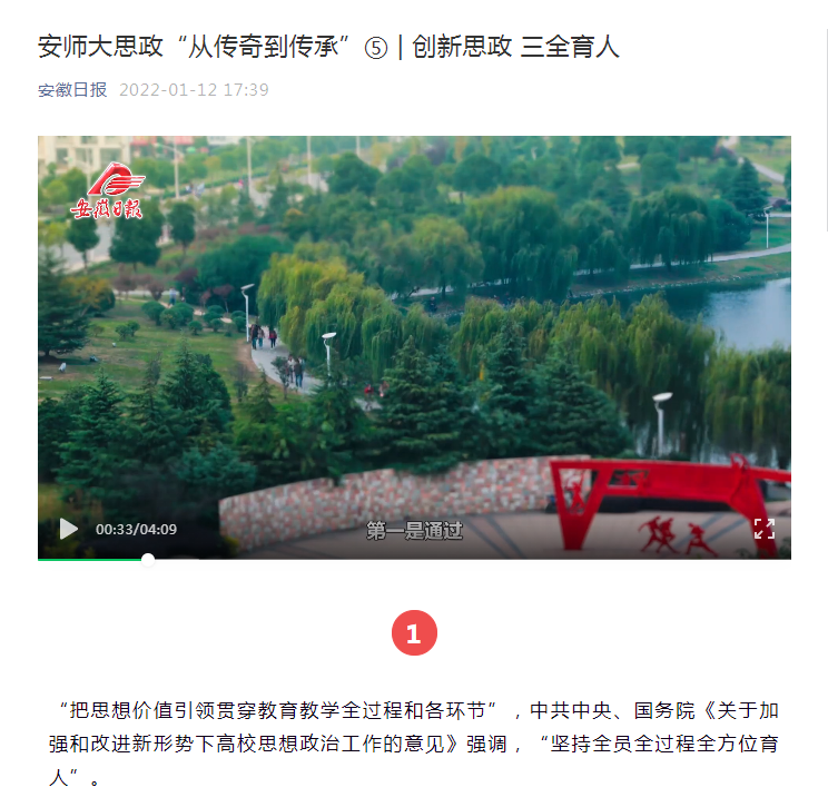 1月12日,《安徽日报》微信公众号推出我校思政育人工作系列融媒体作品第五期:安师大思政“从传奇到传承”⑤ | 创新思政 三全育人。文章指出,安徽师范大学以德育为先,一体推进思政课程与课程思政建设,打造“丙辉漫谈”“智慧思政”“青春思政课”等思政教育品牌,教育引导学生明大德、守公德、严私德。面对网络传播渠道迅速发展,要管好课堂、也管好课外,管好网下、也管好网上,既会“面对面”开展线下思政、又能“键对键”做好线上育人,增强网上教学吸引力、说服力、感染力,为党育人、为国育才。