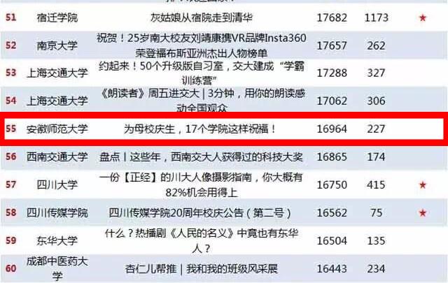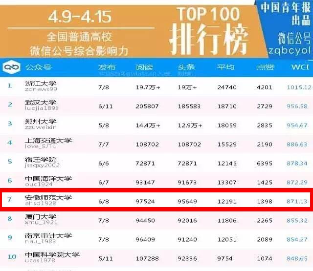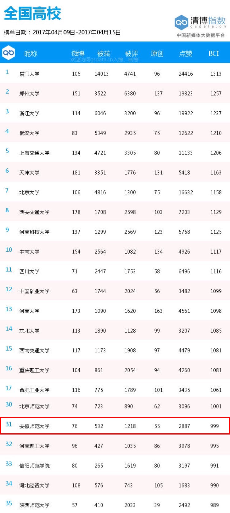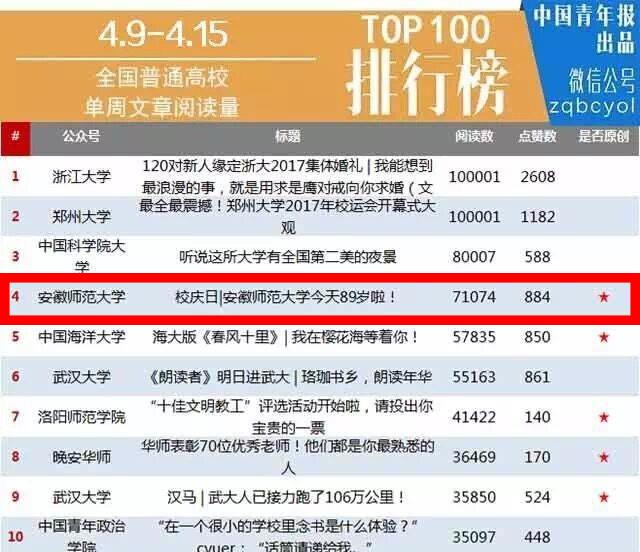 一直以来我校官方微信以的内容、创意的内容策划和接地气的位列省内前三名,仅次于中科大、合工大;3月初一篇师大版《成都》也是以3万3千多的阅读量挺进全国前30强,当周的总排行榜则位列全国45位。