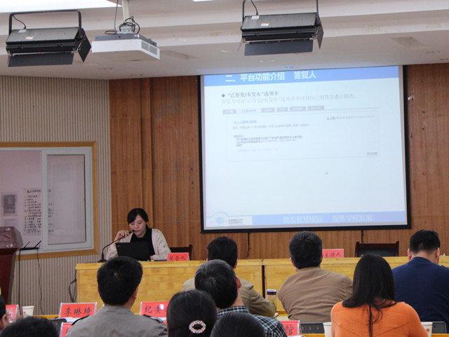 会上,学校办公室主任曾黎明从建设依据和背景、前期工作以及文本重点等方面对《安徽师范大学“学子心声”网络平台运行管理办法(试行)》进行了解读;信息管理中心周文洁老师通过ppt演示的方式,对平台使用进行了现场培训;与会人员还就平台的使用、管理等进行了互动交流。