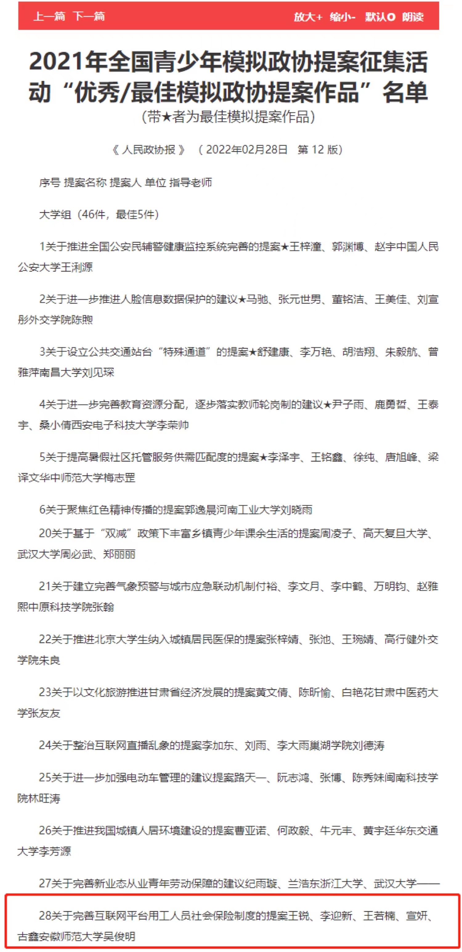 近日,2021年全国青少年模拟政协提案征集活动“优秀/最佳模拟政协提案作品”名单在《人民政协报》公布。由我校法学院吴俊明教授指导,王锐、王若楠、宣妍、李迎新、古鑫等5位同学申报的提案《关于完善互联网平台用工人员社会保险制度》获评“优秀模拟政协提案作品”。
