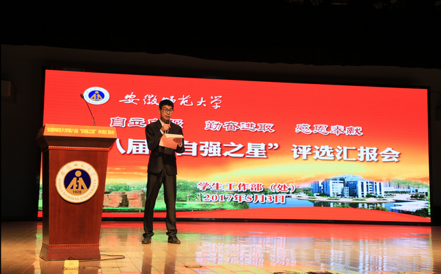 本网讯(学生工作处 项家春 学工助理 吴利亚 顾逸然)自强不息怀壮志以长行,厚德载物携梦想而抚凌。5月3日下午,校第八届“自强之星”评选汇报会在花津校区大礼堂隆重举行。我校“爱心助学”单位代表杨燕制药有限责任公司总经理李钦国、国元证券党办李东宇、芜湖卷烟厂办公室秘书吕慧、校教育基金会理事长沈洪,校党委副书记李琳琦及评选委员会全体成员,各学院党委副书记、专业负责人代表、辅导员代表和贫困学生代表等800余人参加评选汇报会。评选汇报会由2016年“中国大学生自强之星”、第十二届“中国大学生年度人物”提名奖、校第七届“自强之星”获得者,2014级数学与应用数学专业汪健同学主持。