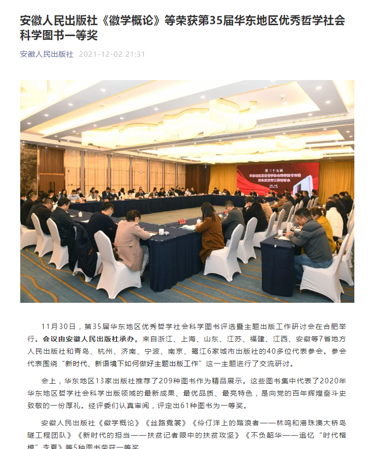 近日,由安徽人民出版社承办的第35届华东地区优秀哲学社会科学图书评选暨主题出版工作研讨会在合肥举行,来自华东地区13家出版社的40多位代表围绕“新时代、新语境下如何做好主题出版工作”进行交流研讨,并评选出一批精品图书代表2020年华东地区哲学社会科学出版领域的最新成果、最优品质和最亮特色。我校历史学院王世华教授主编的《徽学概论》(安徽人民出版社2020版)荣获一等奖。